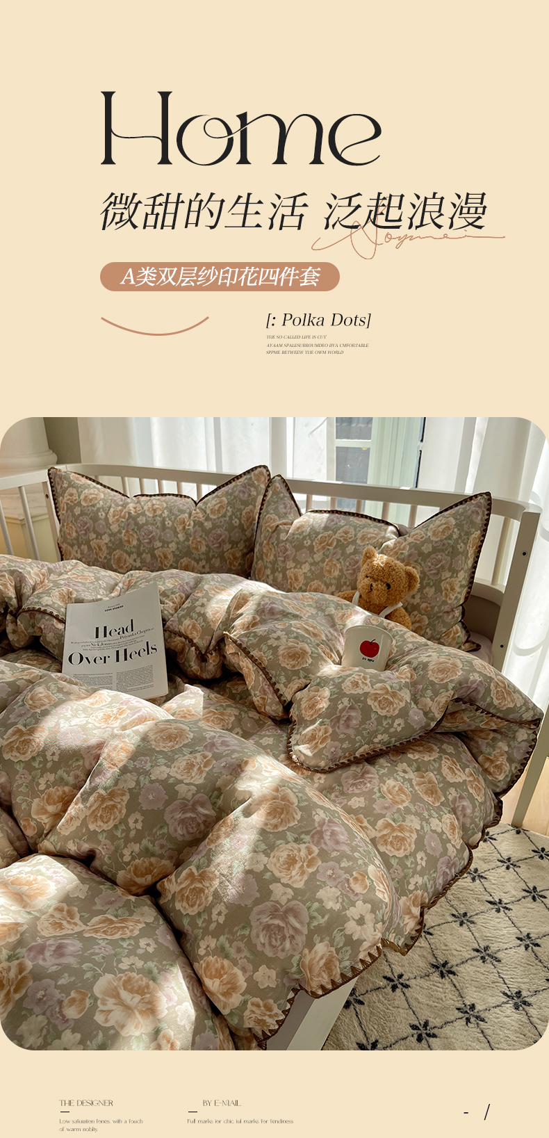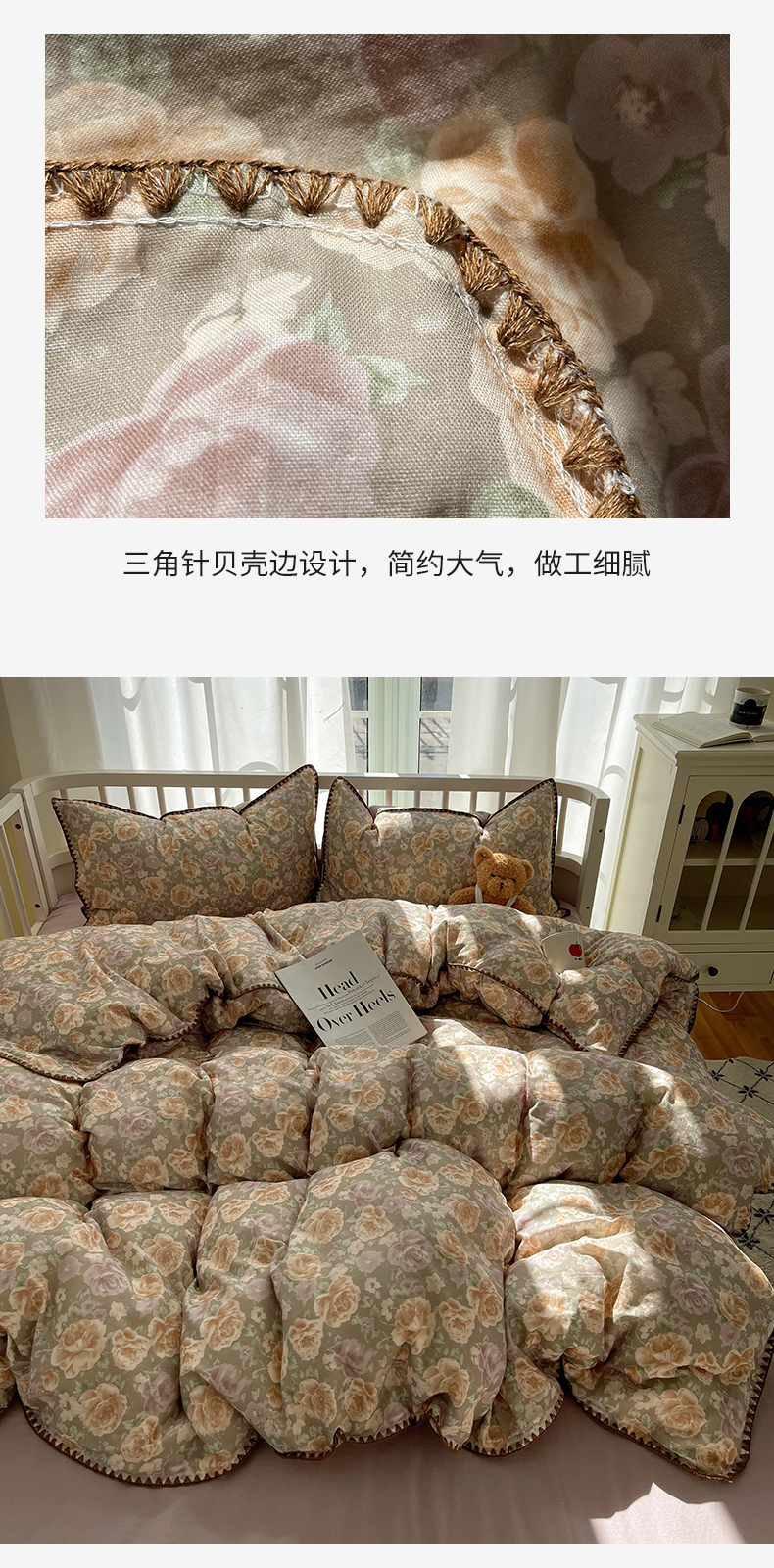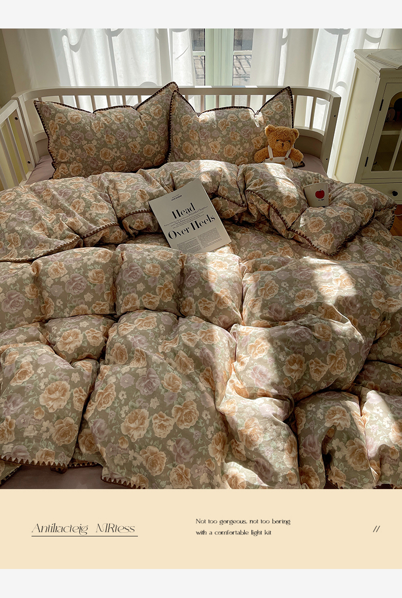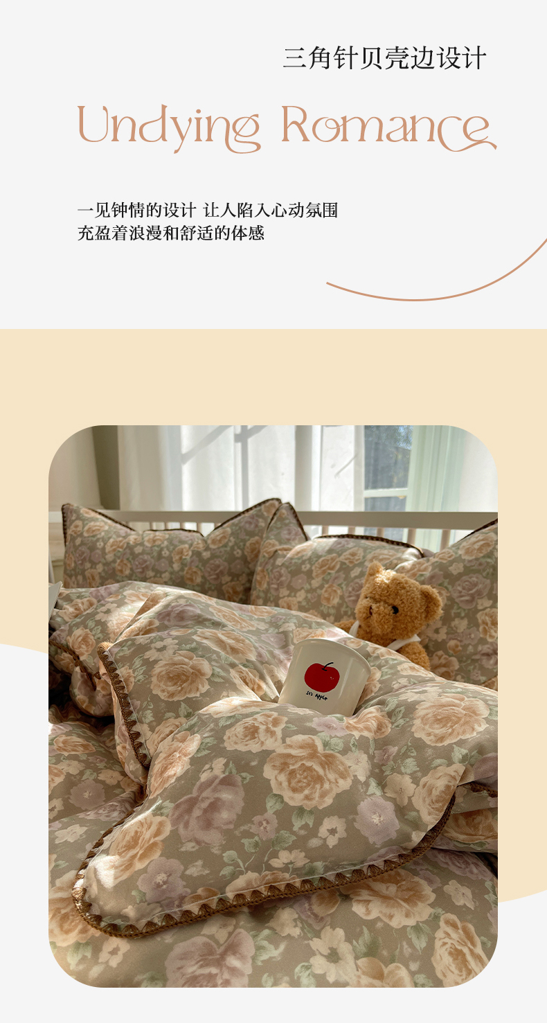 (总)三朵家纺 2026新款A类云柔水洗棉韩版法式花边云朵棉四件套,春夕集,罗逸维绿,如漫,惜花灰绿,赫拉