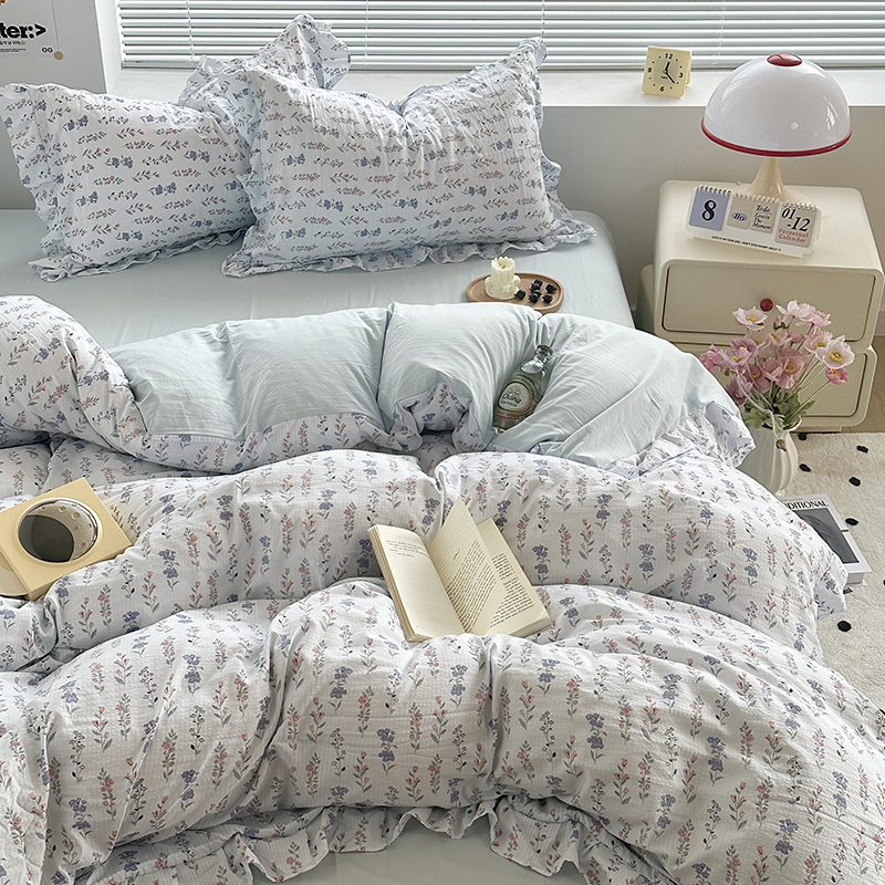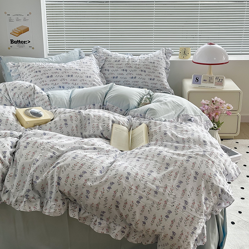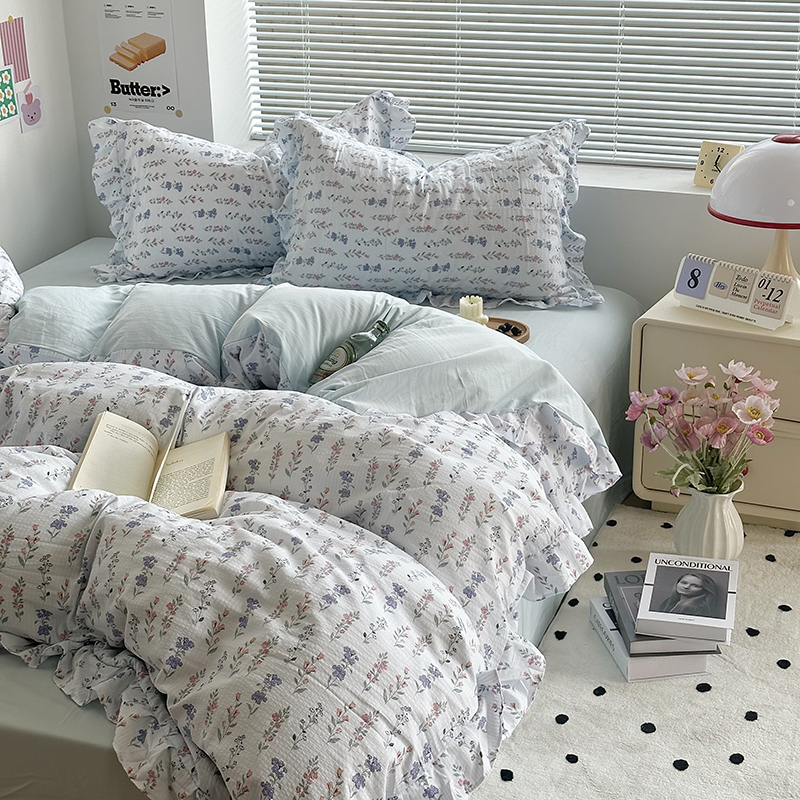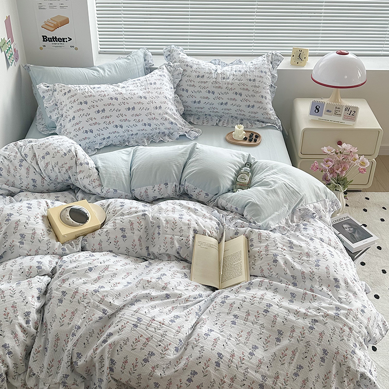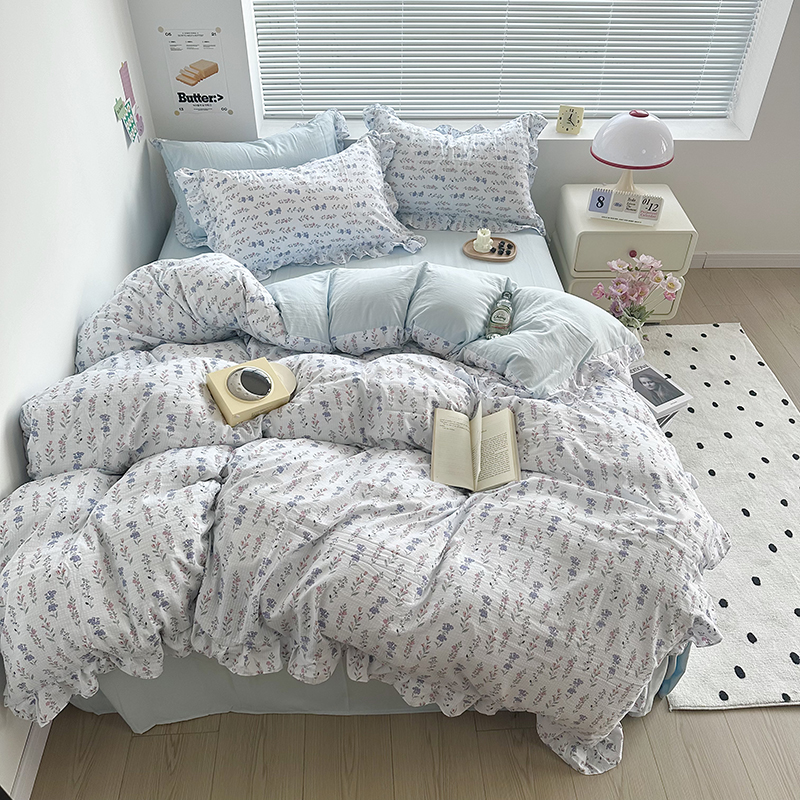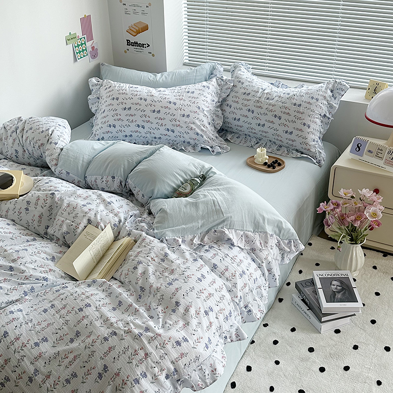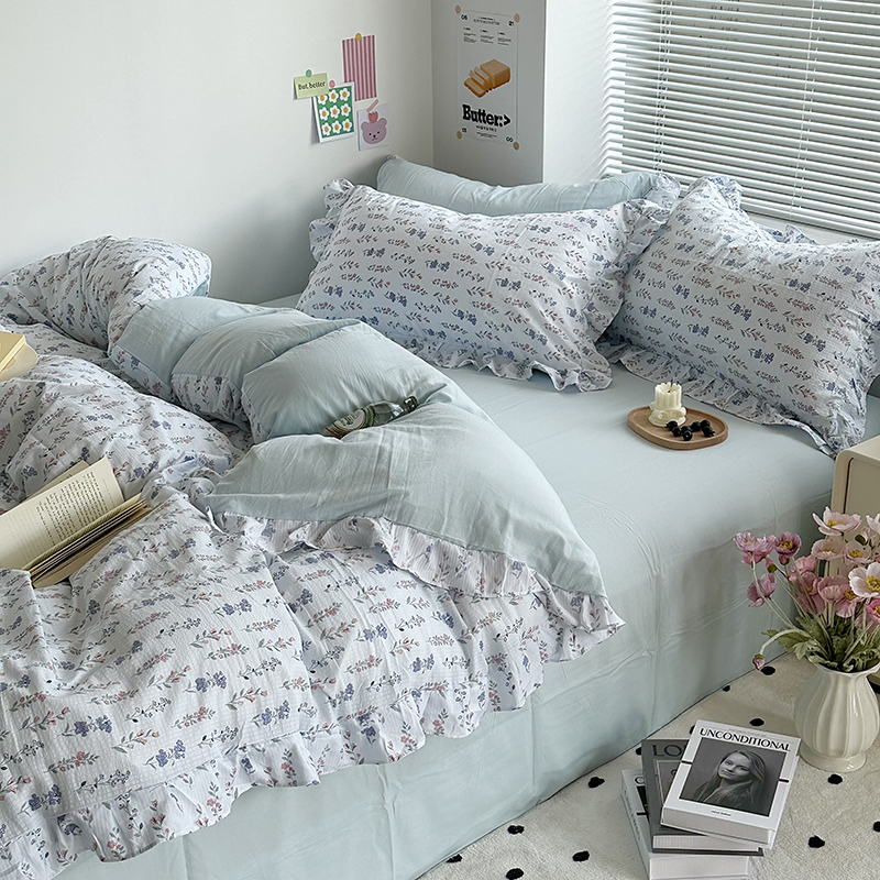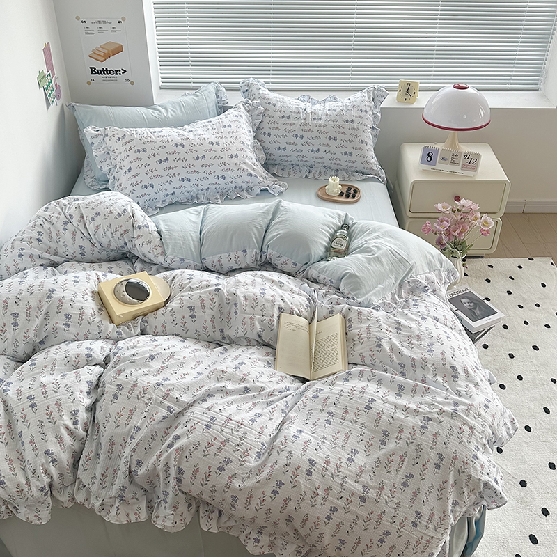 当前位置: 91家纺网 > 商品网购 > 床品套件 > 四件套 > 全棉普通四件套 > 希丞家居 2025新款花卉泡泡纱花边四件套 花青