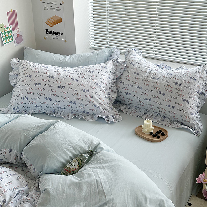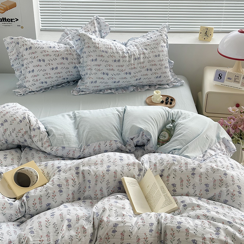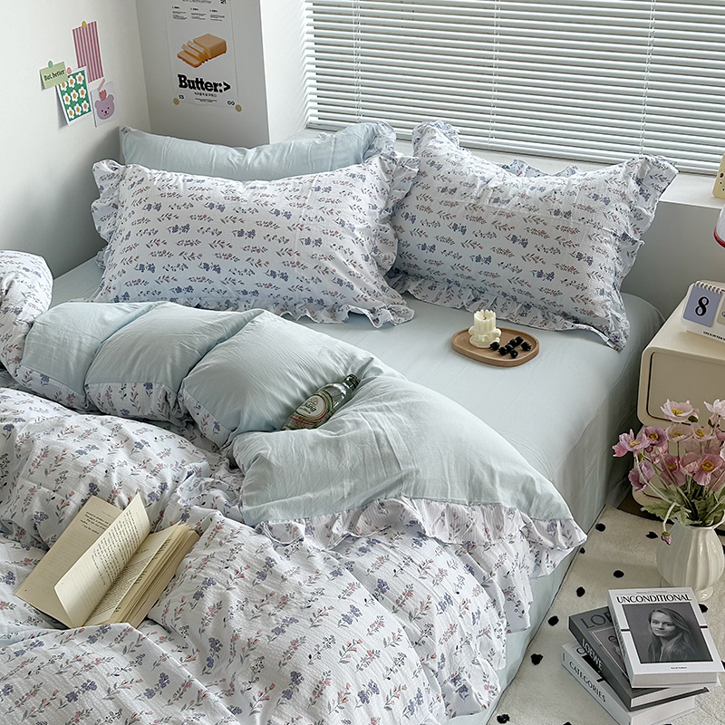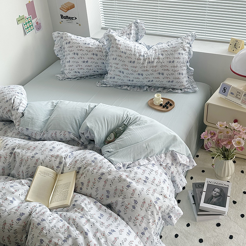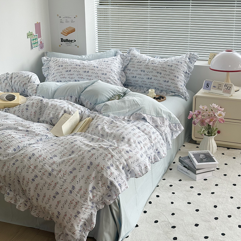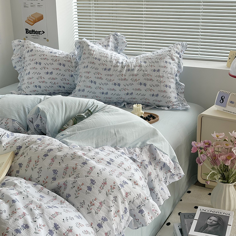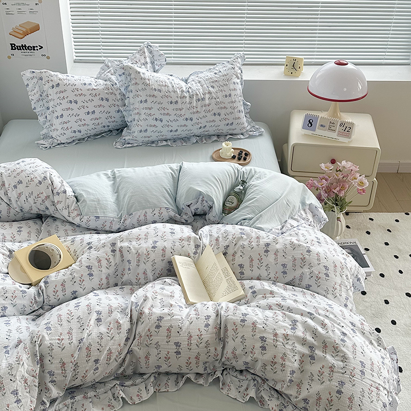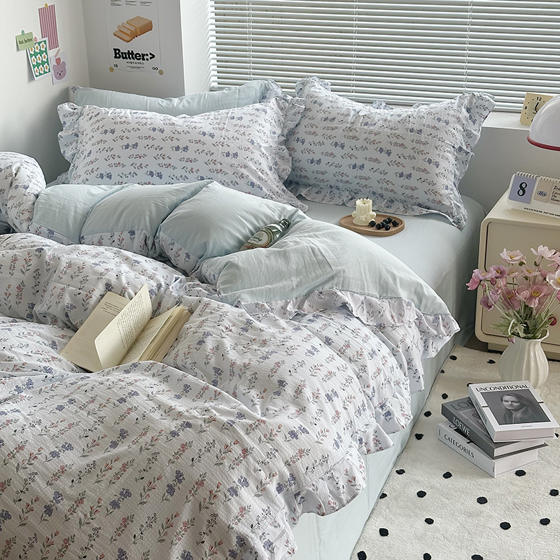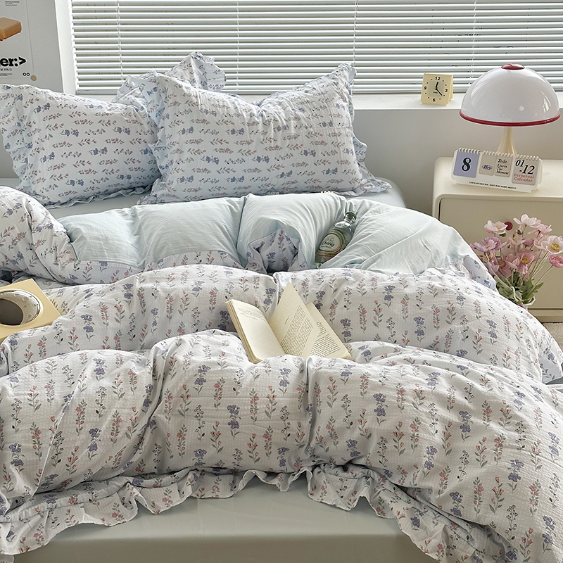当前位置: 91家纺网 > 商品网购 > 床品套件 > 四件套 > 全棉普通四件套 > 希丞家居 2025新款花卉泡泡纱花边四件套 花青