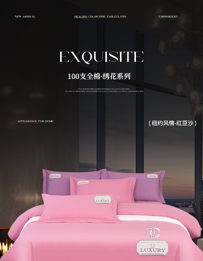 浩情国际婚庆供货中心 2026新品春夏四季款全棉纯棉高端绣花四件套-纽约风情 纽约风情-红豆沙