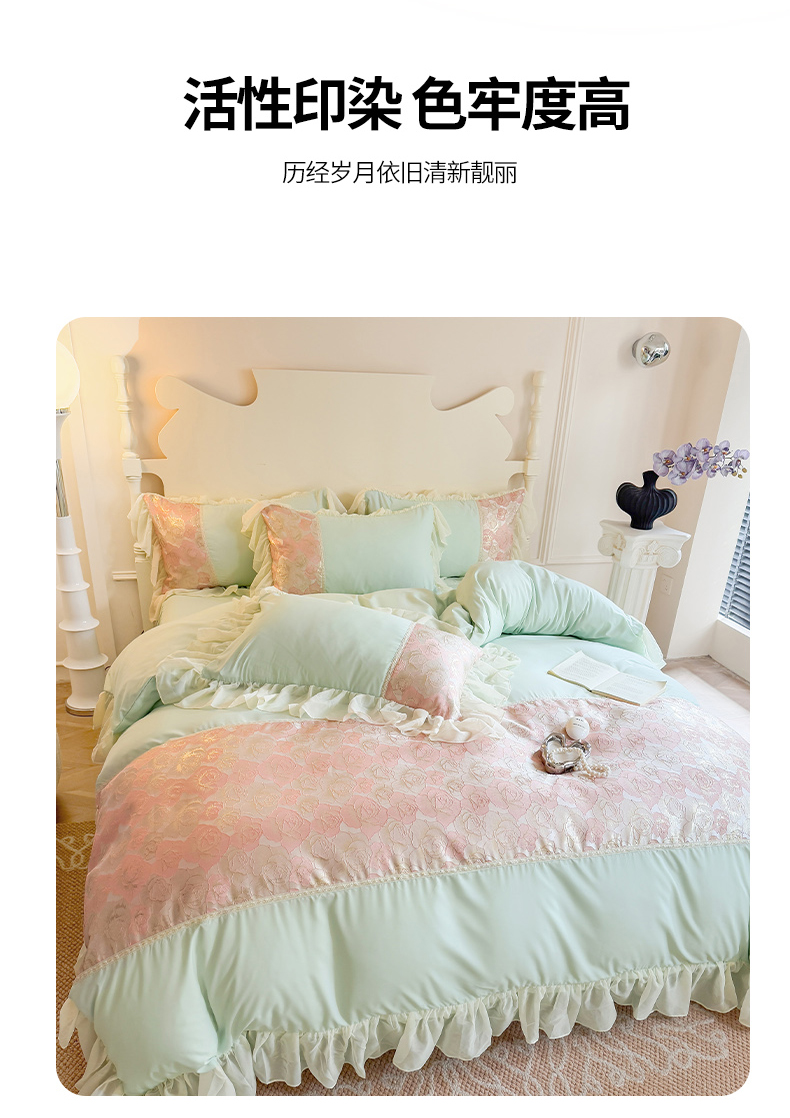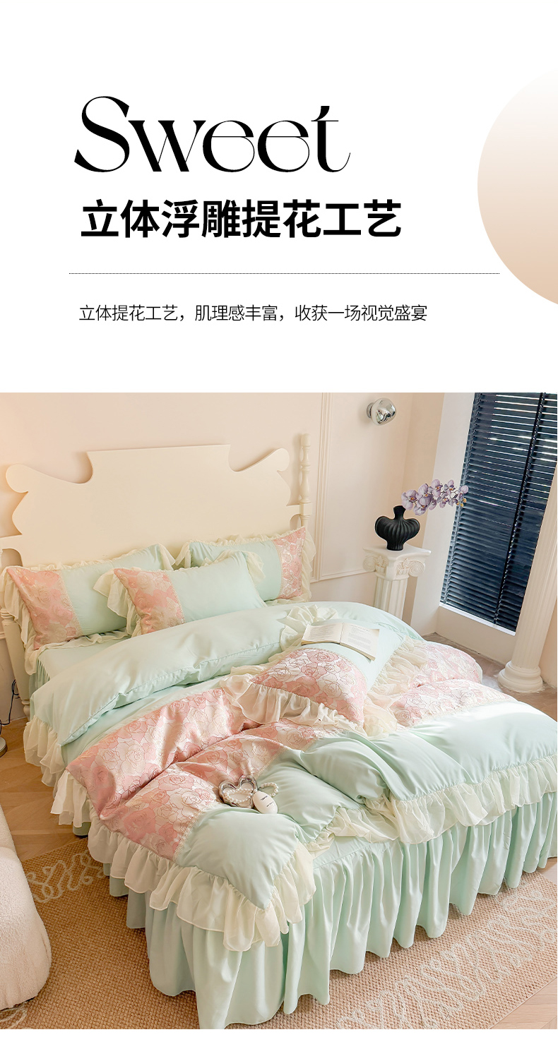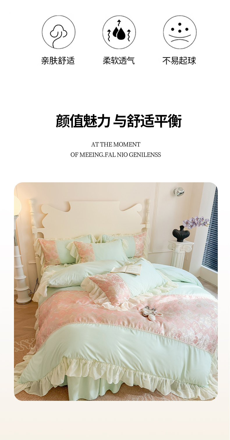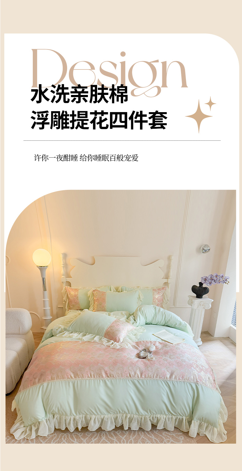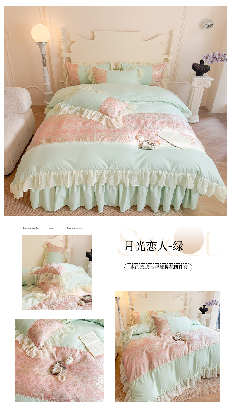 当前位置: 91家纺网 > 商品网购 > 床品套件 > 四件套 > 全棉普通四件套 > 富盛 2025新款水洗亲肤棉浮雕提花公主风四件套 月光恋人-绿