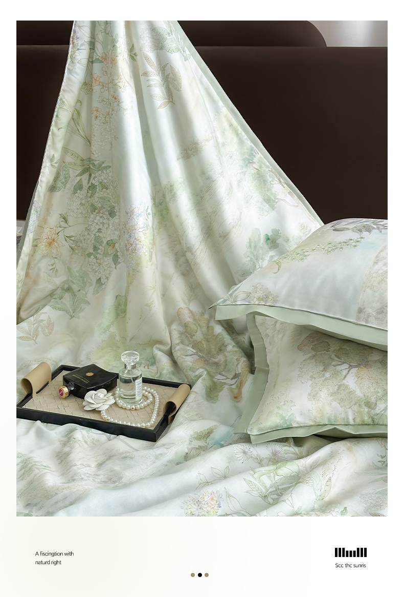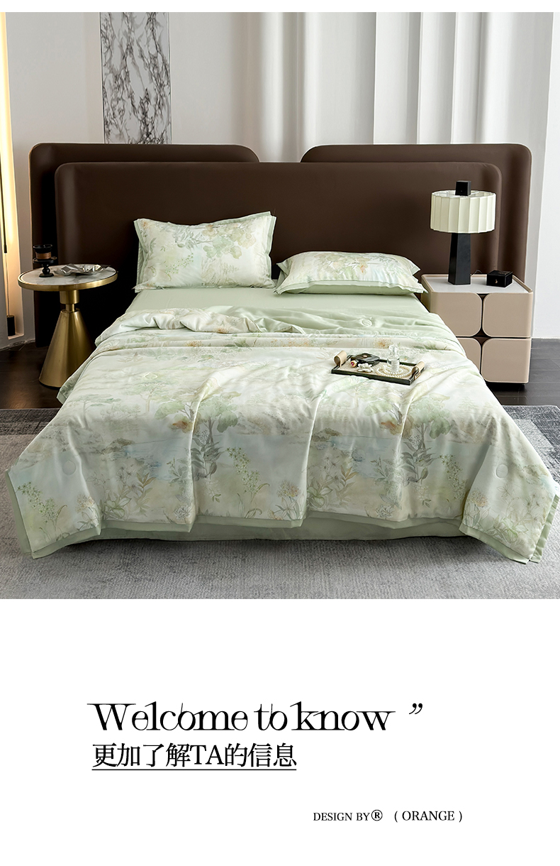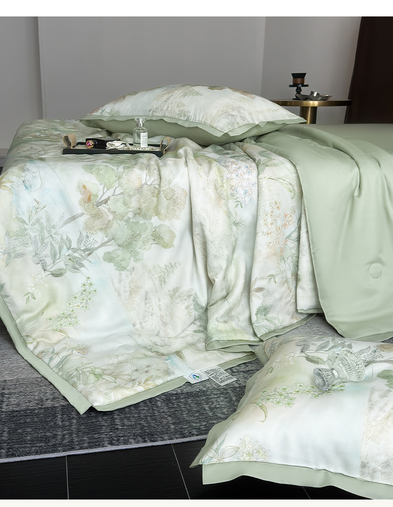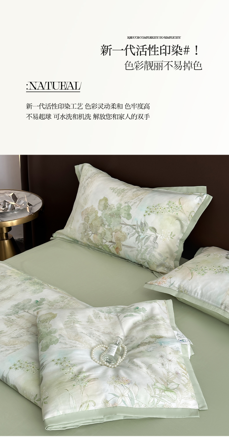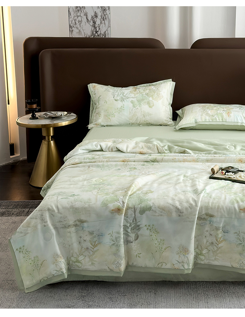 当前位置: 91家纺网 > 商品网购 > 床品套件 > 四件套 > 夏被四件套 > 莱登卡奴 25新款A类50支100%莱赛尔天丝数码印花夏被四件套 远山黛悠然绿