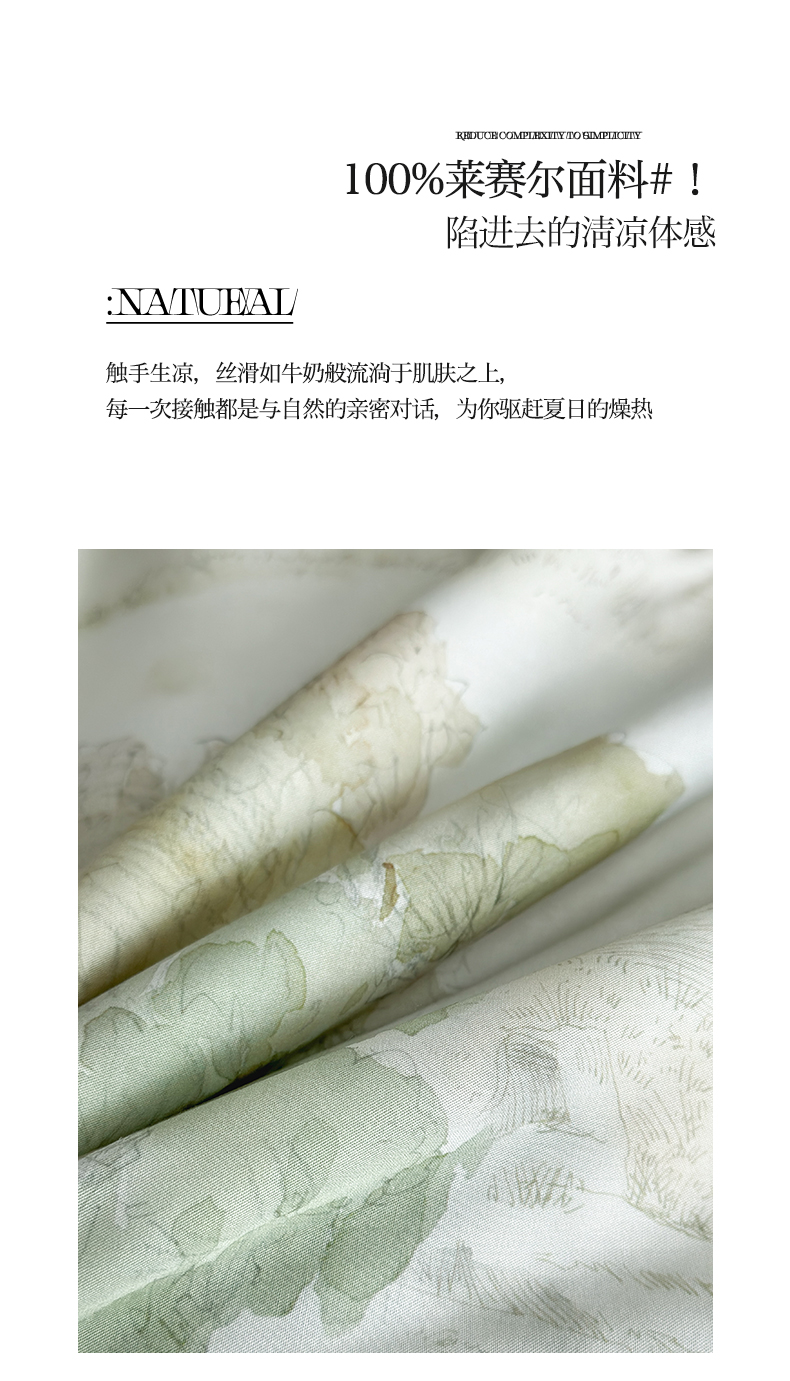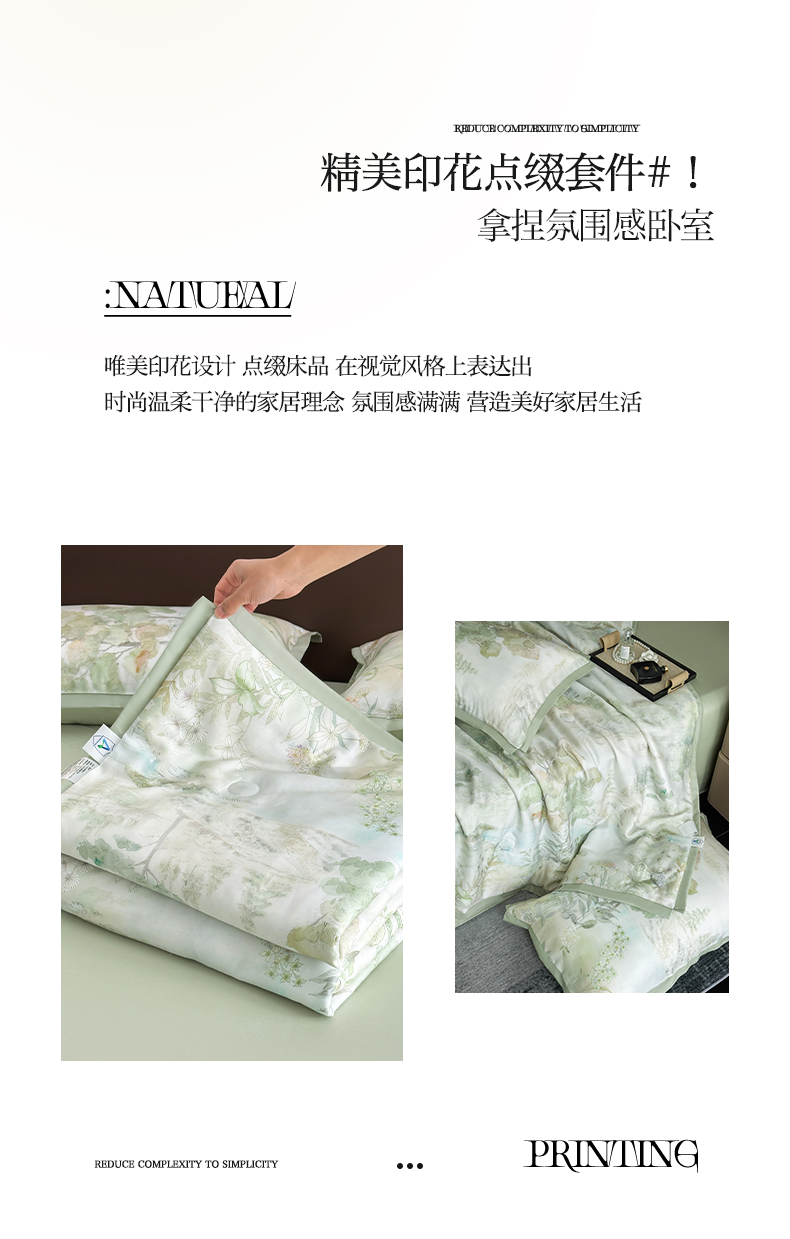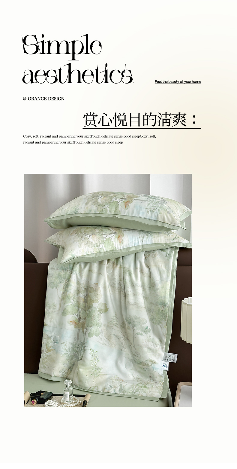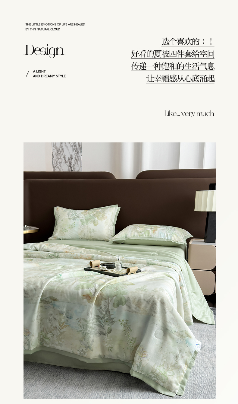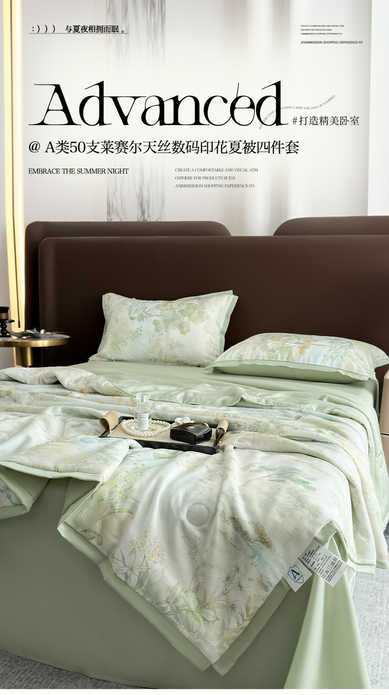 当前位置: 91家纺网 > 商品网购 > 床品套件 > 四件套 > 夏被四件套 > 莱登卡奴 25新款A类50支100%莱赛尔天丝数码印花夏被四件套 远山黛悠然绿