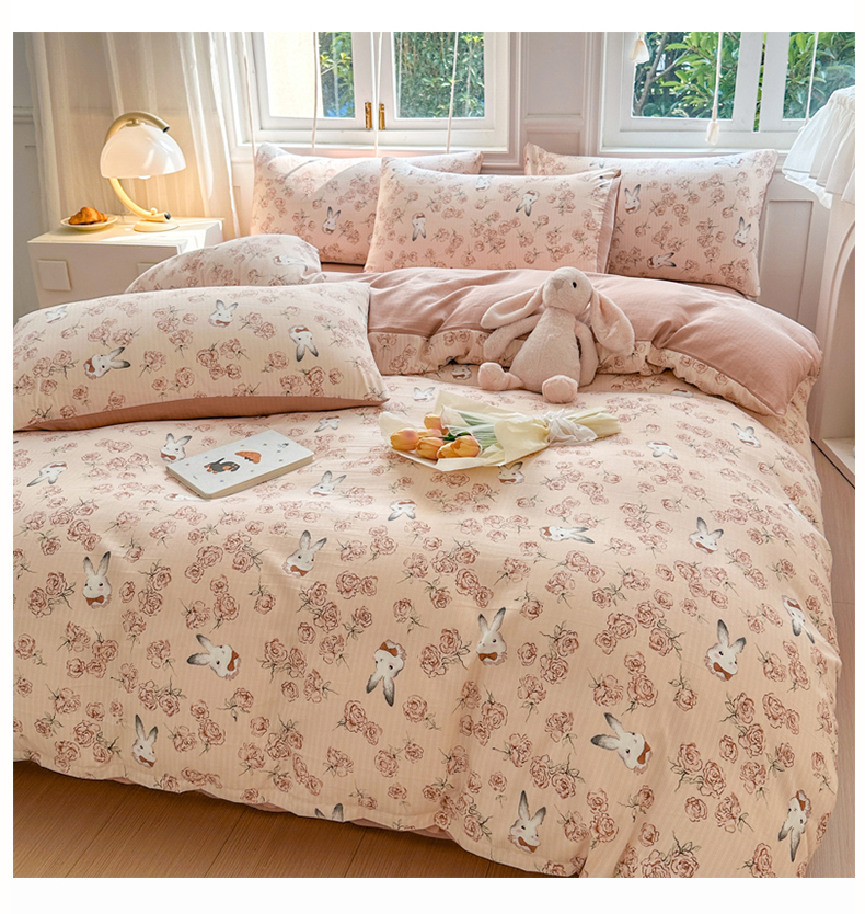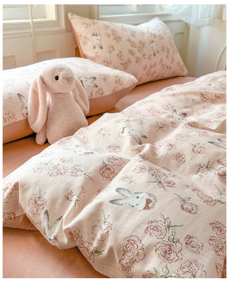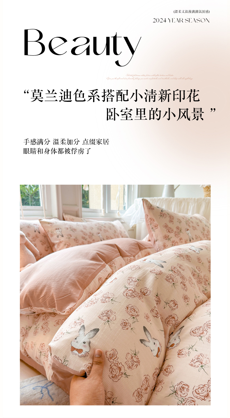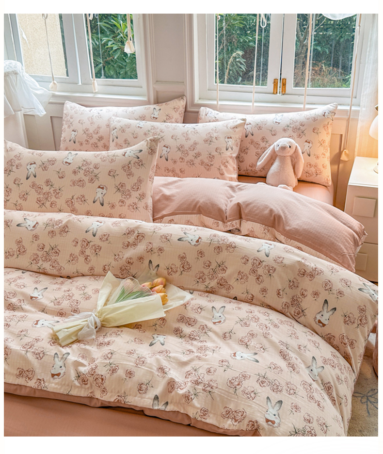 当前位置: 91家纺网 > 商品网购 > 床品套件 > 四件套 > 其它四件套 > 晚爱家纺(原晚安家居) 2025新款A类双层纱有氧提花彩竺棉小竺棉四件套花与兔