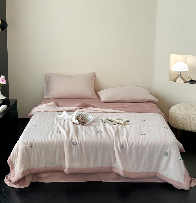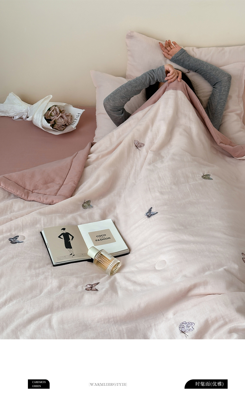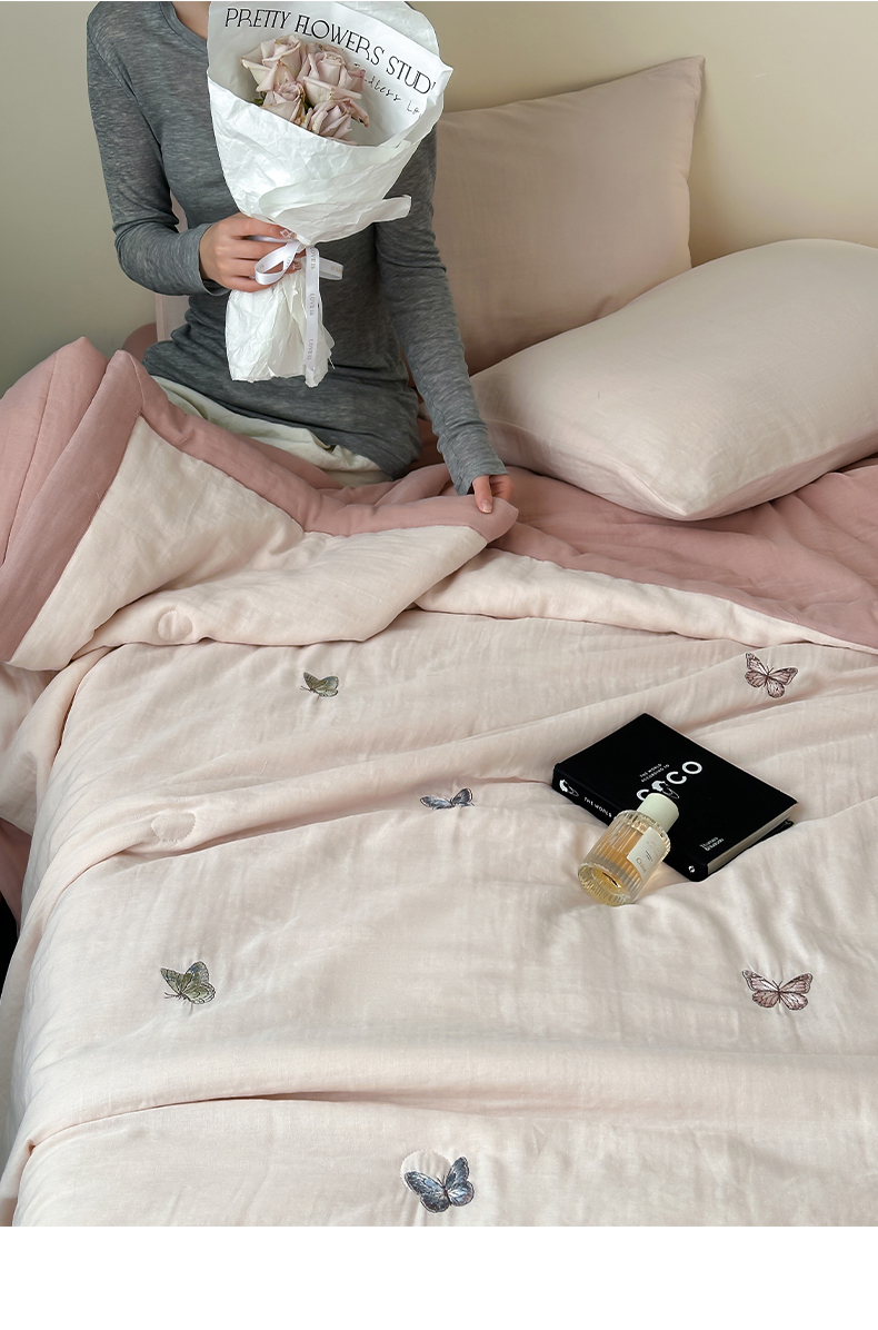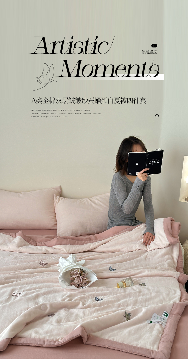 当前位置: 91家纺网 > 商品网购 > 床品套件 > 四件套 > 夏被四件套 > 一加一 2025新款A类全棉双层皱皱纱蚕蛹蛋白夏被四件套(蝶梦系列) 蝶梦-粉豆沙