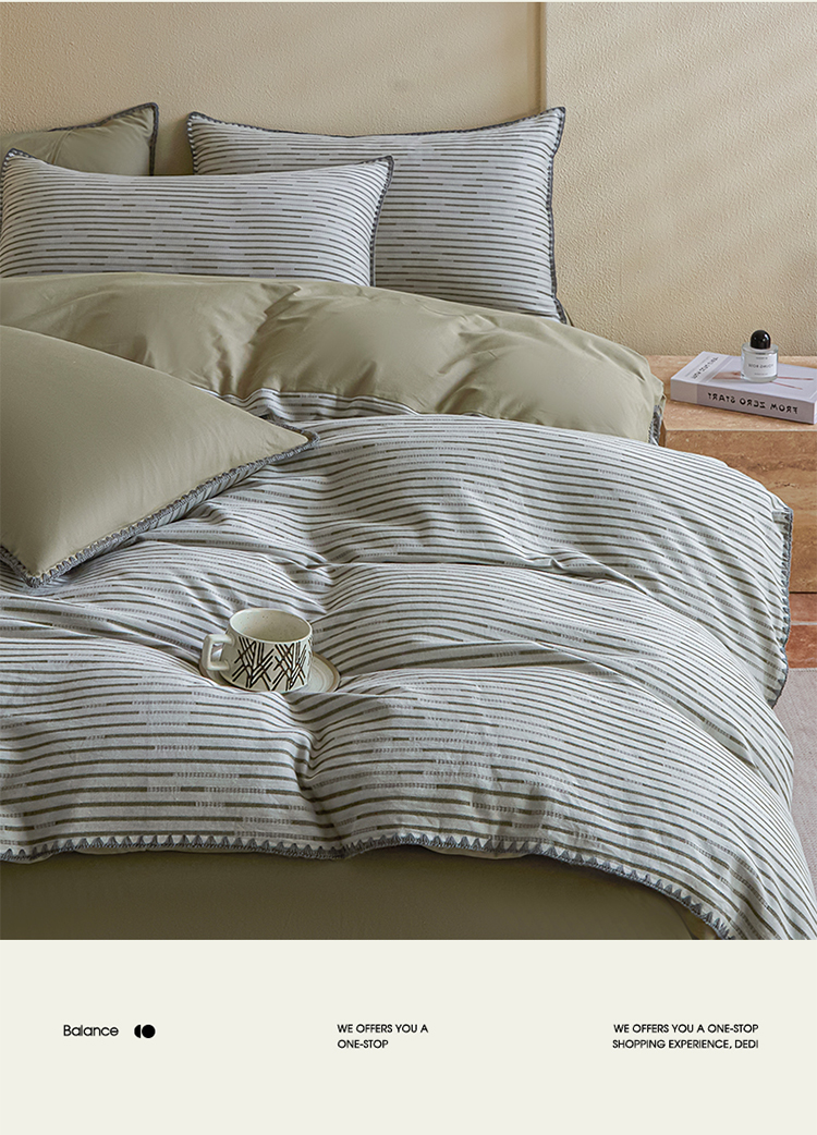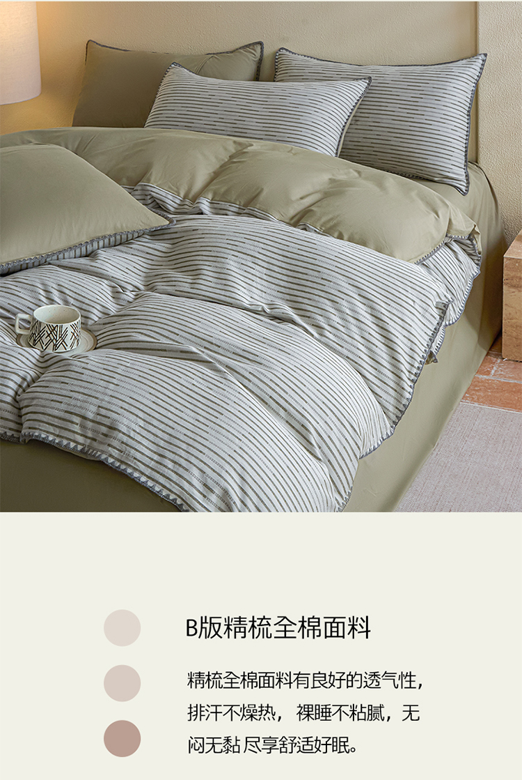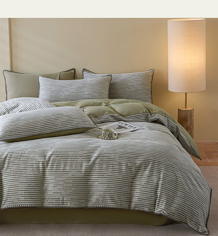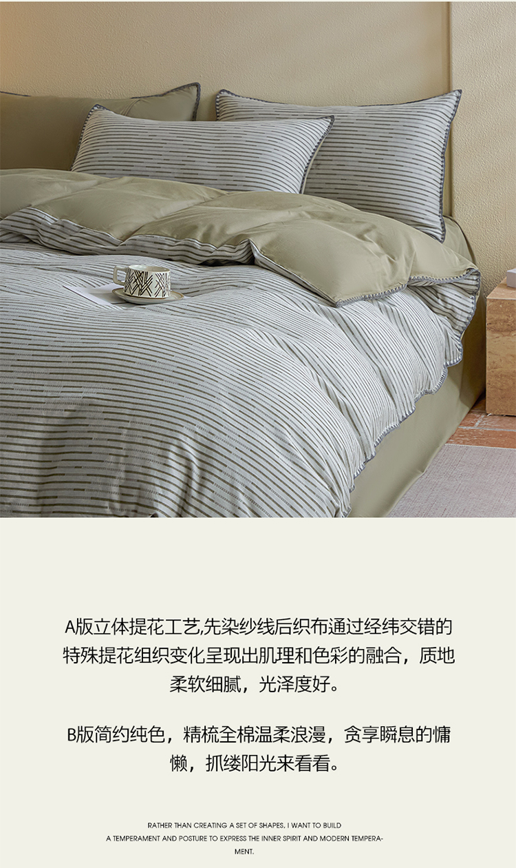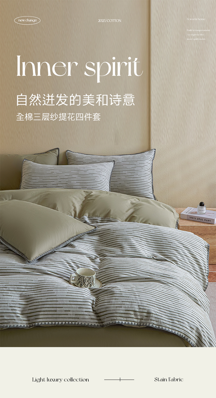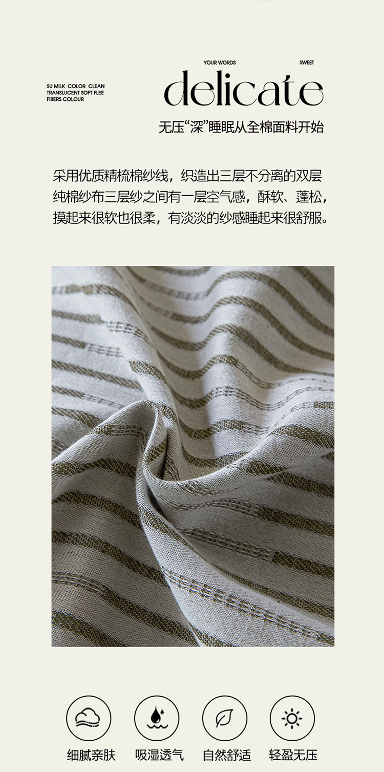 商品名称:2025新款亲肤全棉三层纱提花四件套 韵律-黛绿