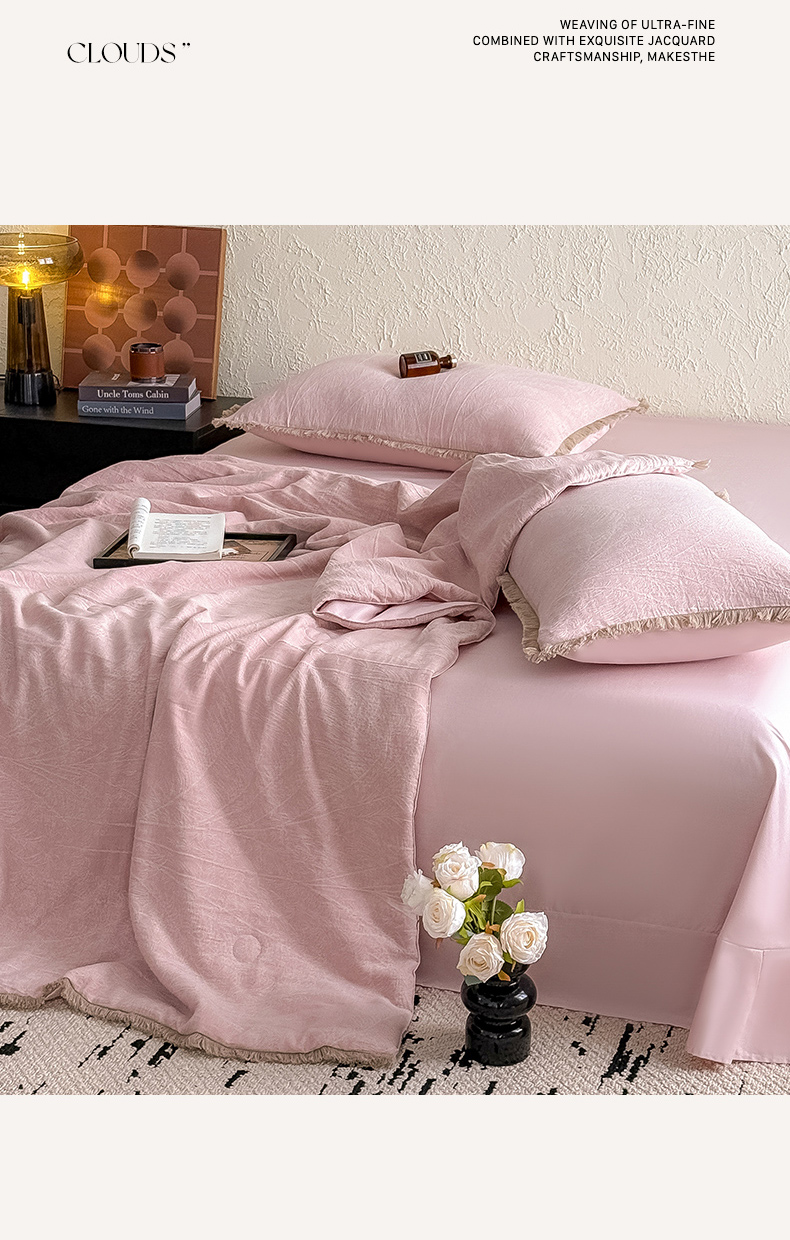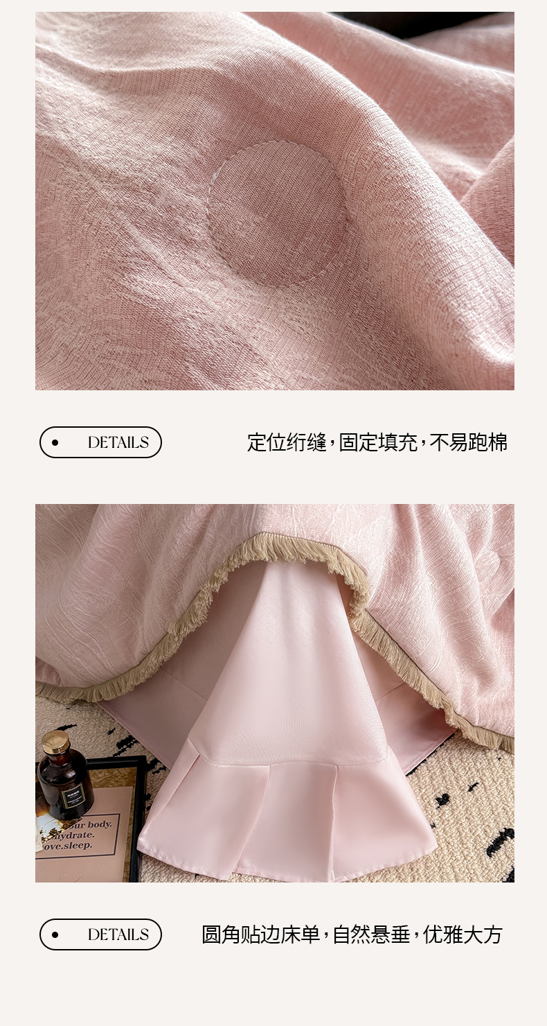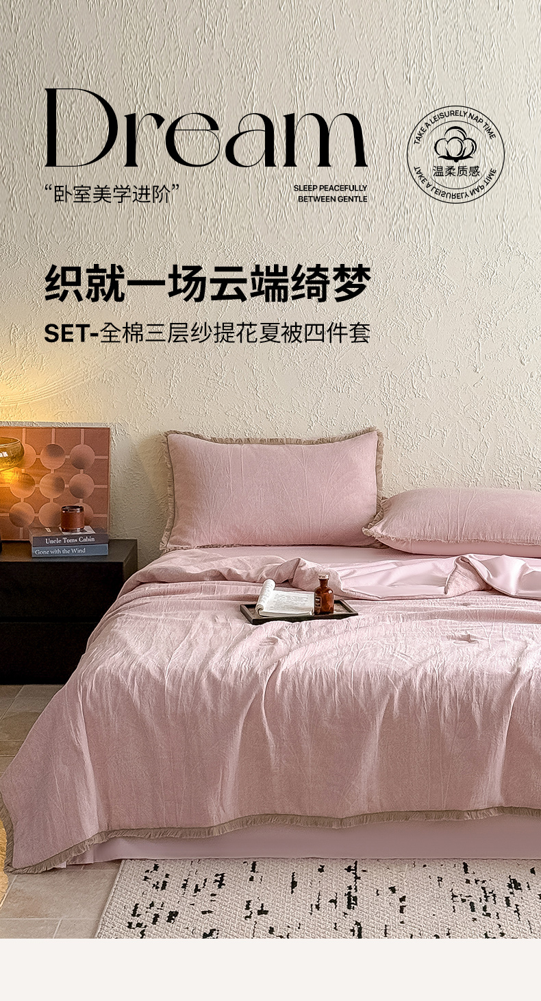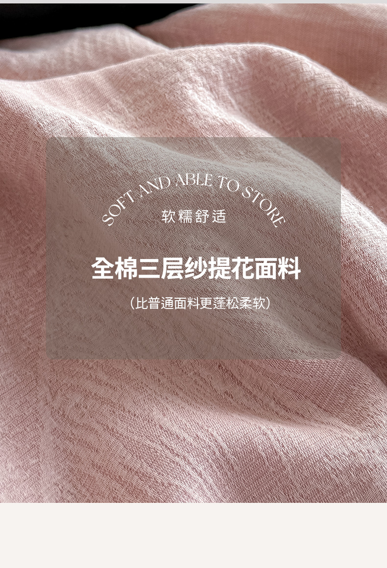 当前位置: 91家纺网 > 商品网购 > 床品套件 > 四件套 > 全棉活性四件套 > 2025新款全棉三层纱提花夏被四件套 竹影-柔粉