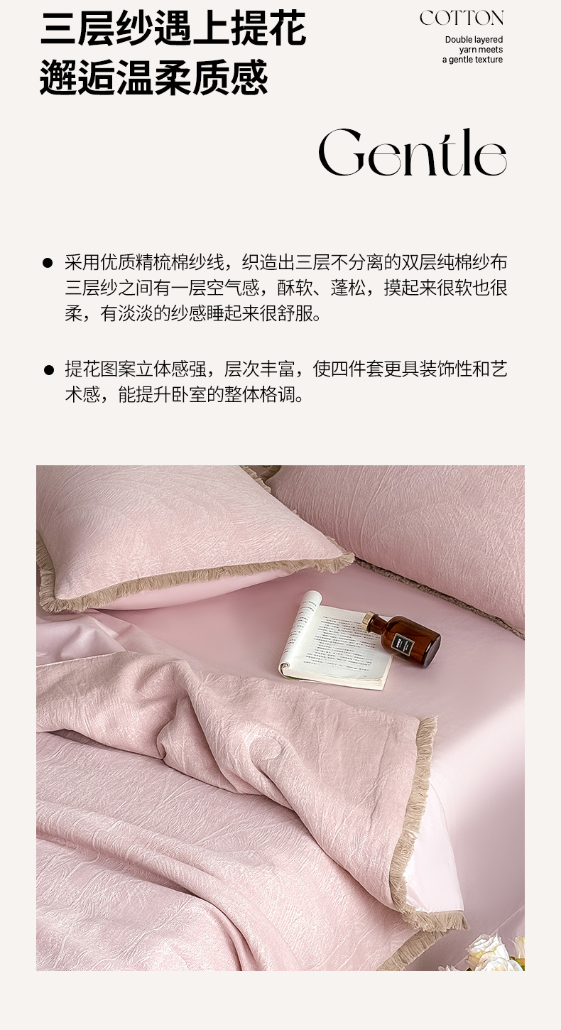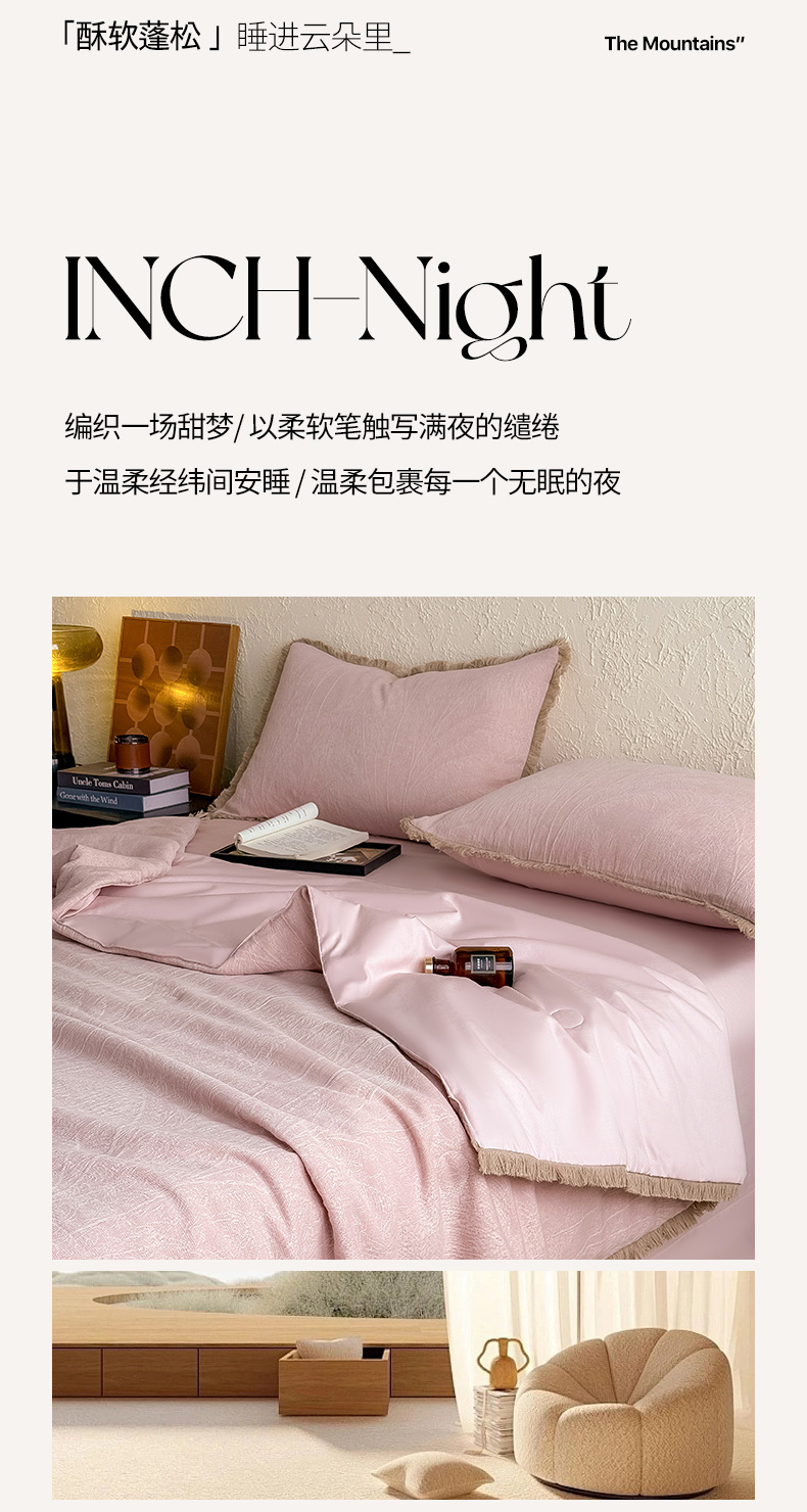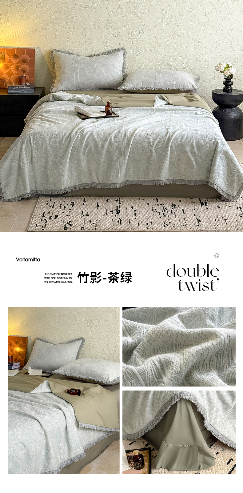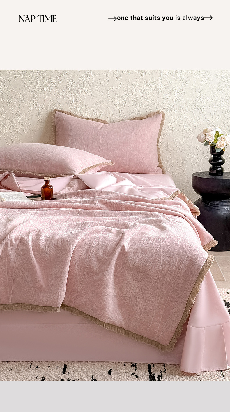 当前位置: 91家纺网 > 商品网购 > 床品套件 > 四件套 > 全棉活性四件套 > 2025新款全棉三层纱提花夏被四件套 竹影-柔粉