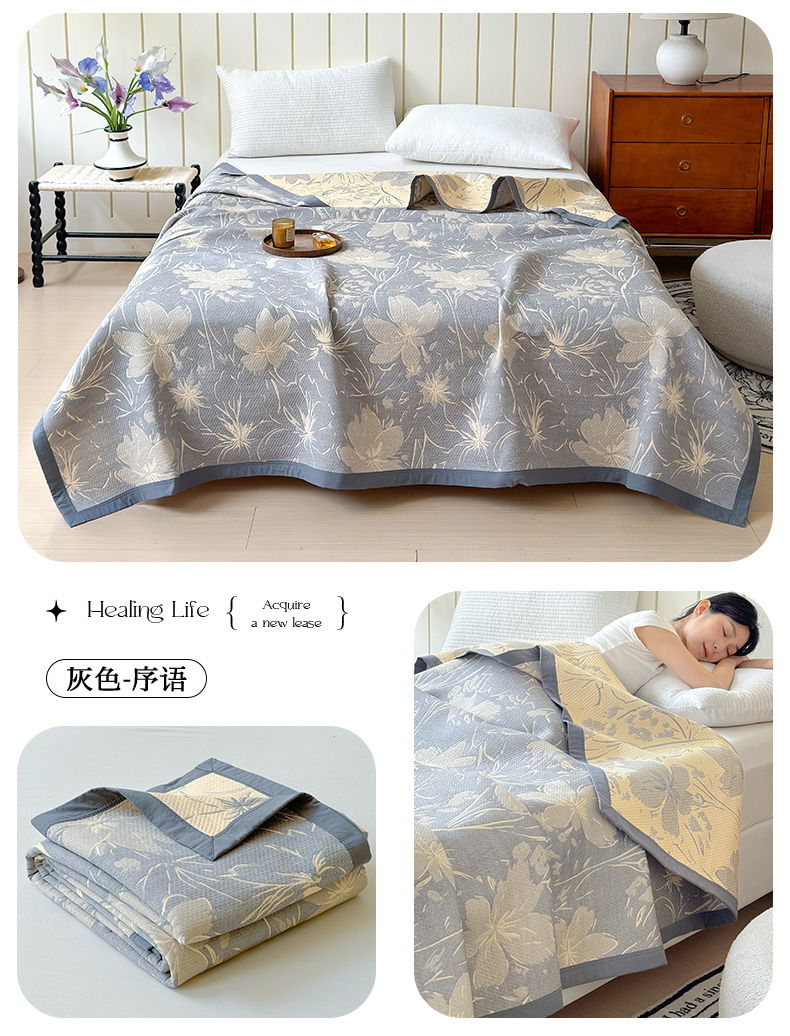 商品名称:2025新款A类纯棉针织三层纱提花多功能毯 绿色-花束