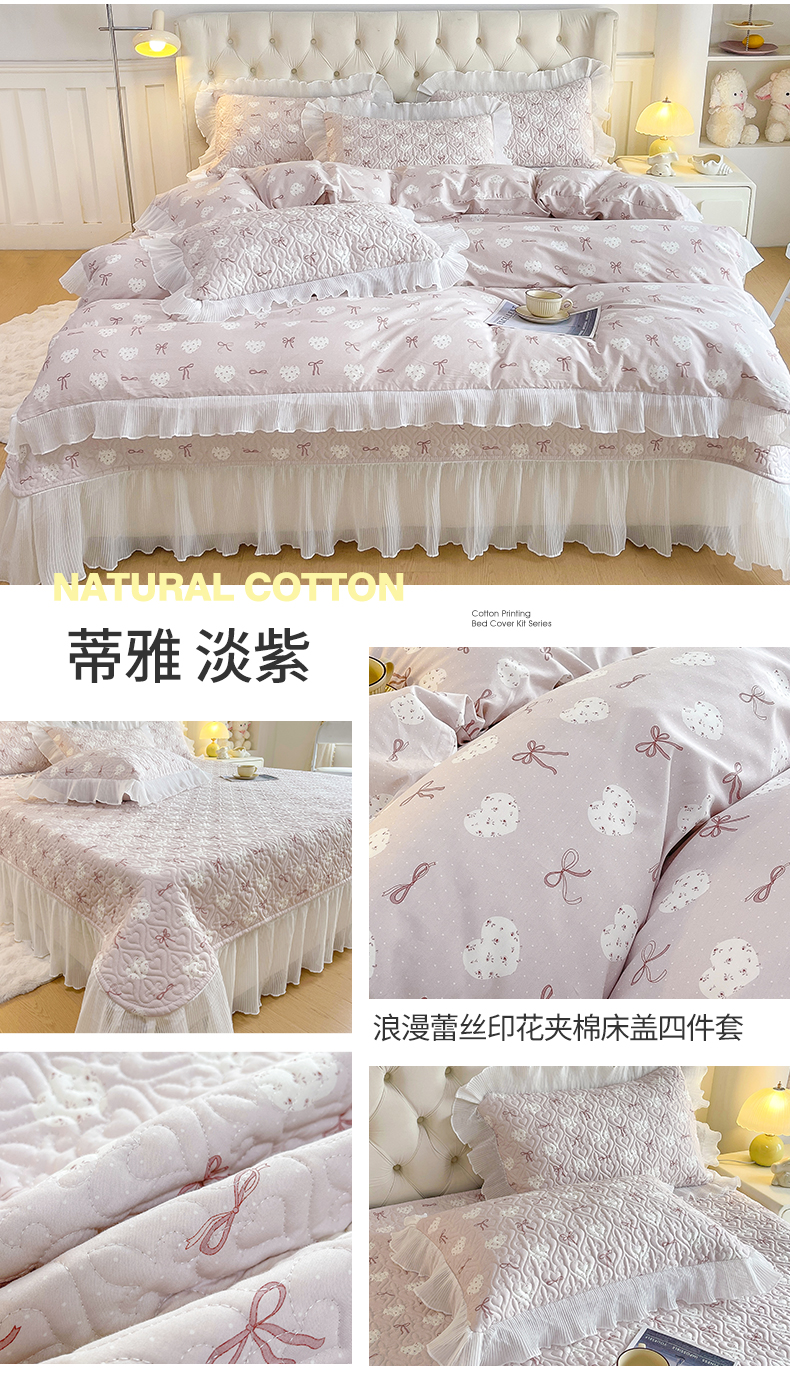 • 91家纺网 家纺一手货源 找家纺 宜凡家纺2025新款雪纺花边印花夹棉床盖三件套四件套 蒂雅 淡紫
