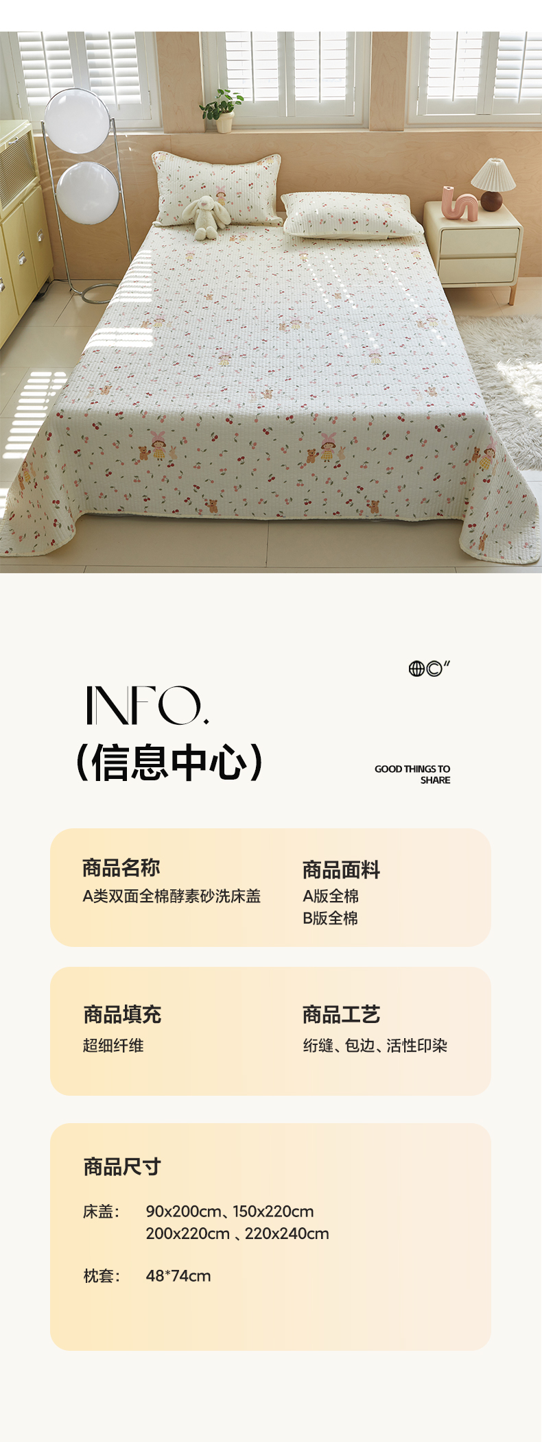 (总)舒居家纺 2025新款双面全棉酵素砂洗床盖( 风格二),组合图,爱心木马,比利小熊,花季少女,花开无声--咖,花睿--青草绿,洛林--粉,迷彩花兔,俏皮狗,兔兔乐园,小汽车,樱桃格子