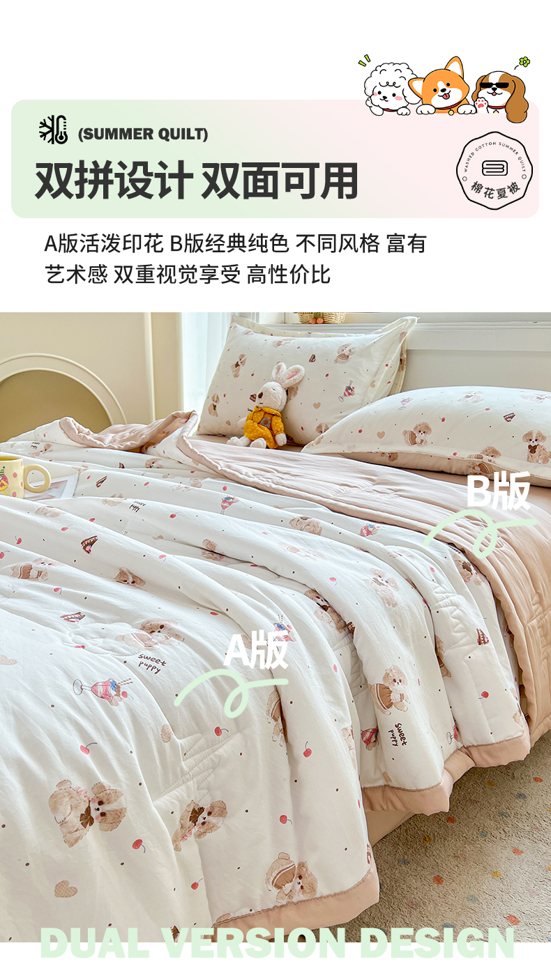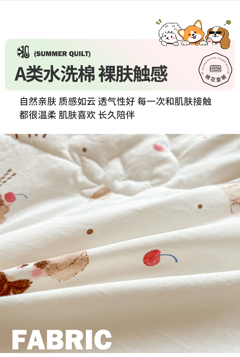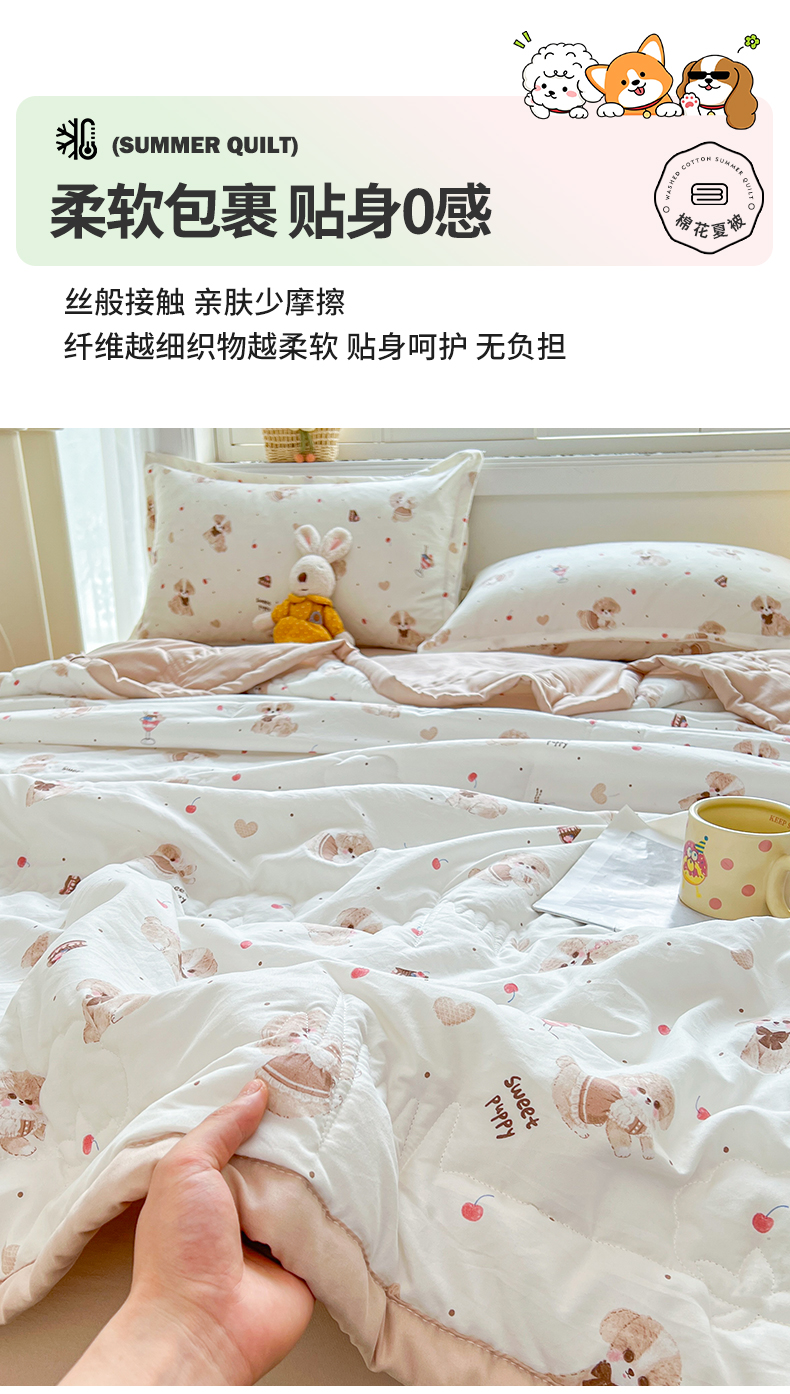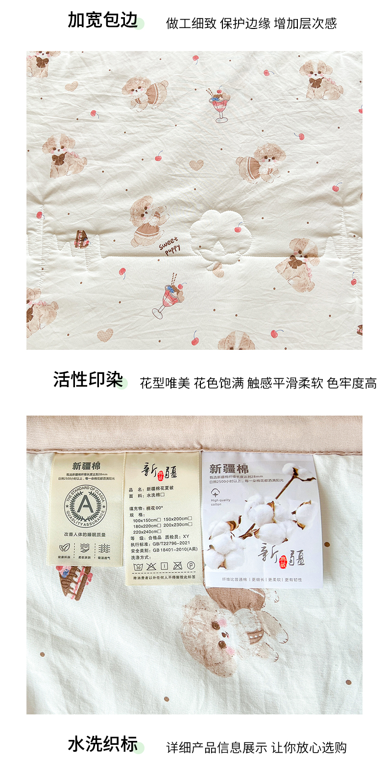 商品名称:西域种棉人·千百笠 2025新款A类新疆棉花夏凉被加宽包边水洗棉卡通印花吸湿透气棉花夏被空调被 凌香 樱桃狗