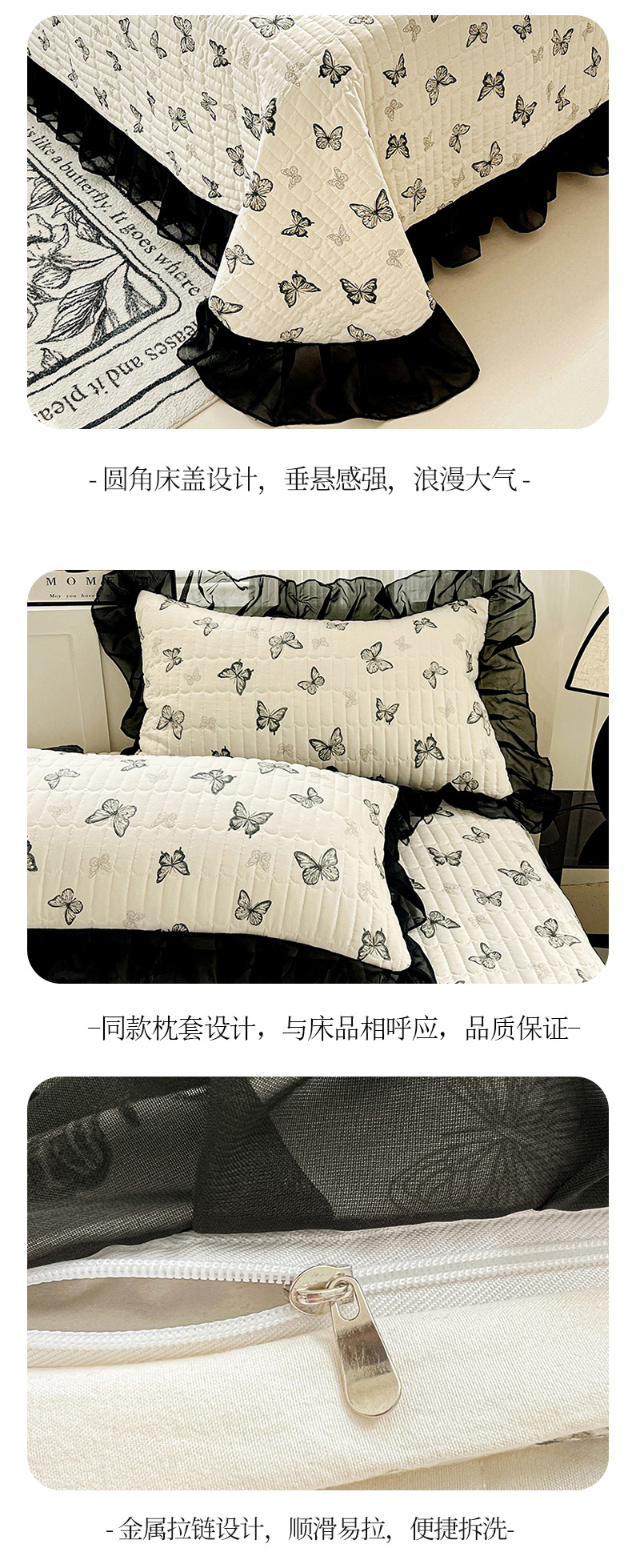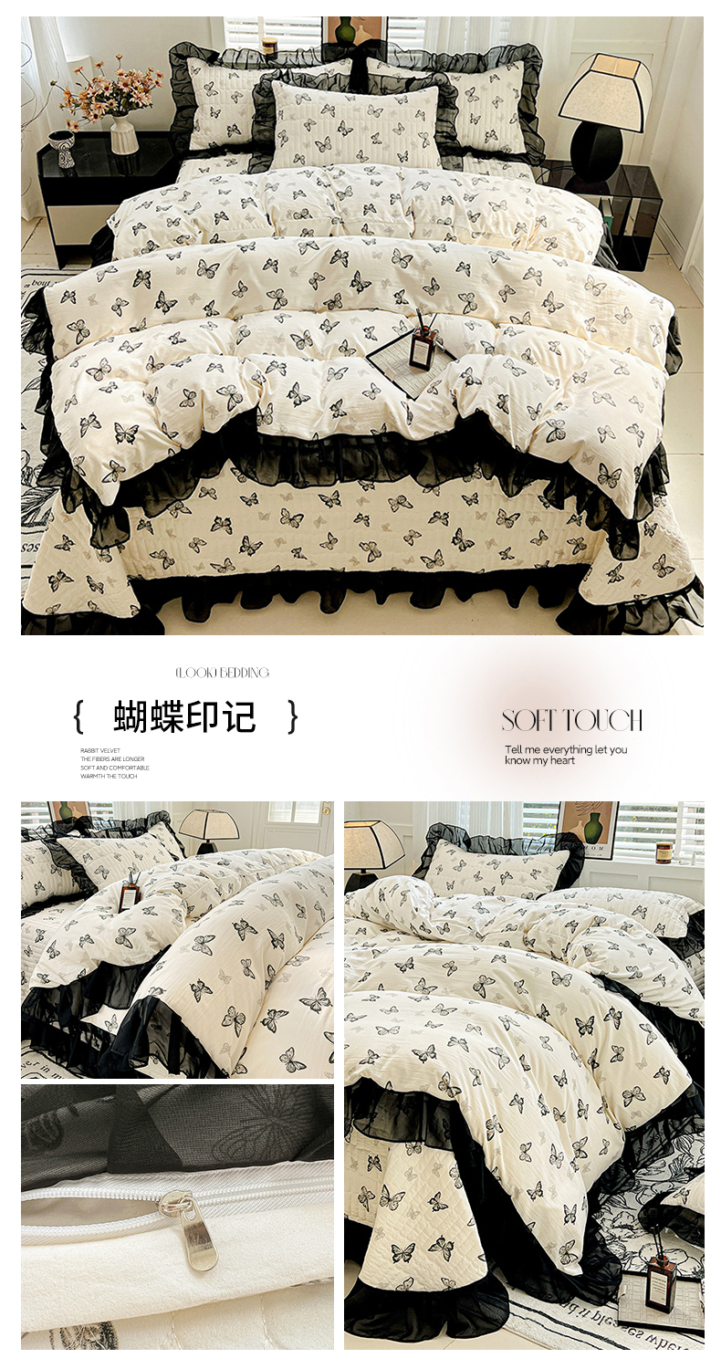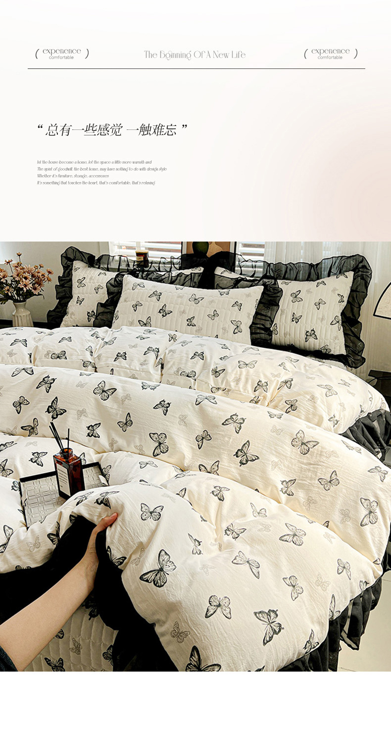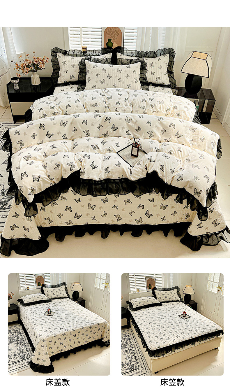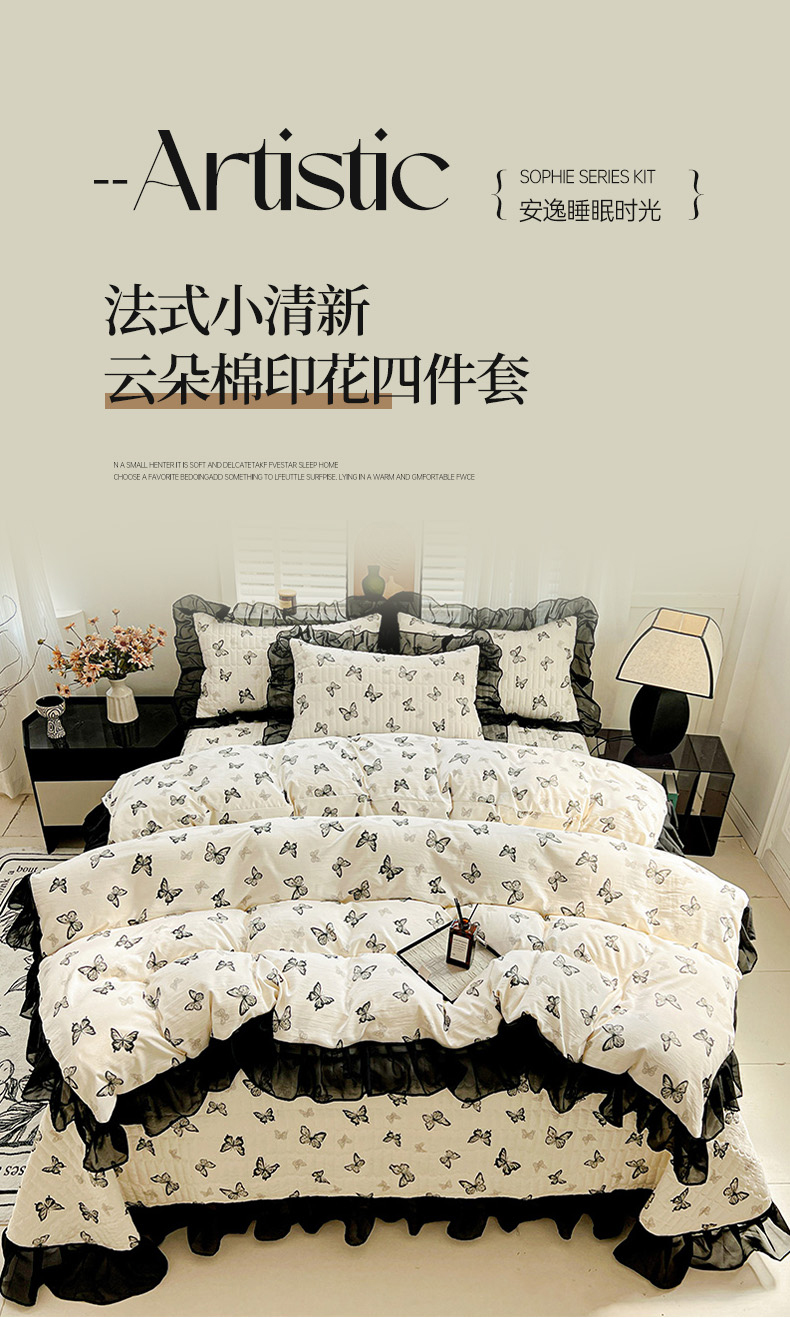 当前位置: 91家纺网 > 商品网购 > 床品套件 > 四件套 > 其它四件套 > 艾橙家纺2025新款法式赫本风水洗棉印花雪纺花边四件套 蝴蝶印记