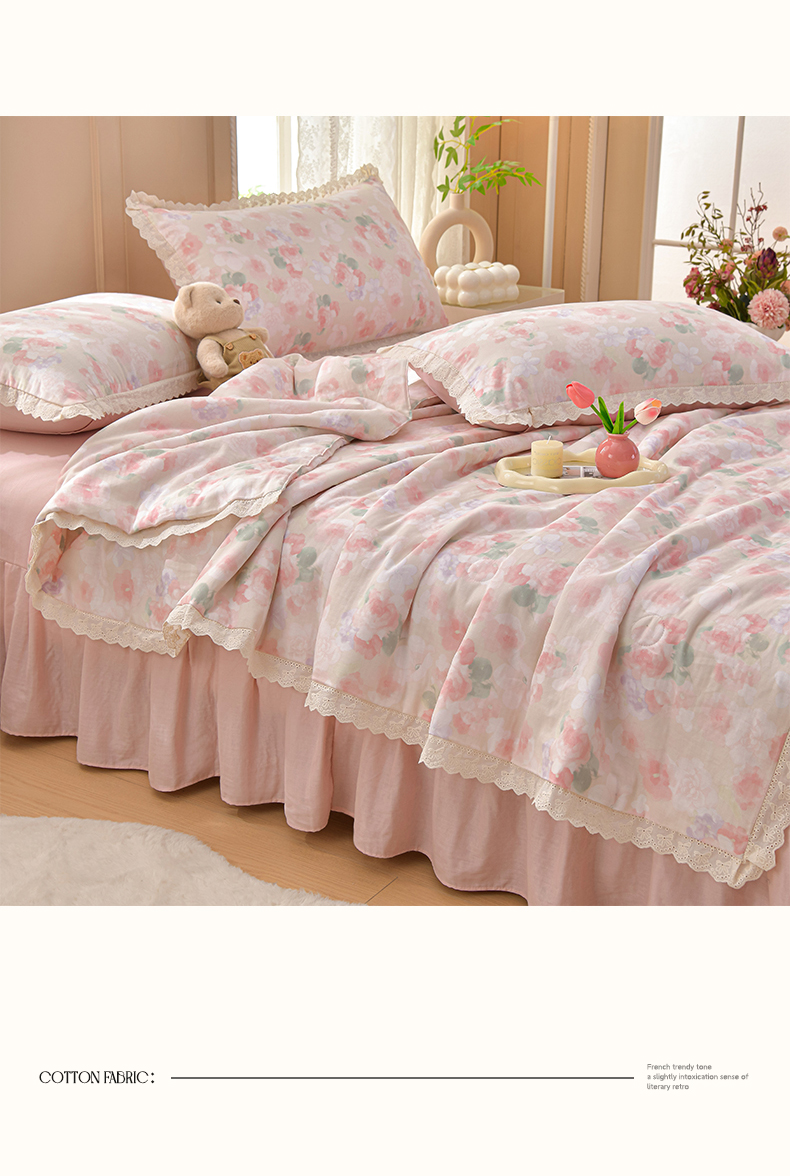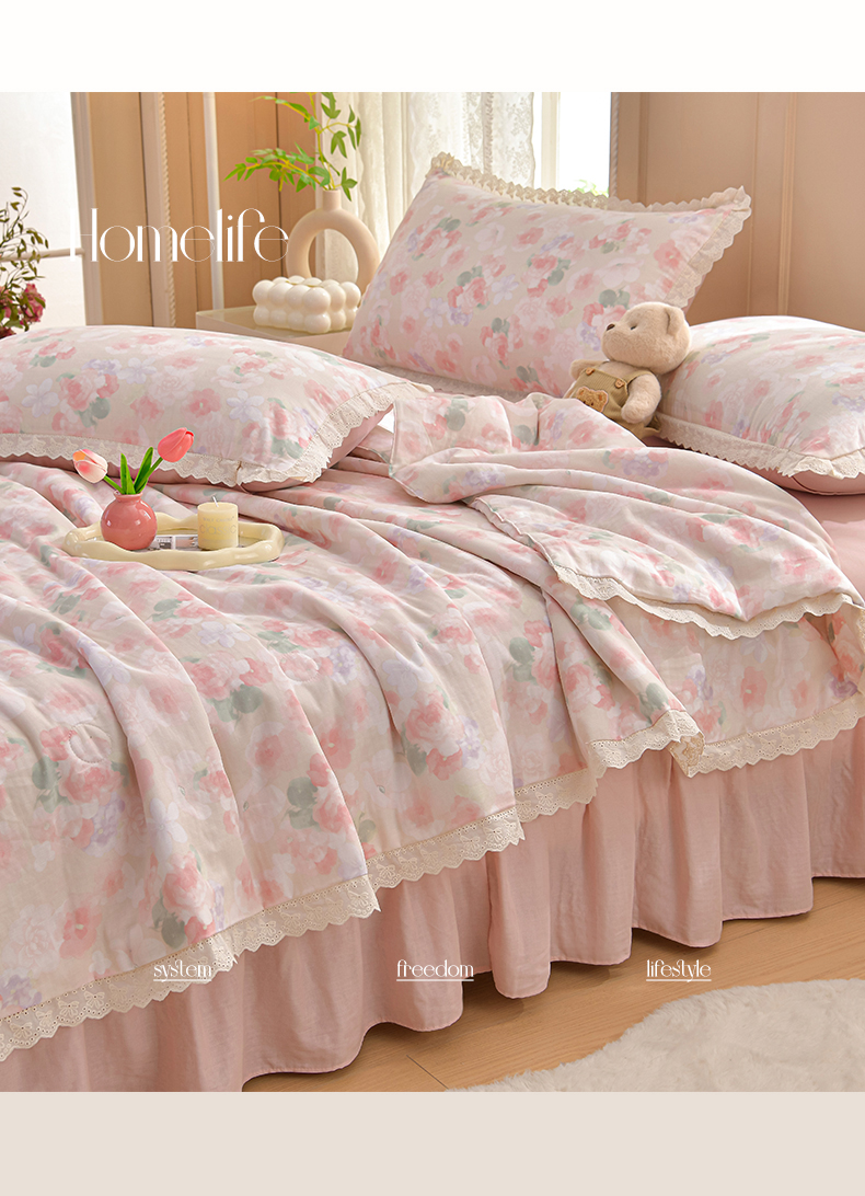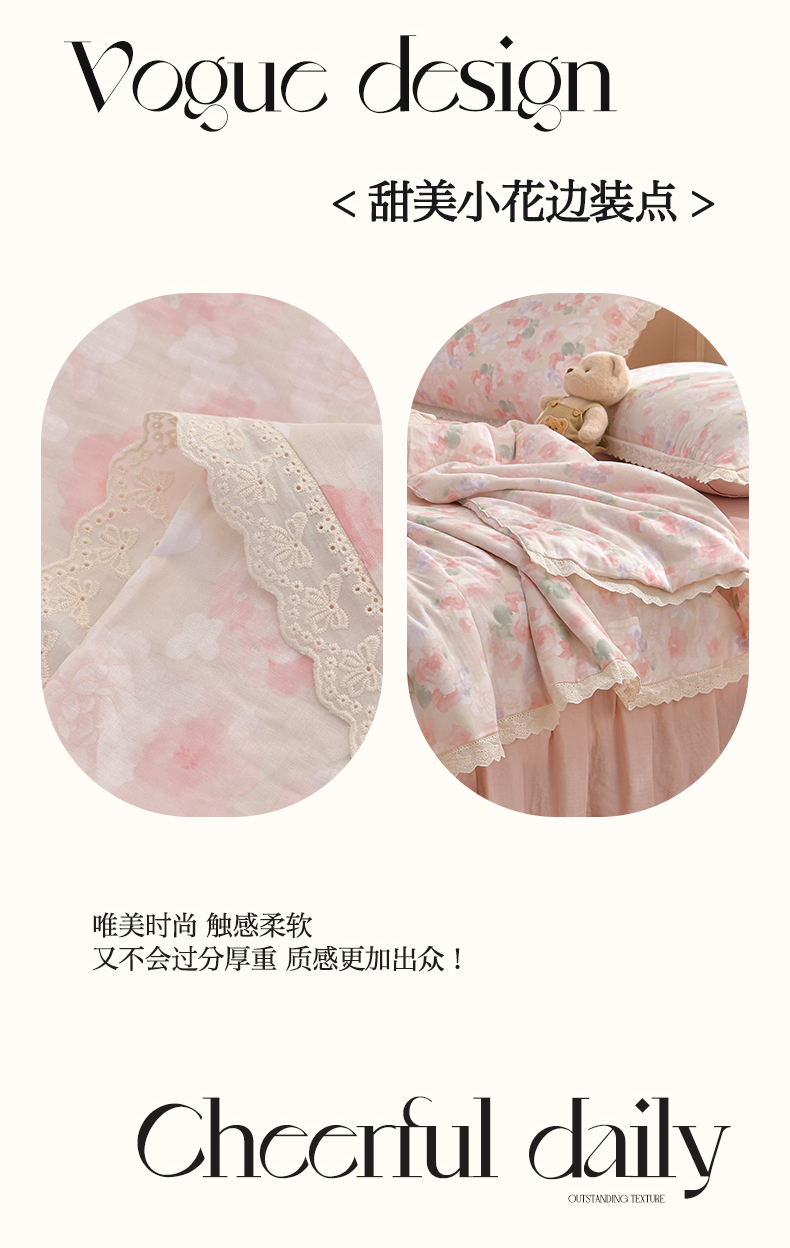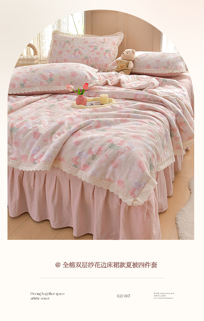 绘萱家居 2025新款100%全棉双层纱花边床裙款夏被四件套 潮汐月影