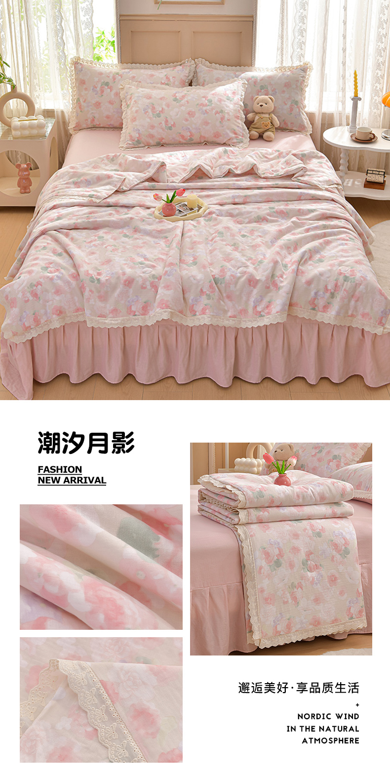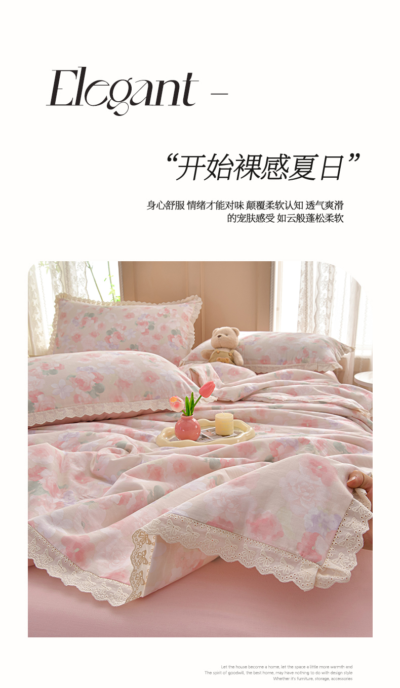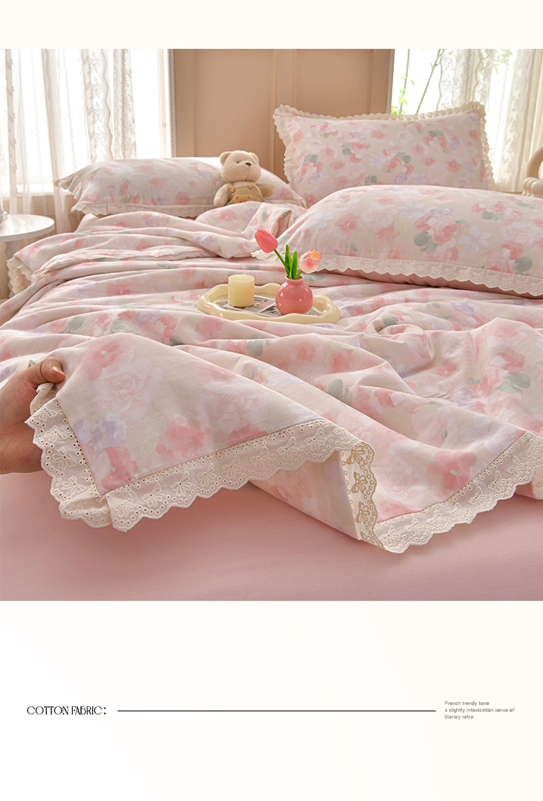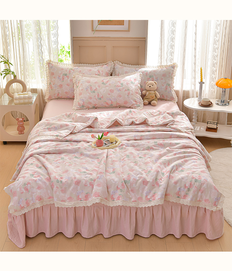 绘萱家居 2025新款100%全棉双层纱花边床裙款夏被四件套 潮汐月影