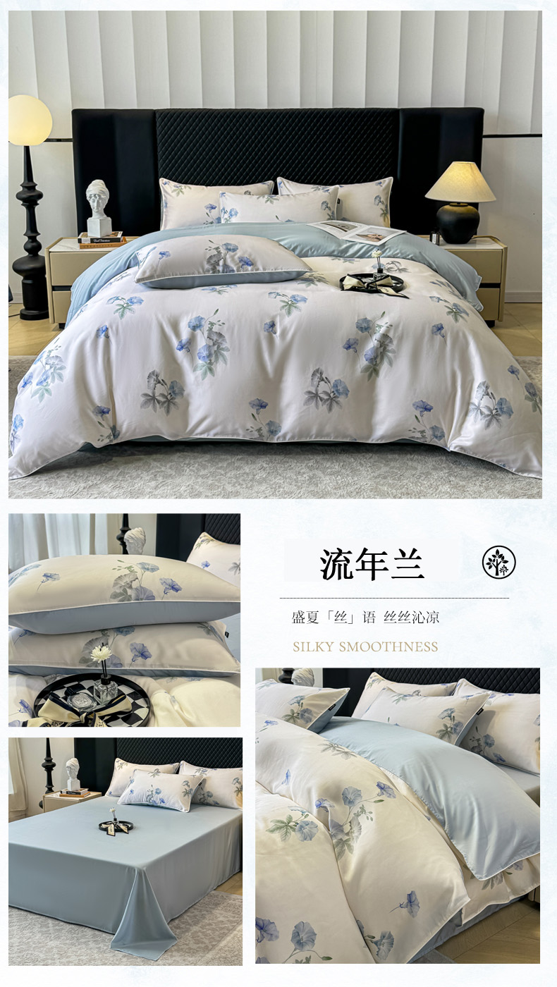 商品名称:芊寻家居 2025春夏新款50支莱赛尔天丝贡缎数码印花麻绳款四件套高端礼盒 流年兰