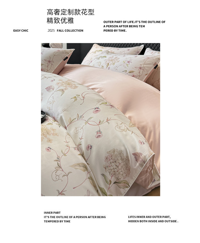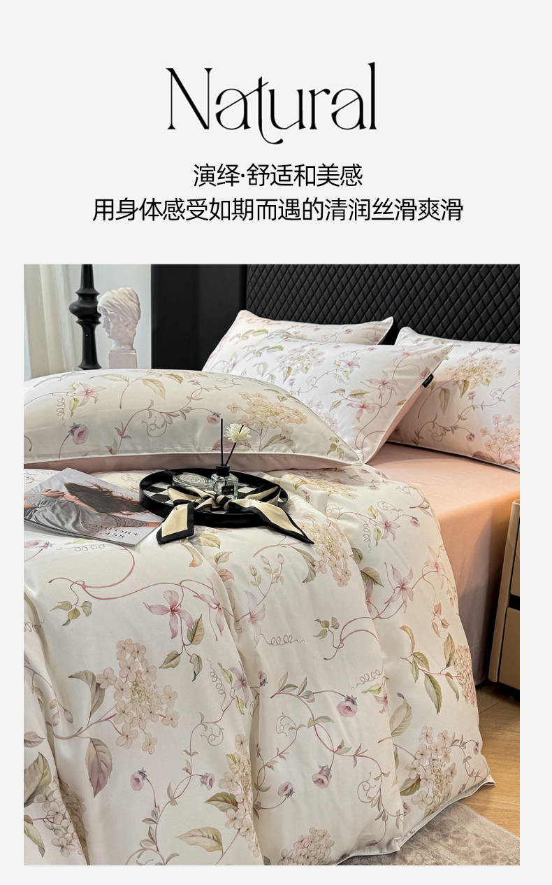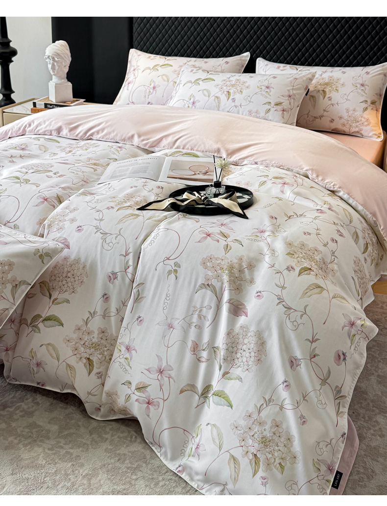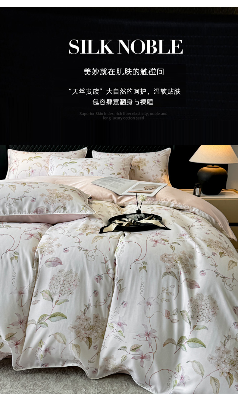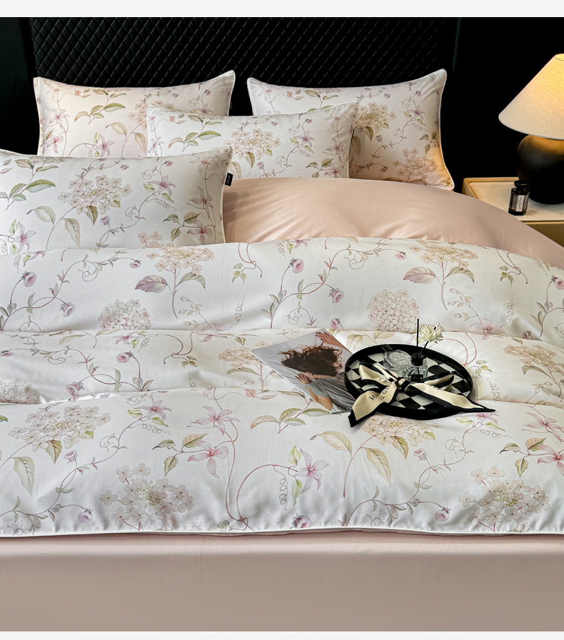 洺兰家居 2025春夏新款100支莱赛尔天丝贡缎数码印花麻绳款四件套高端礼盒 绣球花语粉