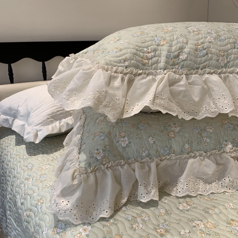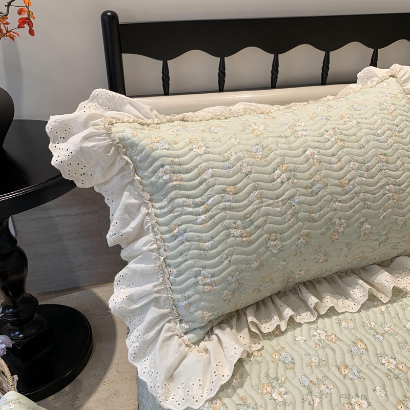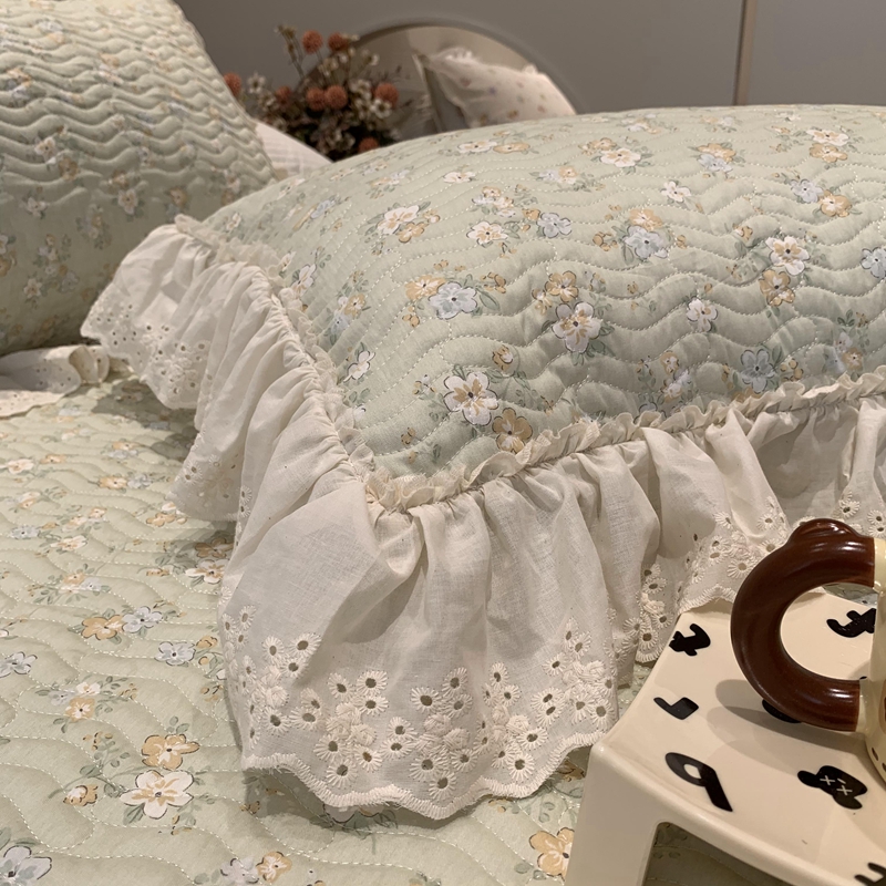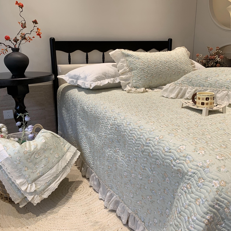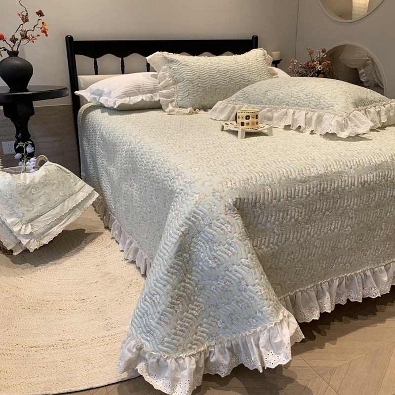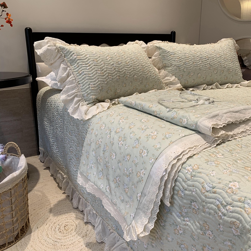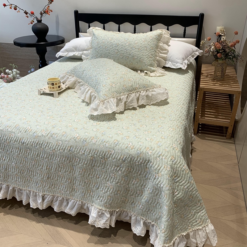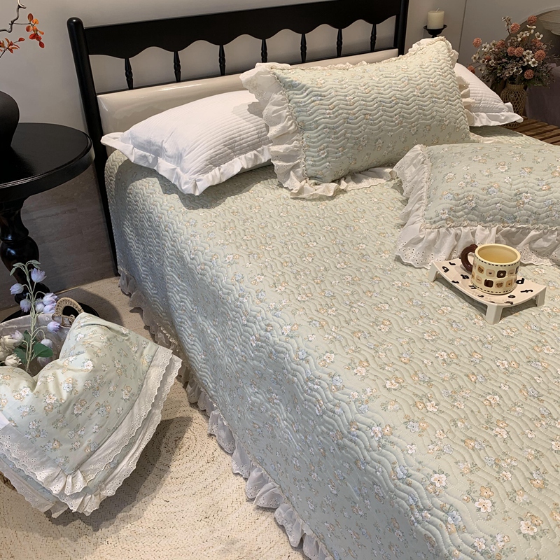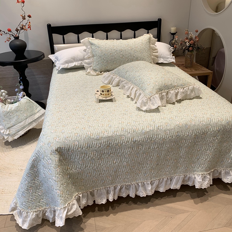 奈萝家纺 2025春夏新款全棉纯棉蕾丝花边款床盖三件套 花语绿