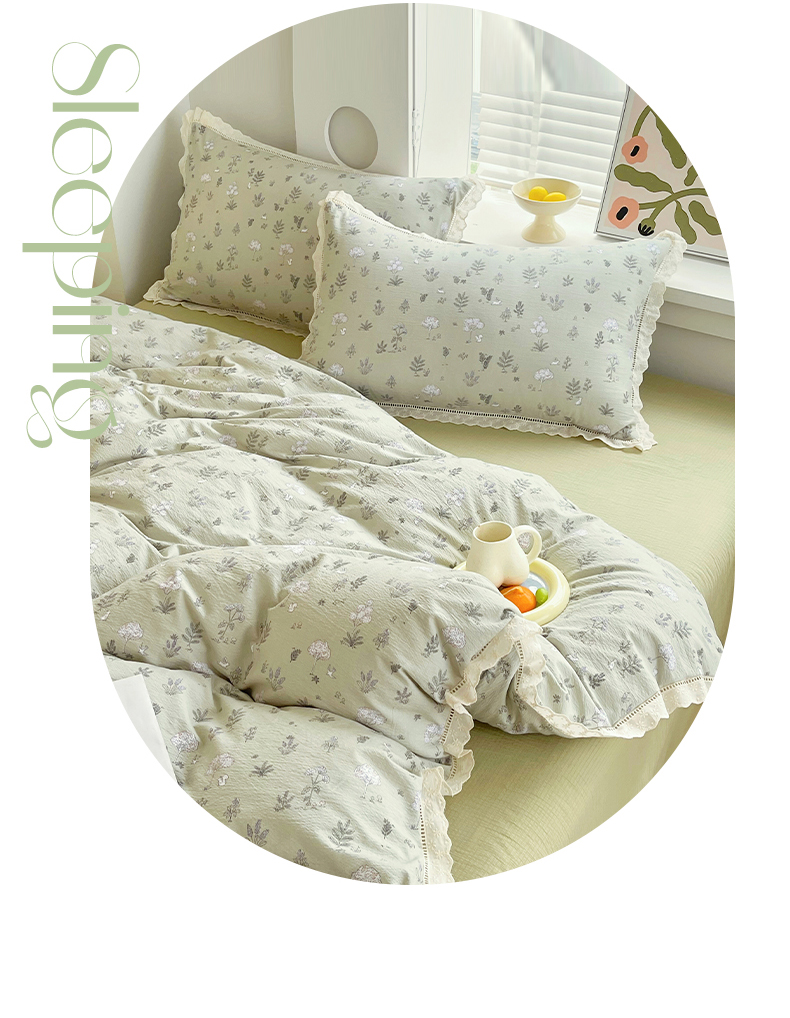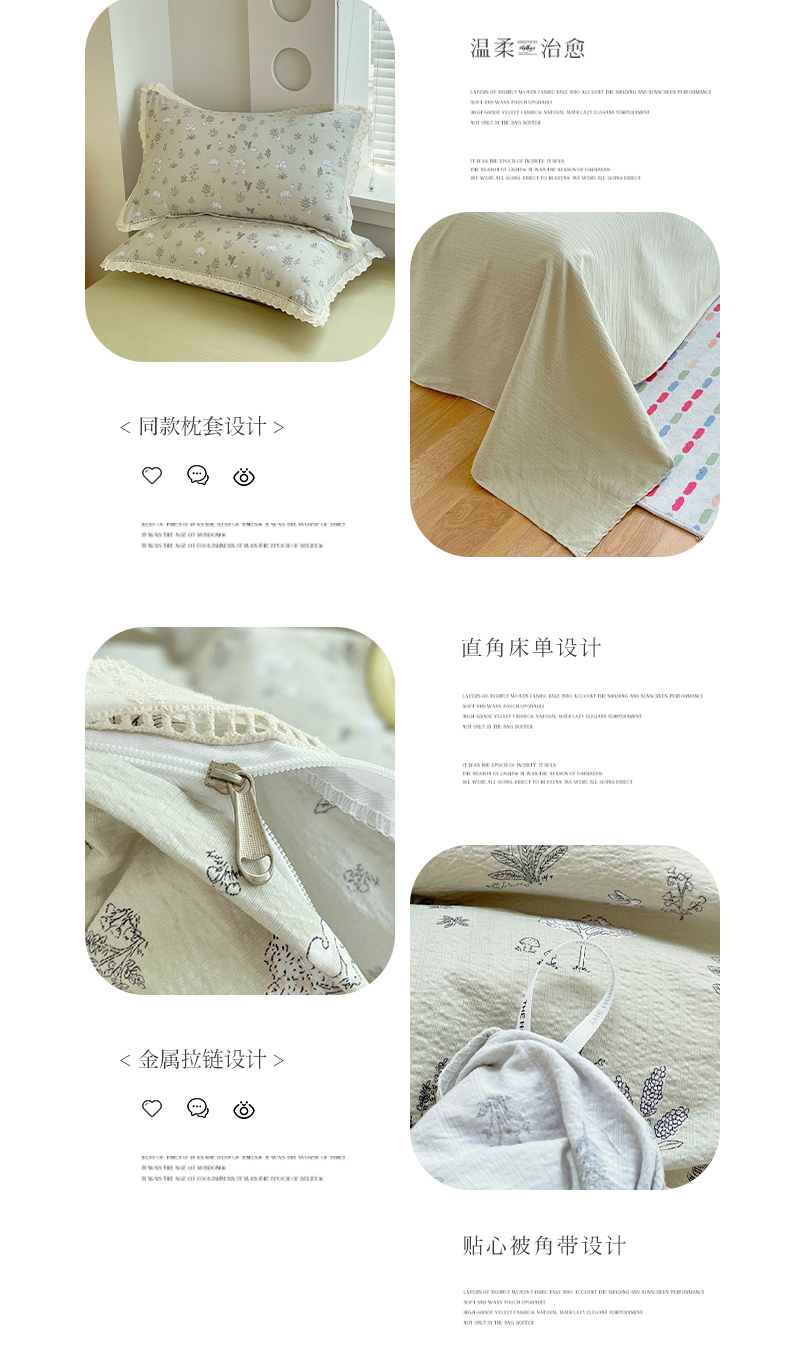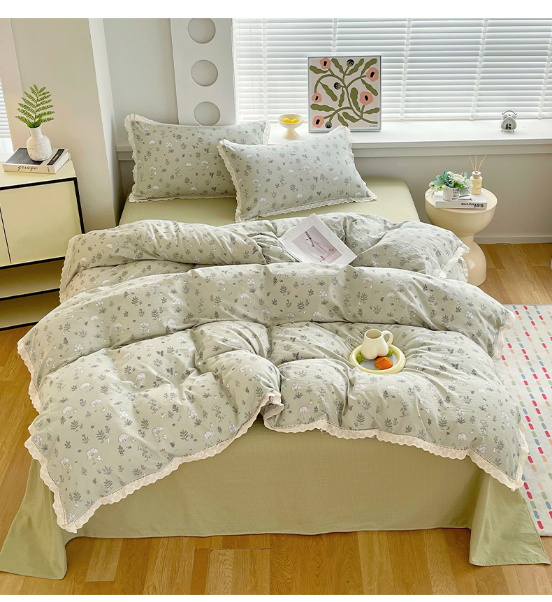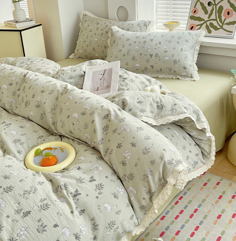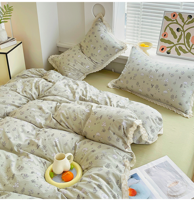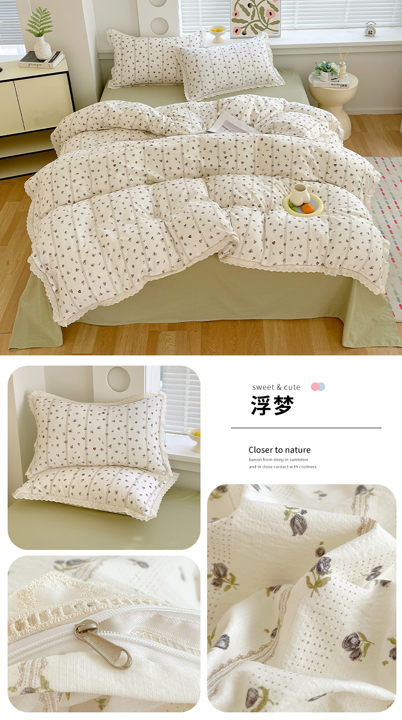 雨彤家纺 2025新款A类高克重云感皱皱双层纱全棉镂空花边款法式四件套-叠拍图 甜蜜花房