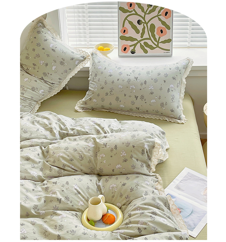 商品名称:雨彤家纺 2025新款A类高克重云感皱皱双层纱全棉镂空花边款法式四件套-叠拍图 甜蜜花房
