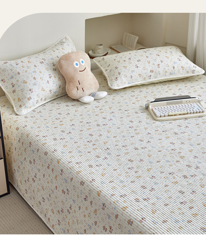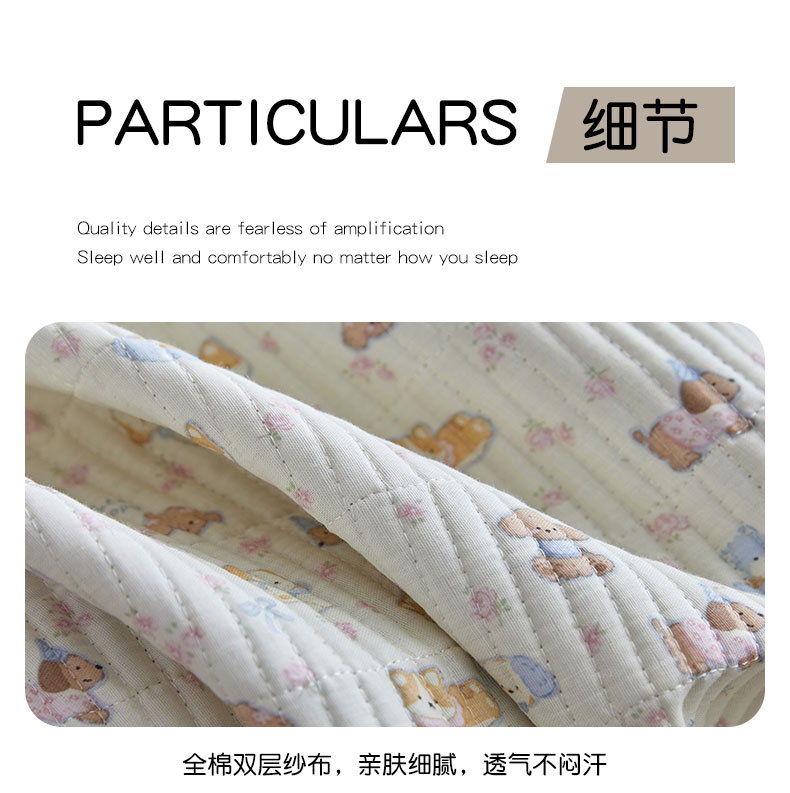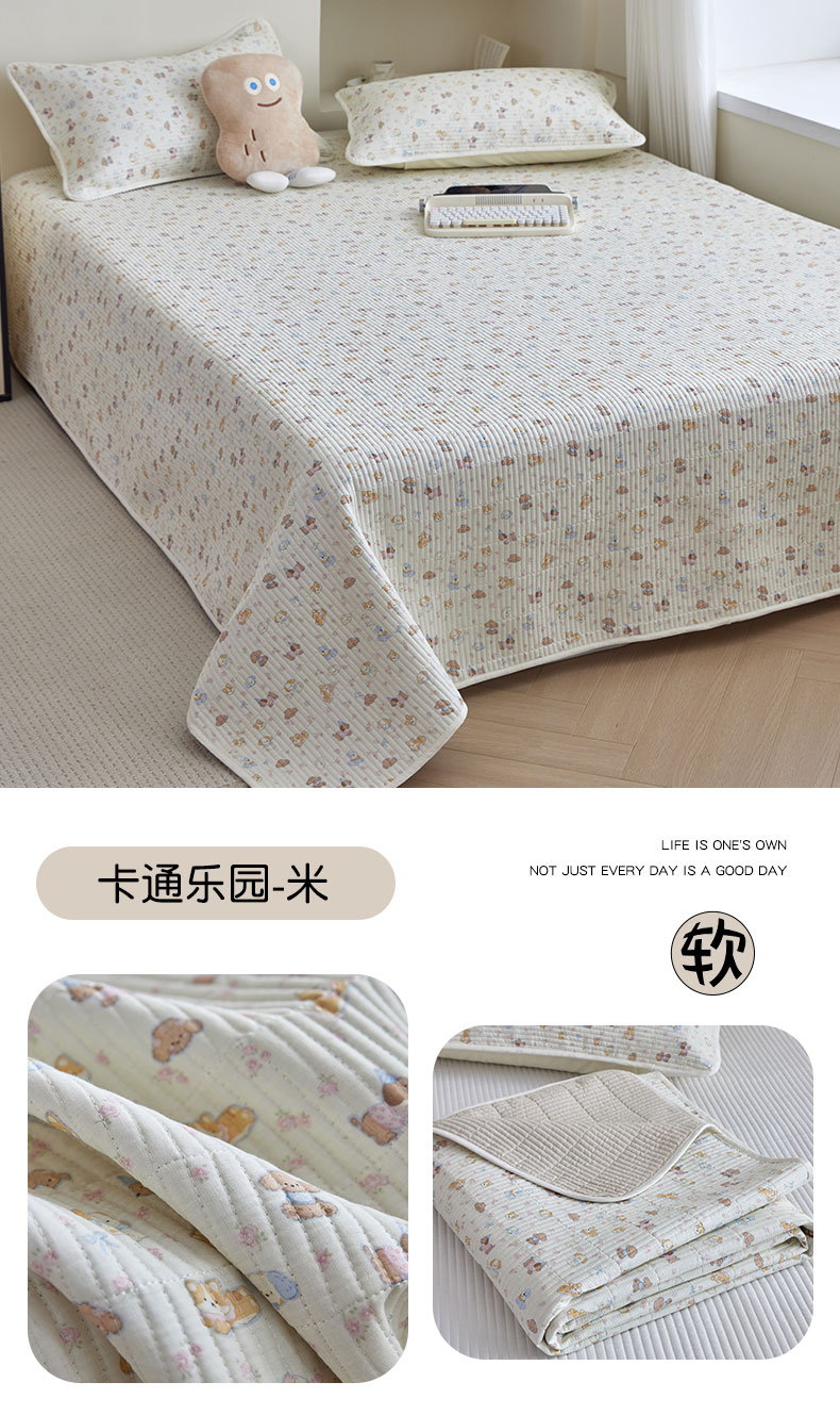 商品名称:亿梵家居 2025新款全棉纯棉双层纱床盖三件套A类母婴级纯棉床盖炕盖夹棉床单 卡通乐园-米