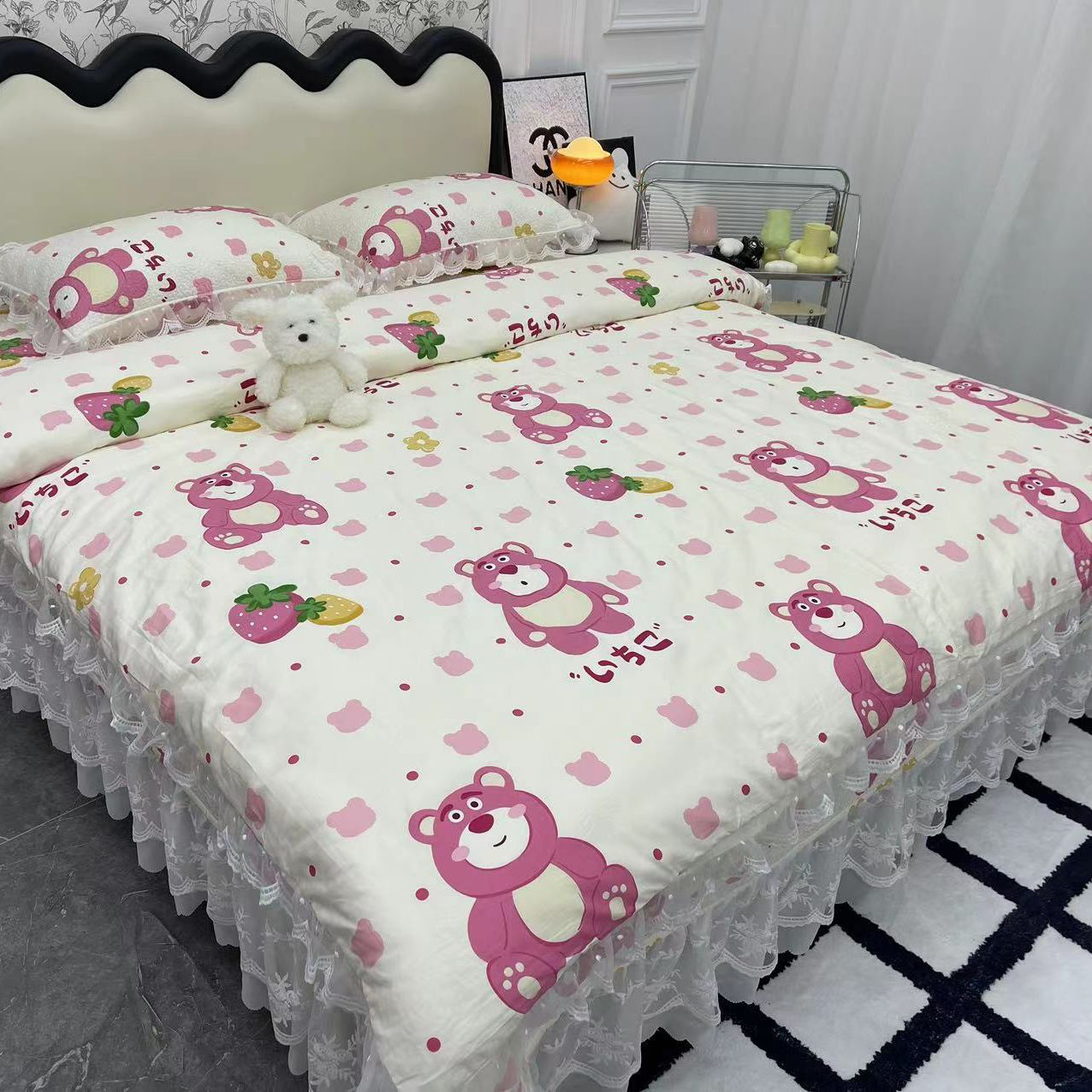 商品名称:禧瑞谷 2025新款双层花边纯棉床盖雪纺蕾丝款纯棉床盖四件套 草莓熊