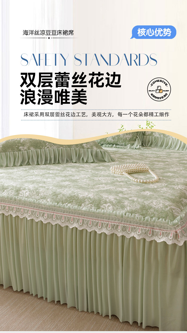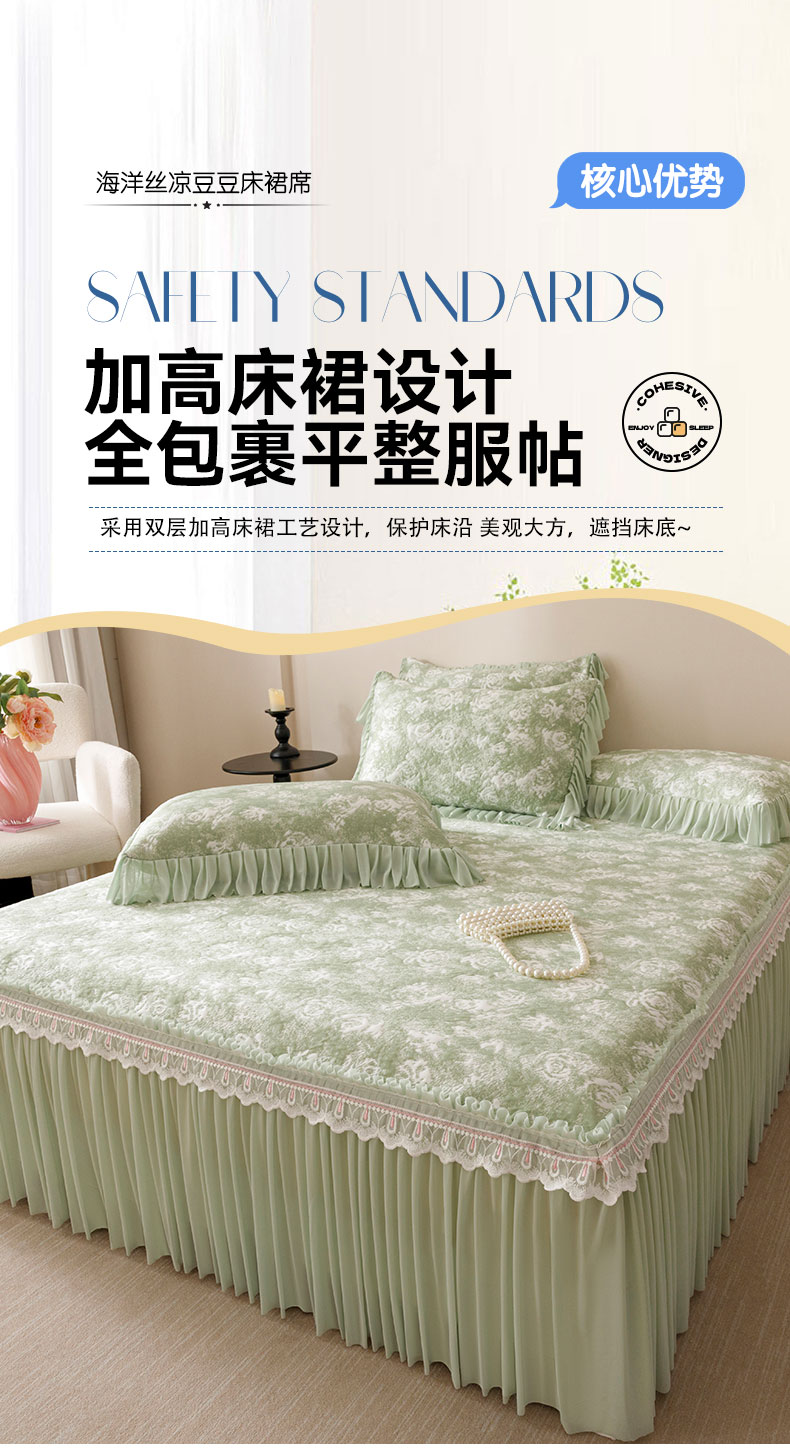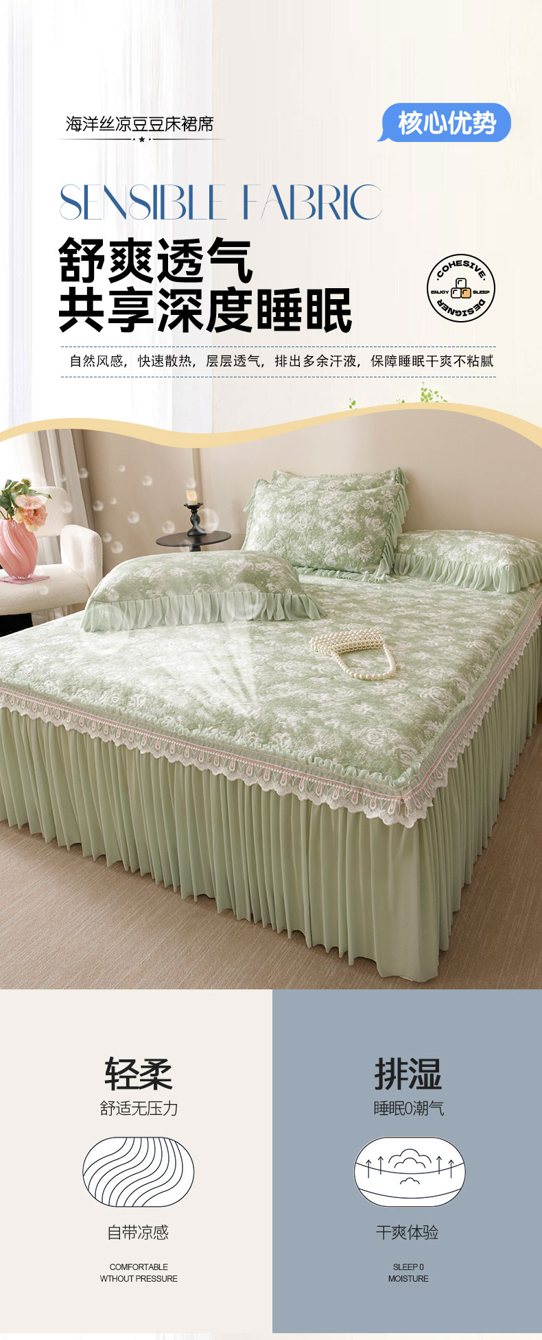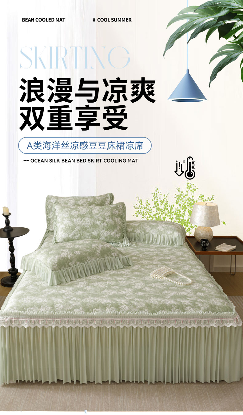 好儿喜家纺 2025新款海洋丝凉感豆豆床裙凉席-缤纷玫瑰 缤纷玫瑰-绿