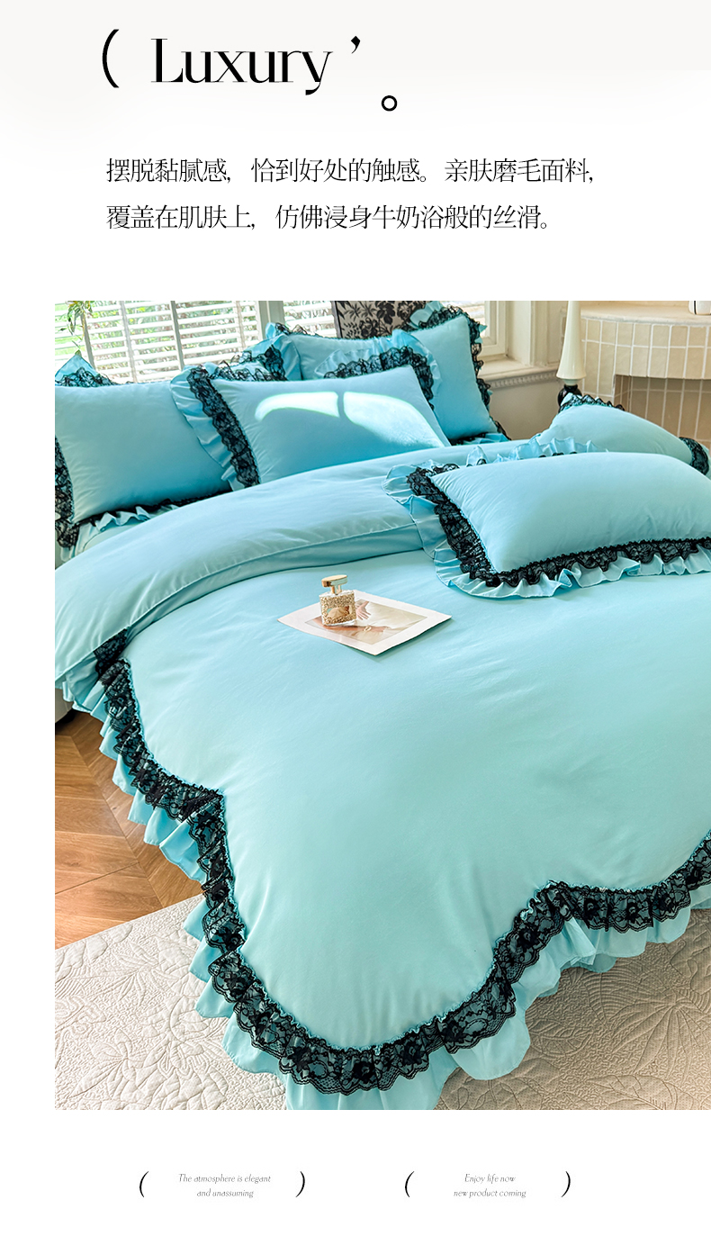 (总)芭比蔓 2024新款直播供货韩版花边款牛奶绒四件套,爱玛橙,宝石红,湖蓝,倾国粉,秋月黄,深灰,珍珠白,竹青绿