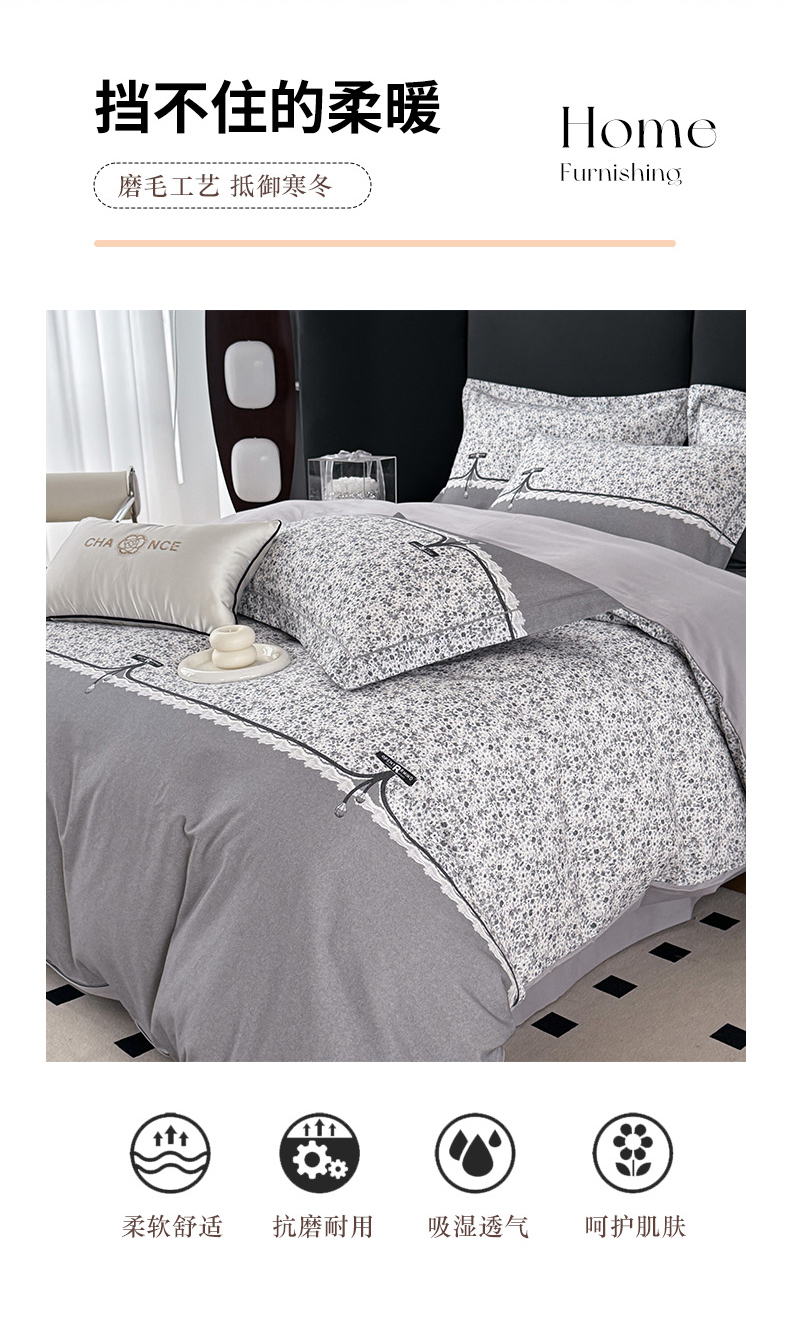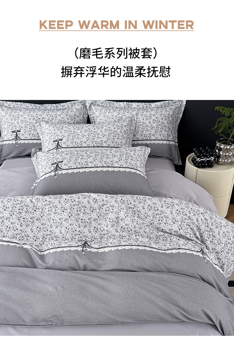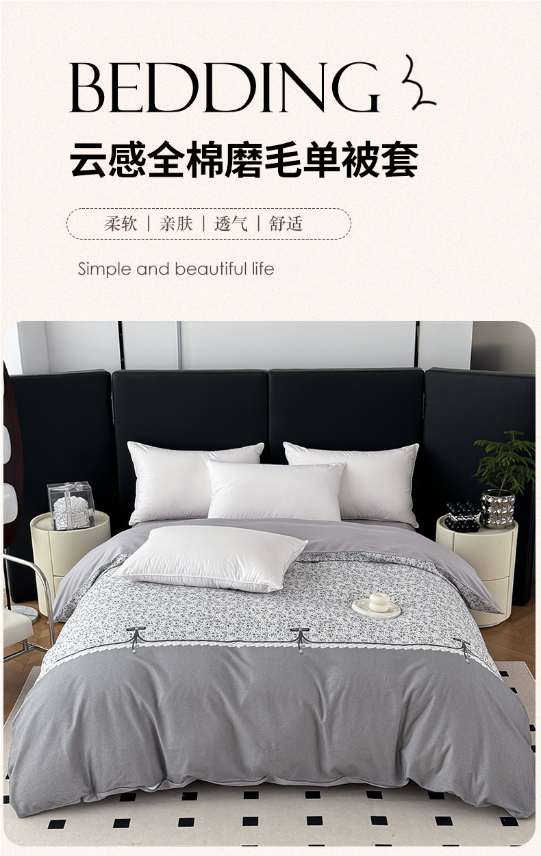 • 91家纺网 家纺一手货源 找家纺 艾迪尚家纺 2025新款云感超柔全棉磨毛印花单品被套系列 芳菲-灰