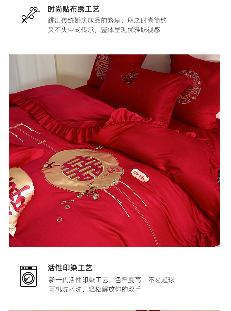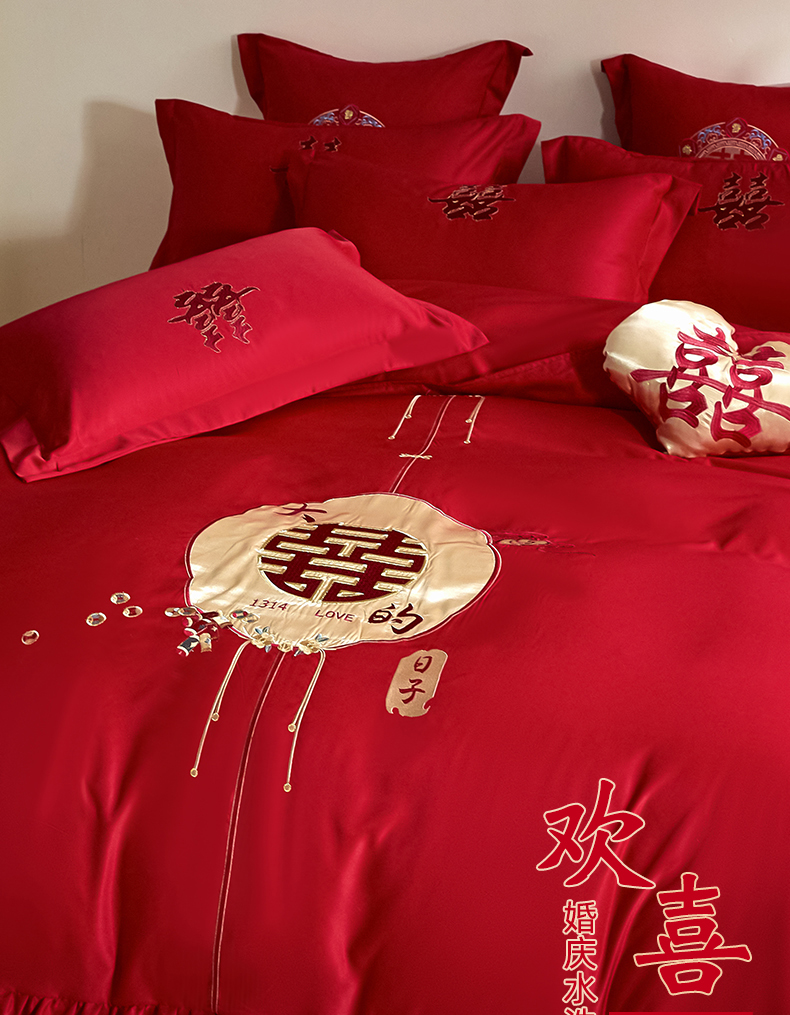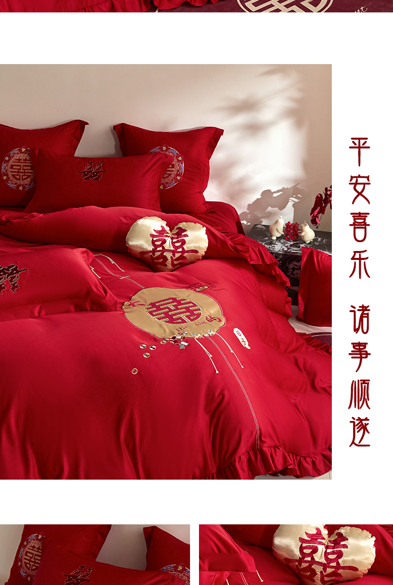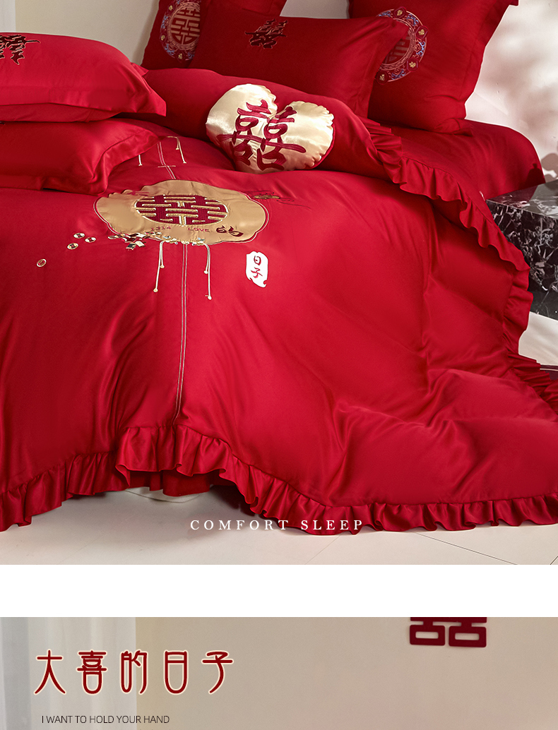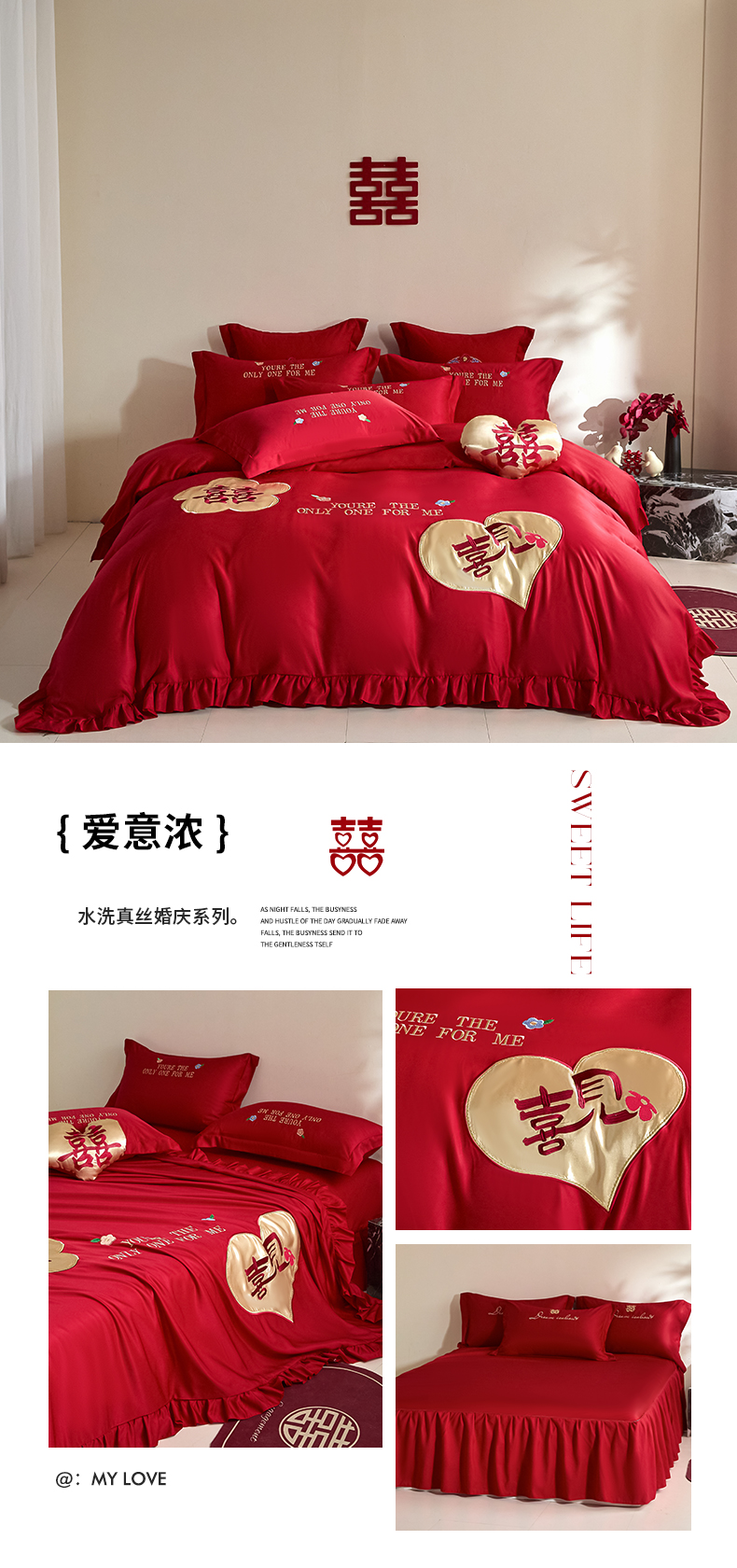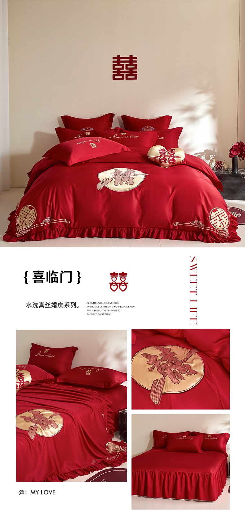 当前位置: 91家纺网 > 商品网购 > 床品套件 > 四件套 > 婚庆四件套 > 玉雅家纺 2025新款水洗冰丝刺绣床裙款婚庆四件套 床裙款-大喜日子