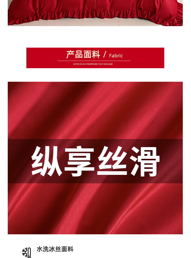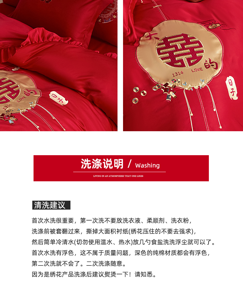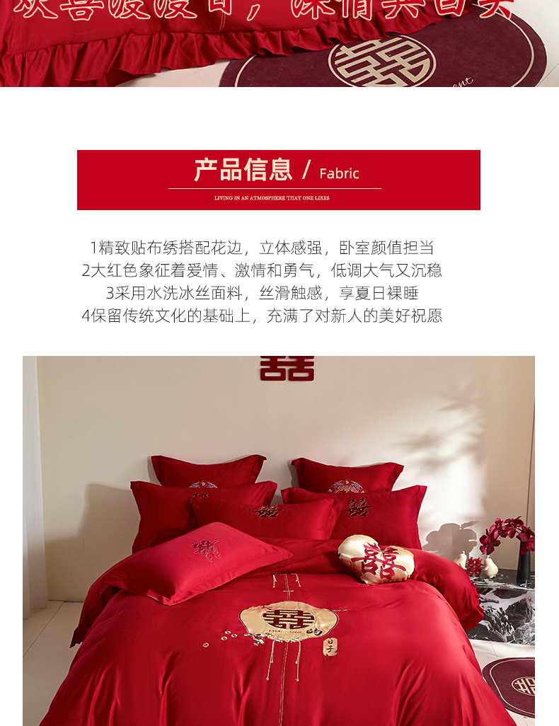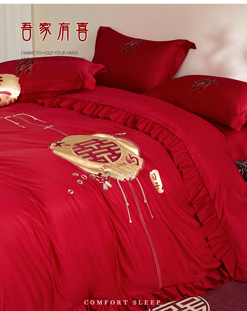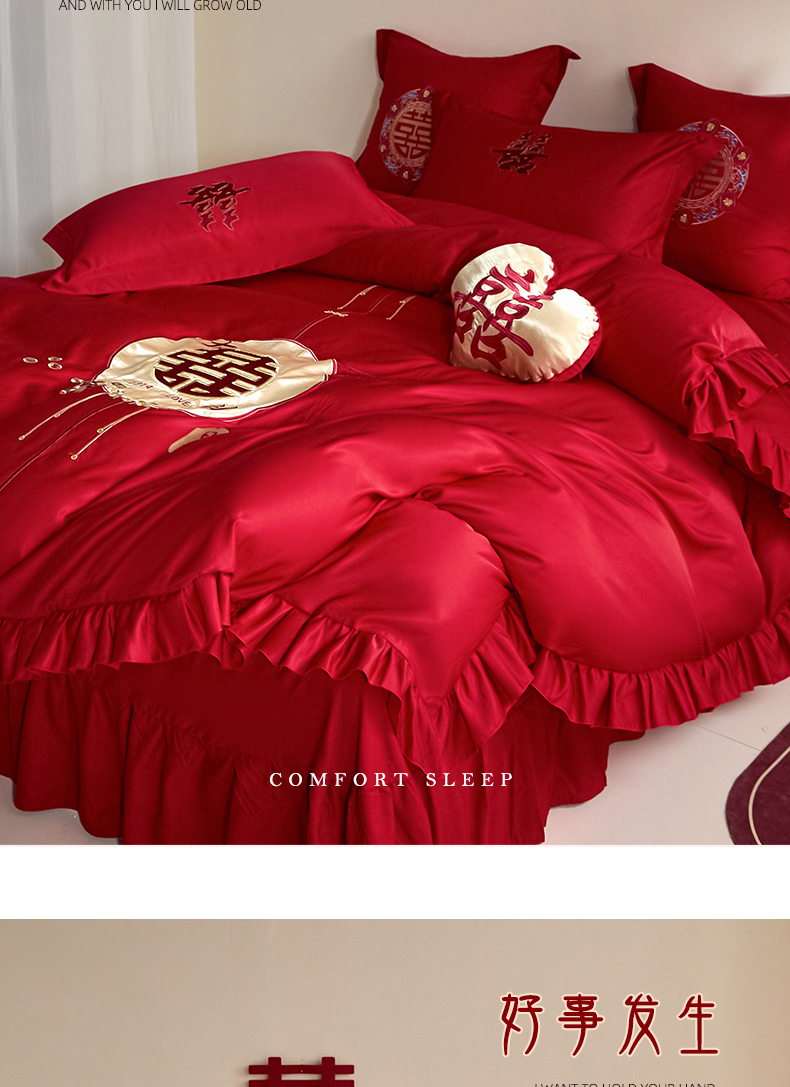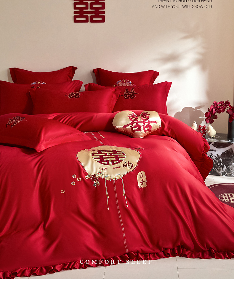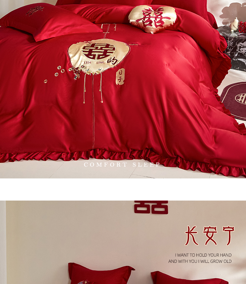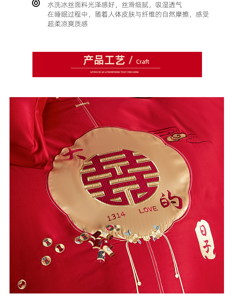 当前位置: 91家纺网 > 商品网购 > 床品套件 > 四件套 > 婚庆四件套 > 玉雅家纺 2025新款水洗冰丝刺绣床裙款婚庆四件套 床裙款-大喜日子