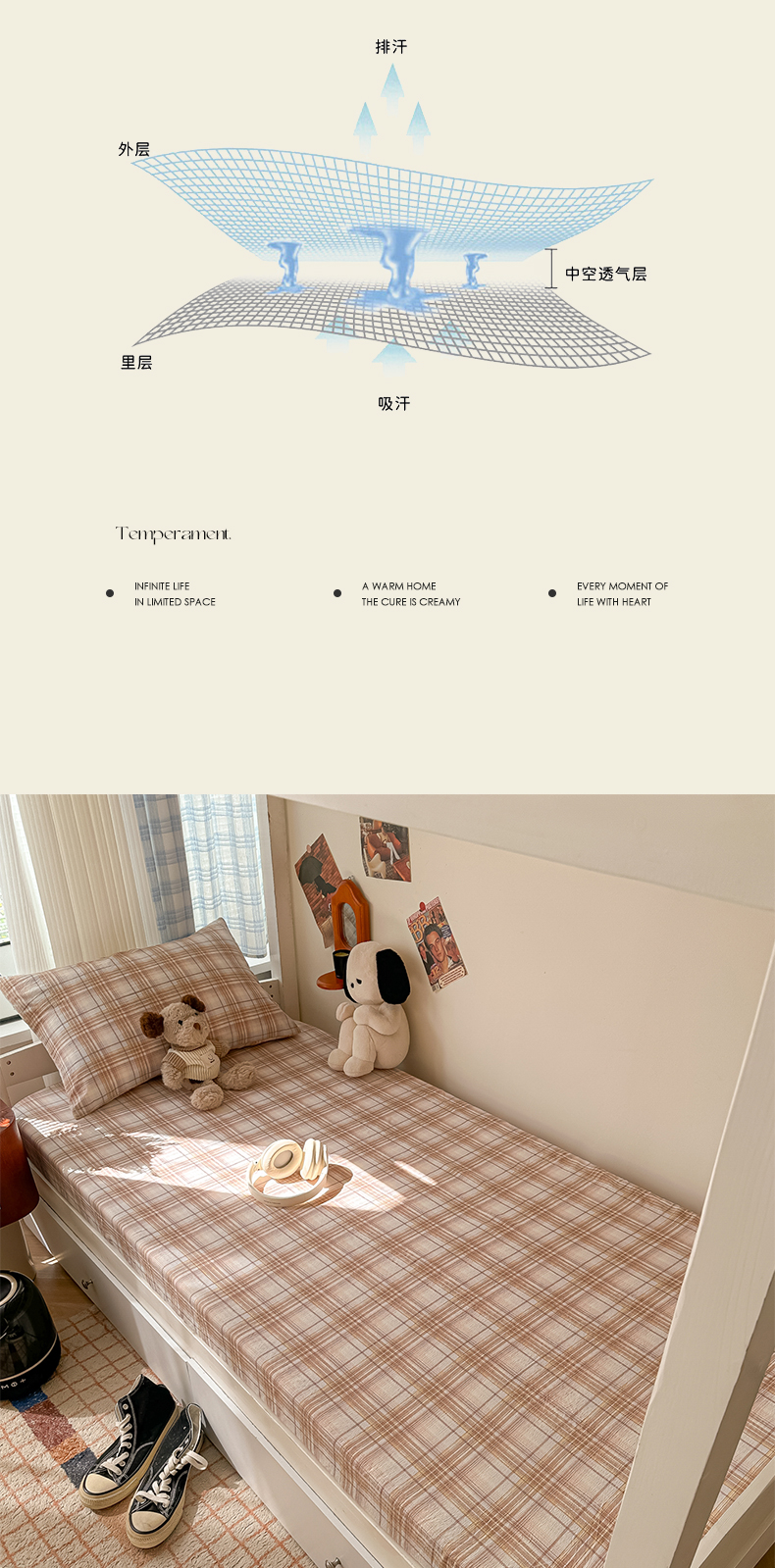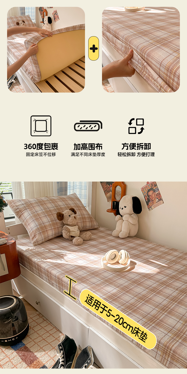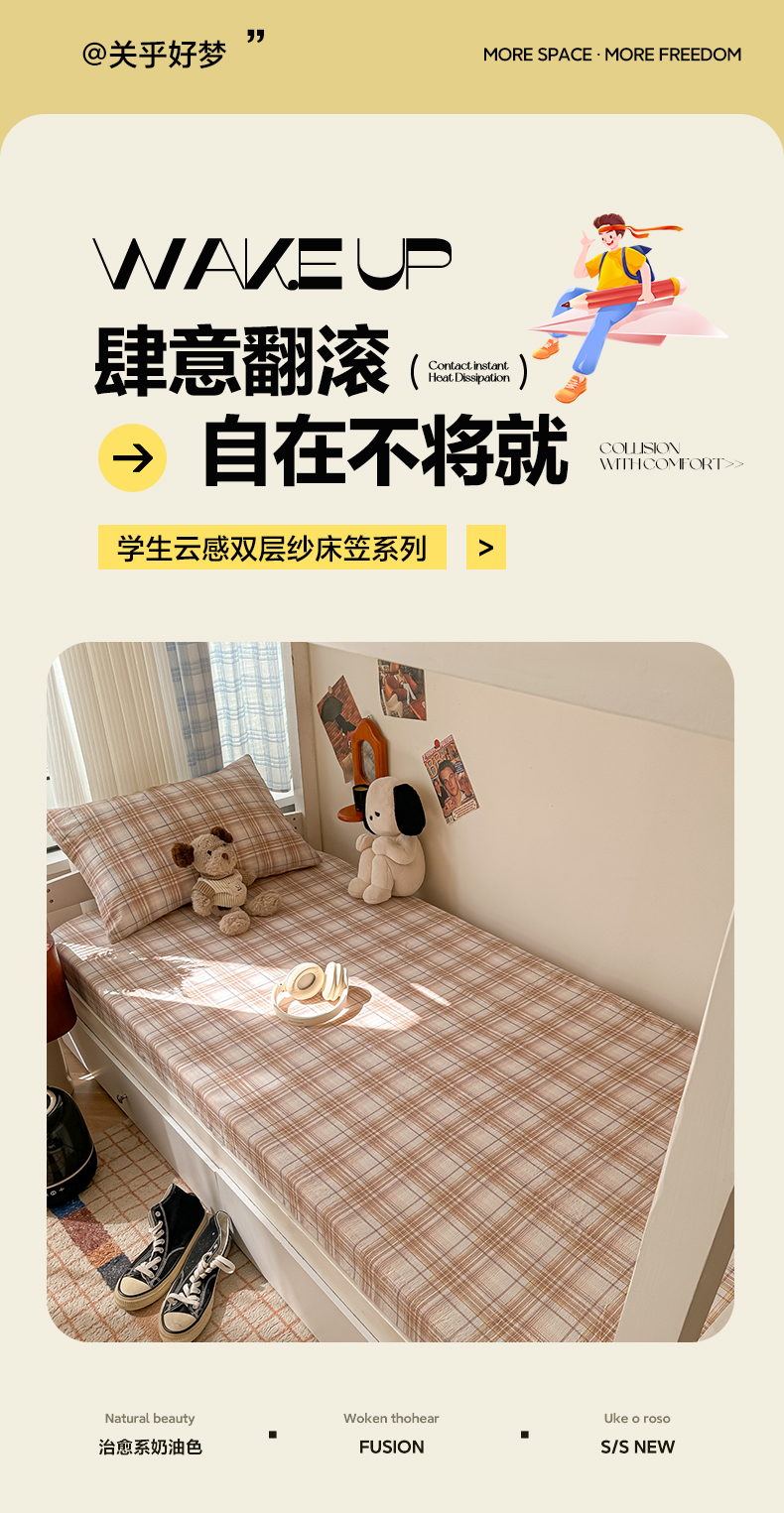 • 91家纺网 家纺一手货源 找家纺 韩巢家纺 2025新款上下铺双层纱学生宿舍寝室格子复古风床笠单件高低床防滑床单床套 鹿灵