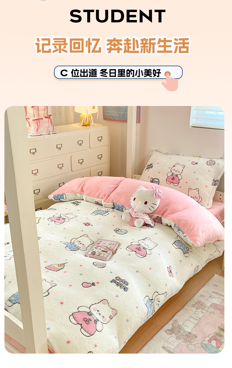 当前位置: 91家纺网 > 商品网购 > 床品套件 > 四件套 > 其它四件套 > 川悦生活 2025新款立体雪花绒印花四件套学生床系列二场景一 派对西高地