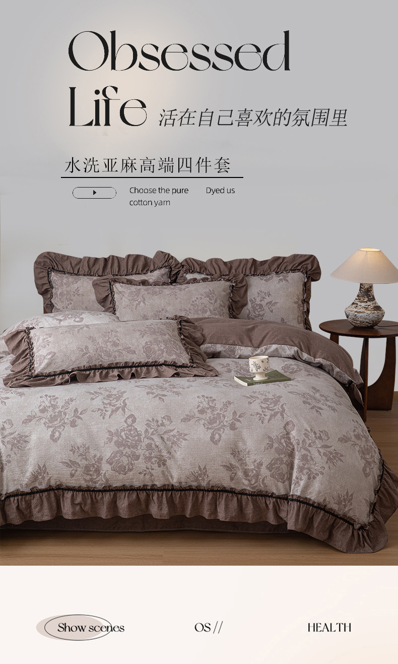当前位置: 91家纺网 > 商品网购 > 床品套件 > 四件套 > 化纤普通四件套 > 芯贝儿 2025新款加厚原麻复古风亚麻皱皱双层纱水洗m花边四件套 水木年华