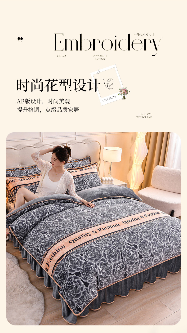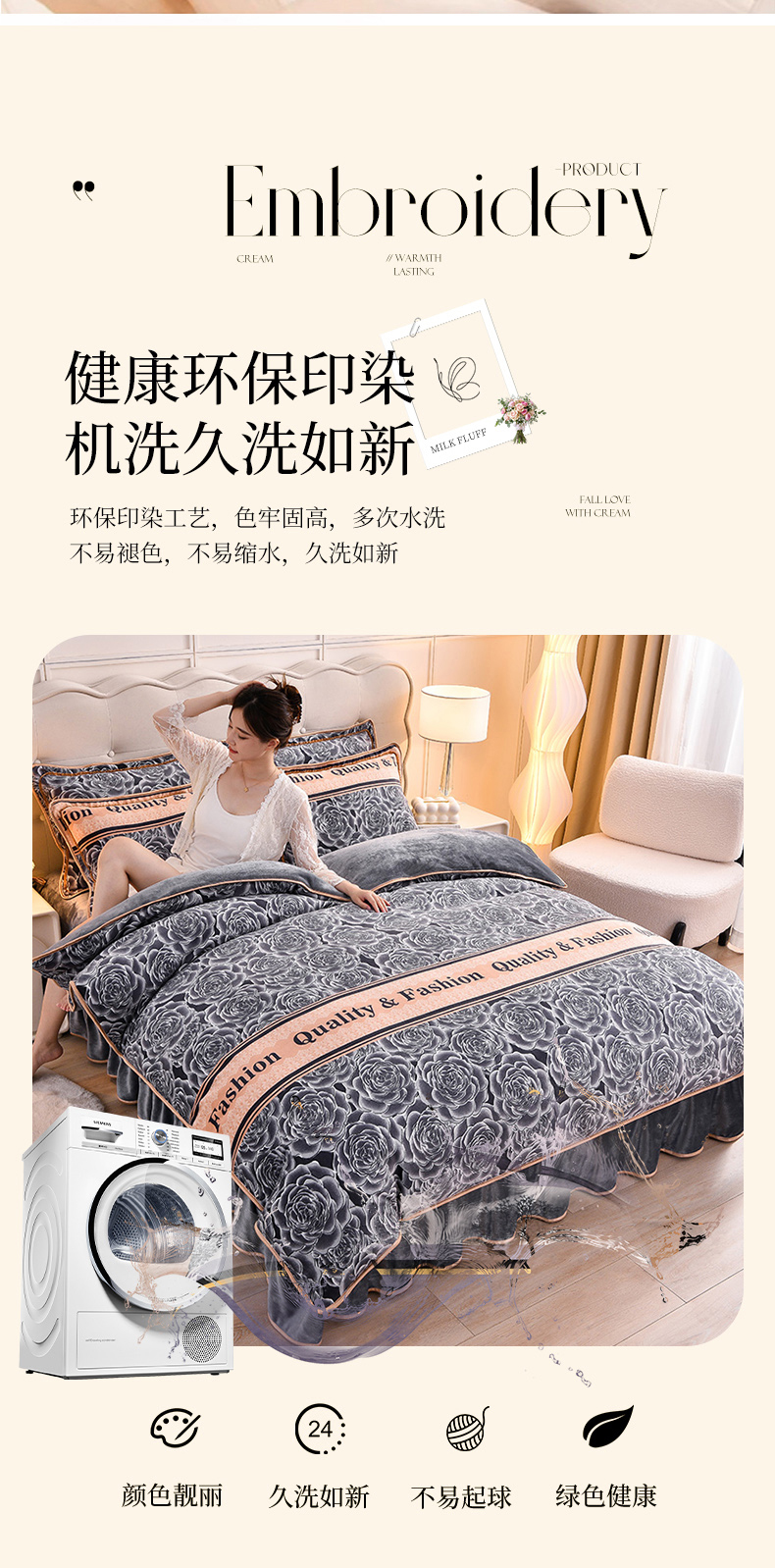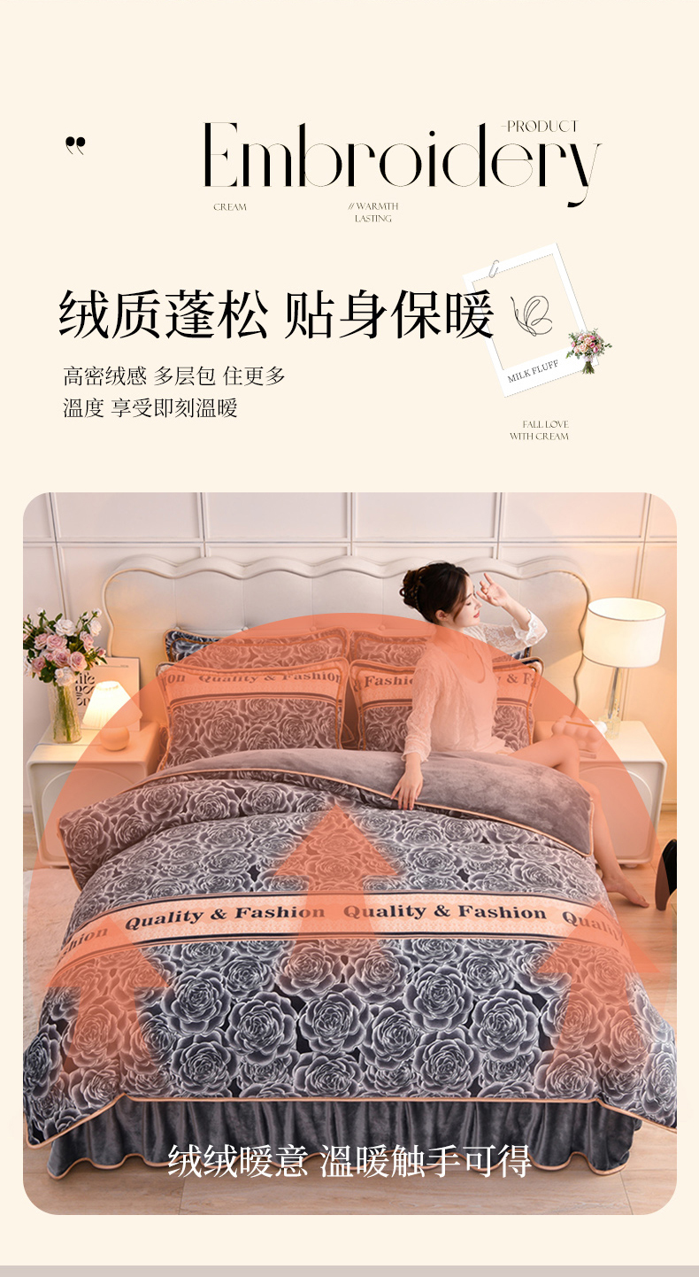 当前位置: 91家纺网 > 商品网购 > 床品套件 > 四件套 > 牛奶绒四件套 > 绒宴 2025新款8.5斤牛奶绒金貂法莱绒床裙款保暖四件套 流金岁月