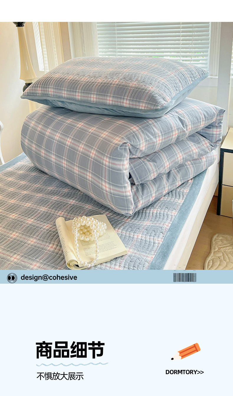 • 91家纺网 家纺一手货源 找家纺 乐野家居 2025新款开学季 A类全棉水洗棉+宝宝绒学生床盖三件套(多功能被套) 蓝大格