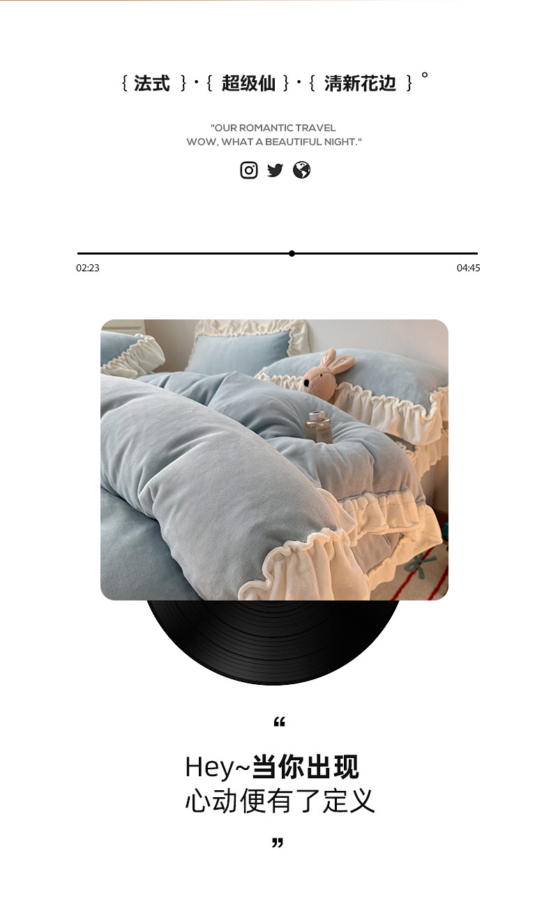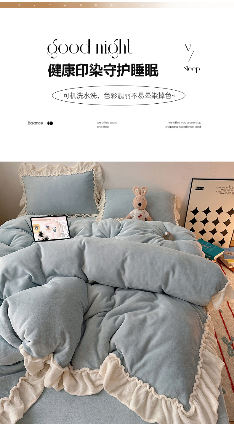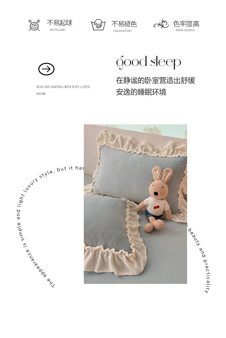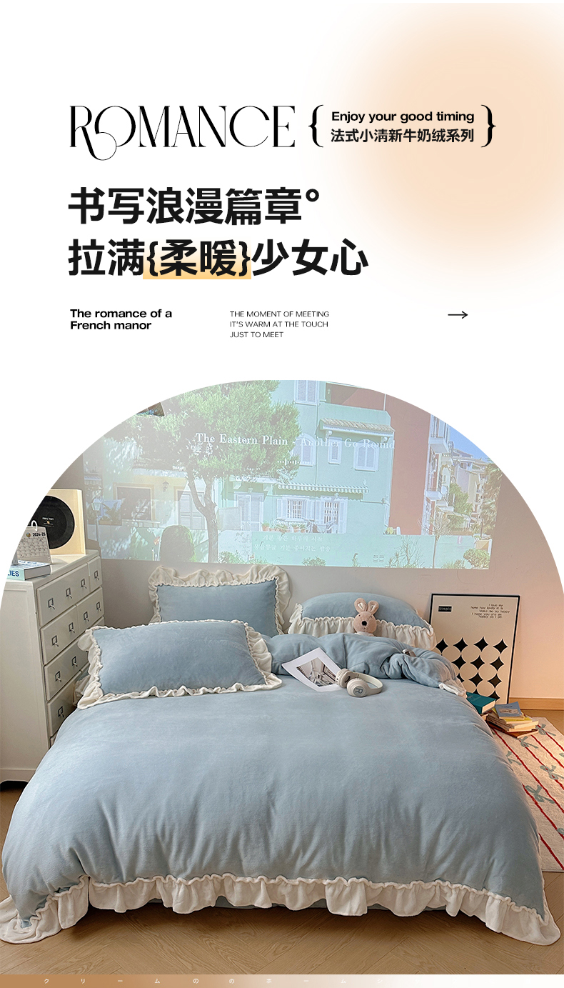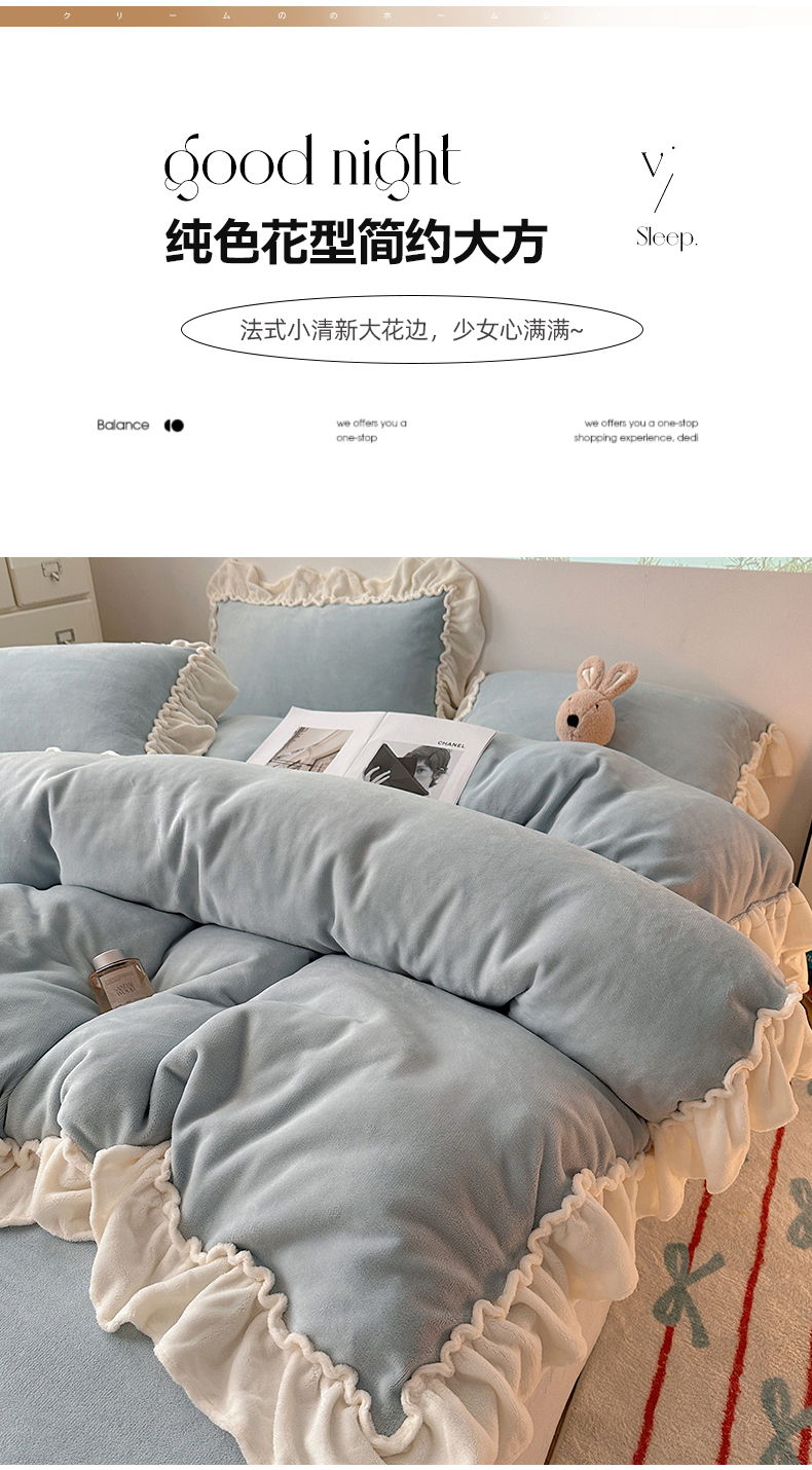 当前位置: 91家纺网 > 商品网购 > 床品套件 > 四件套 > 牛奶绒四件套 > 六巷胡同 2025新款A类法式小清新纯色牛奶绒花边款四件套 花边款-淡天蓝