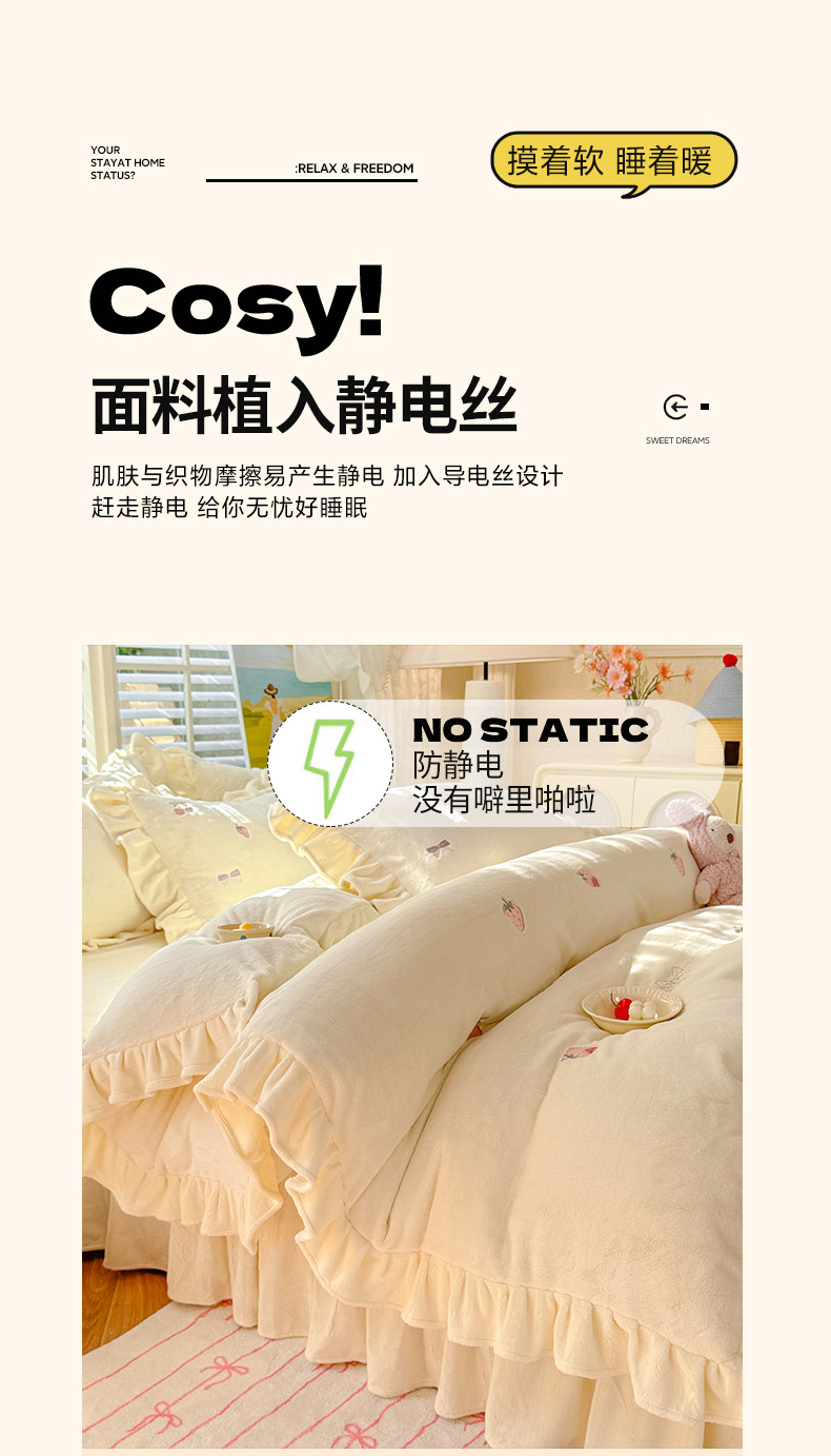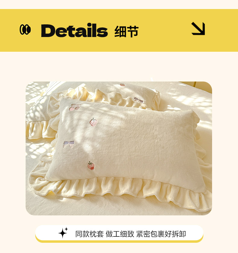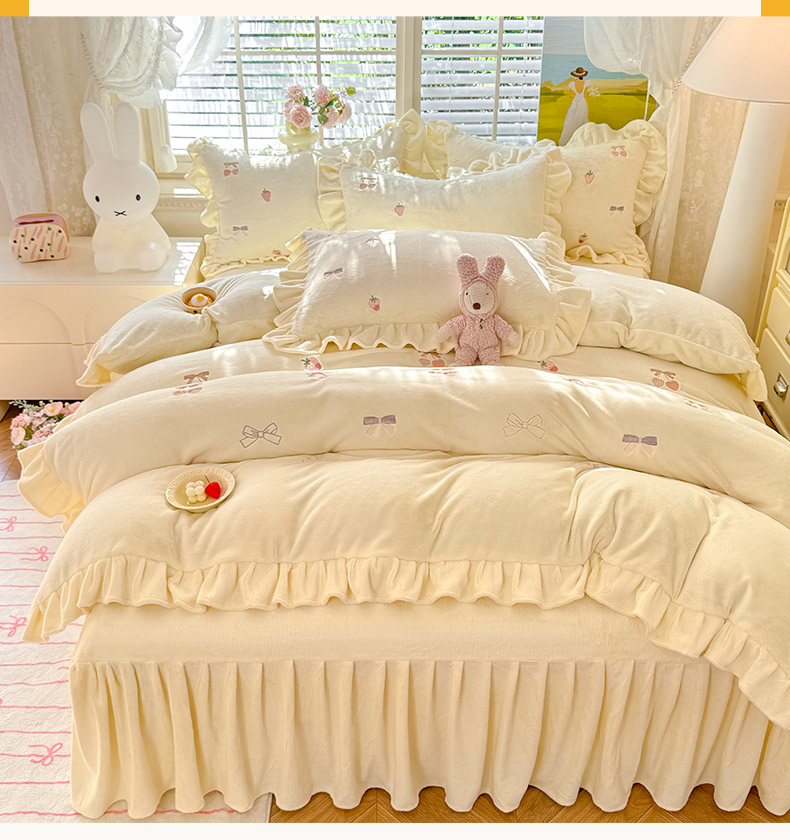 商品名称:绒世界 2025新款加厚牛奶绒刺绣床裙款四件套 草莓-薰衣紫