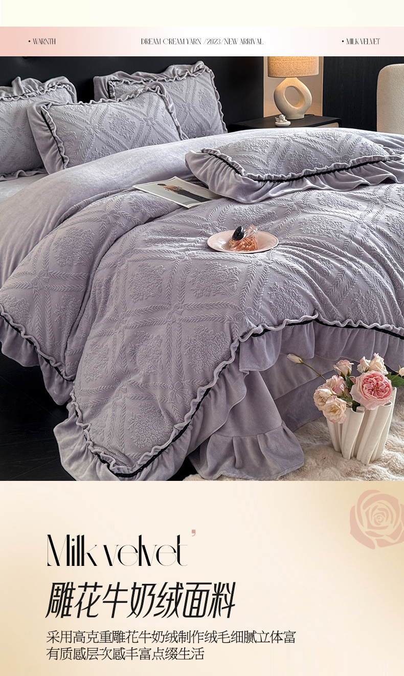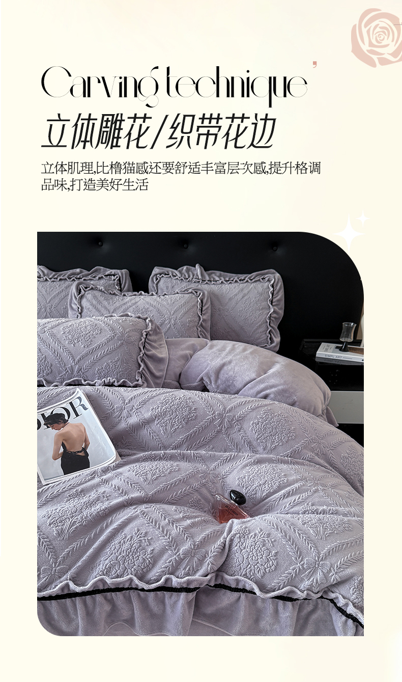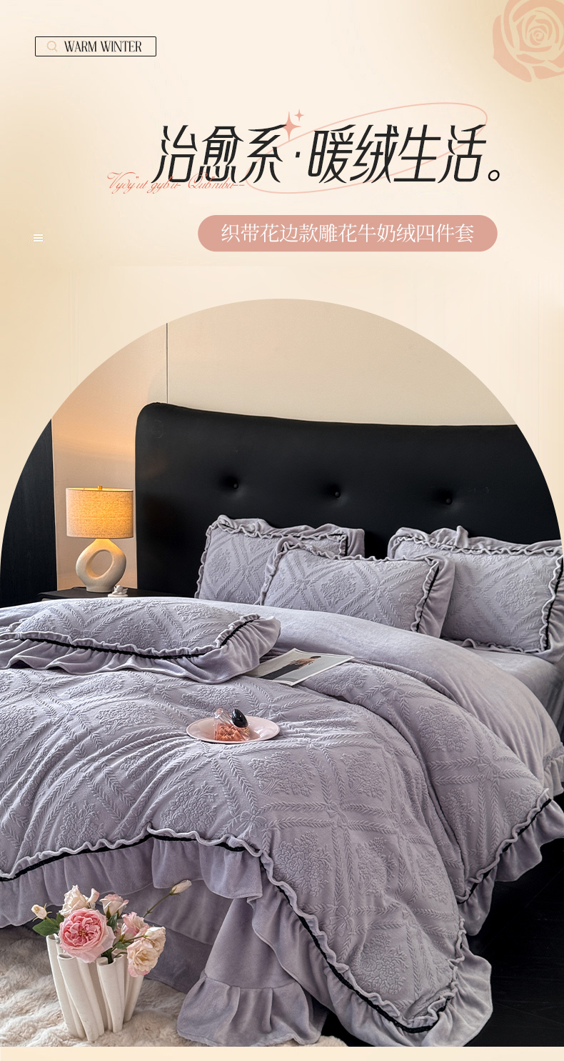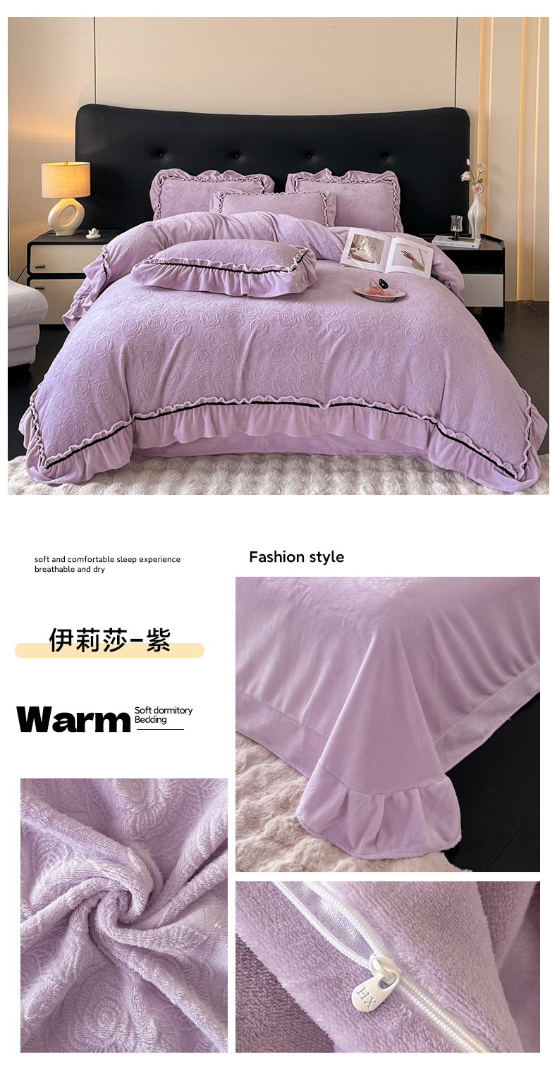 绘萱家居 2025新款新品爆款高密消光织带花边款雕花牛奶绒四件套 眷恋-紫