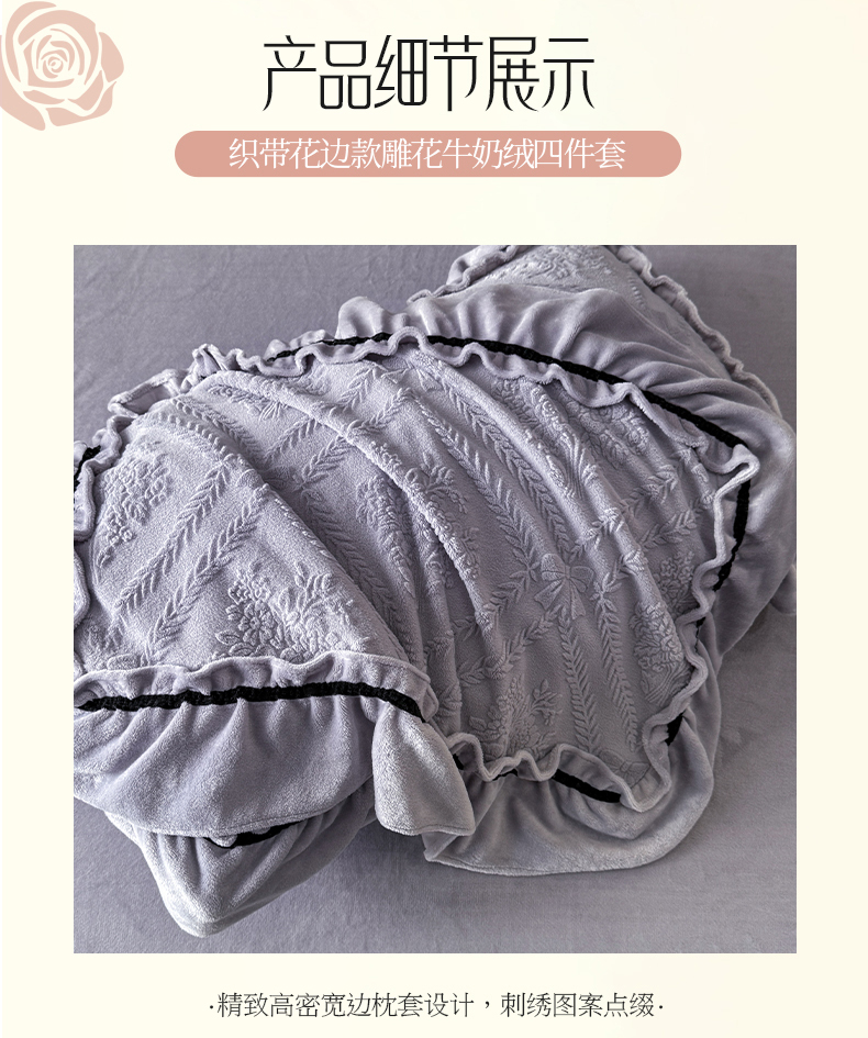 (总)绘萱家居 2025新款新品爆款高密消光织带花边款雕花牛奶绒四件套,艾薇儿-白卡其,薇薇安-粉,妮娜-绿,眷恋-粉,艾薇儿-紫,薇薇安-兰,薇薇安-紫,眷恋-兰,眷恋-白卡其,艾薇儿-兰,香蝶-白卡其,眷恋-紫,艾薇儿-粉,薇薇安-白卡其,妮娜-粉,薇薇安-绿,香蝶-粉,香蝶-兰,香蝶-紫,伊莉莎-粉,伊莉莎-紫