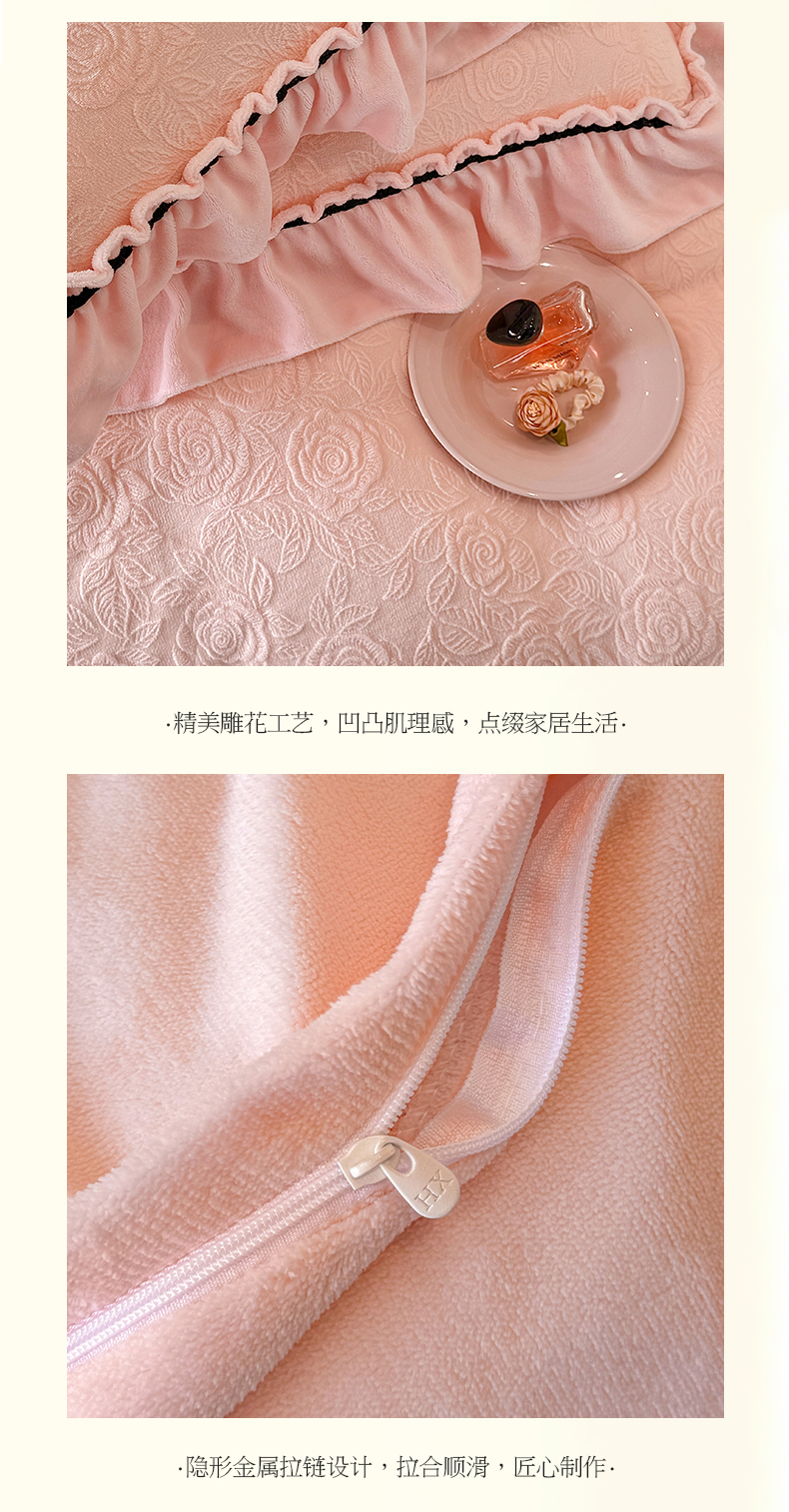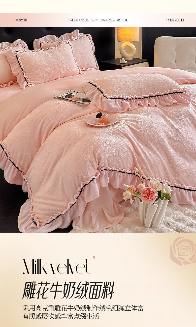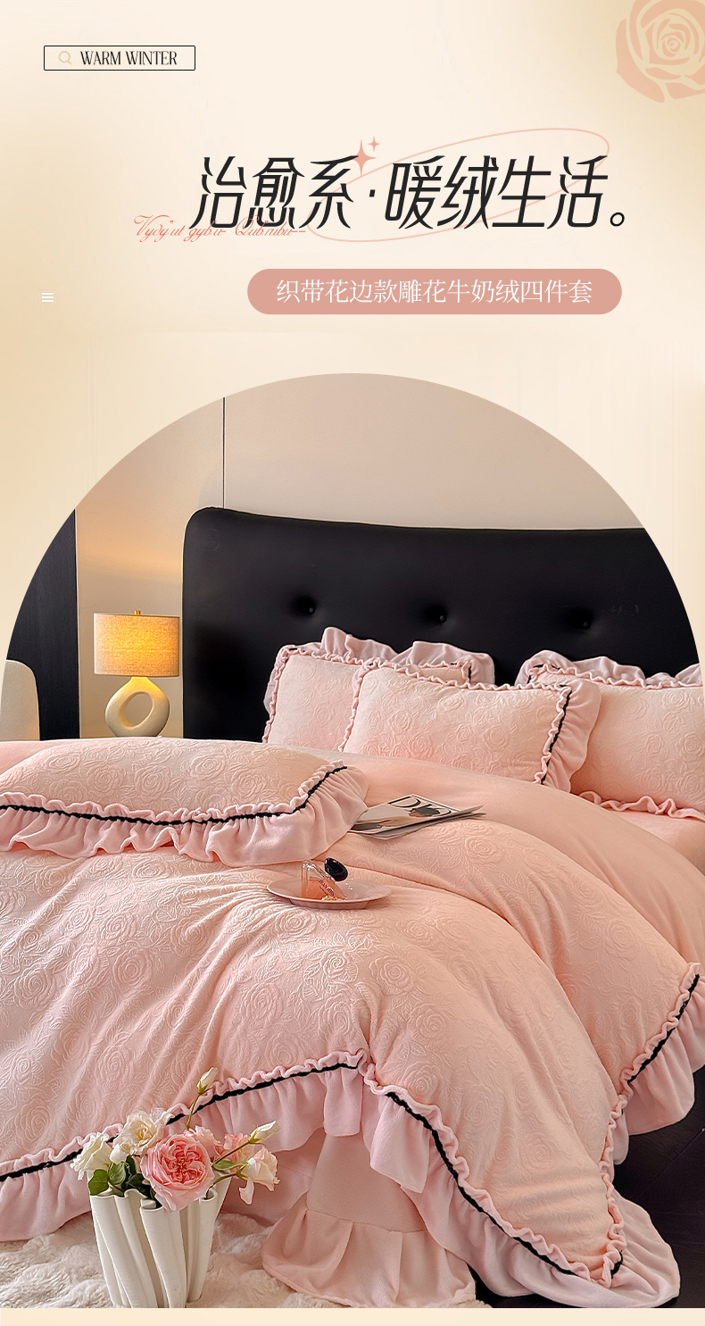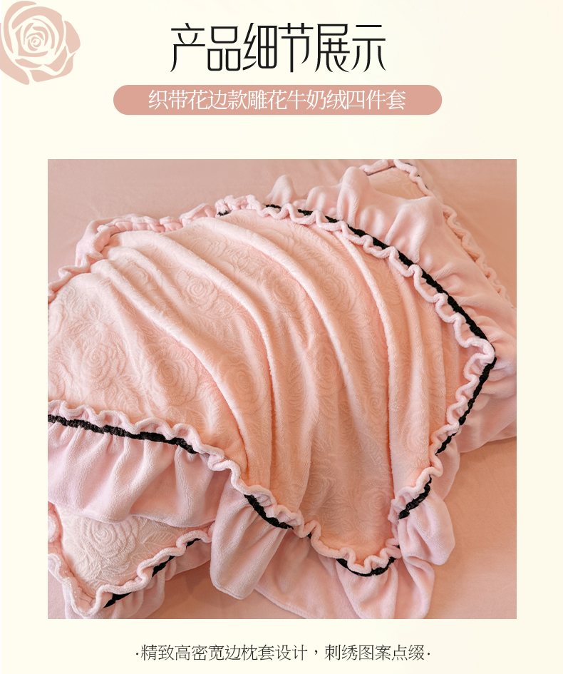 绘萱家居 2025新款新品爆款高密消光织带花边款雕花牛奶绒四件套 伊莉莎-粉