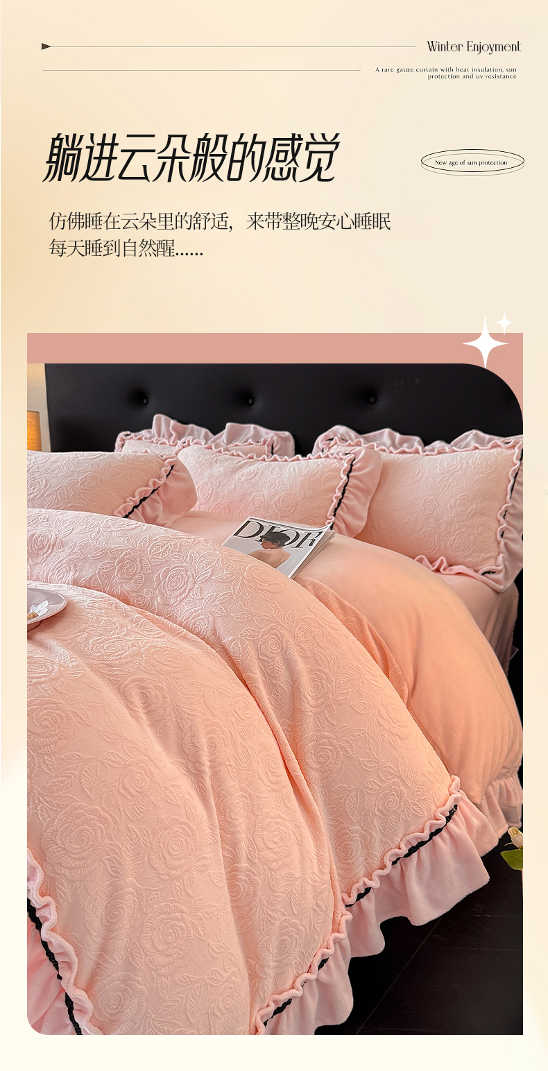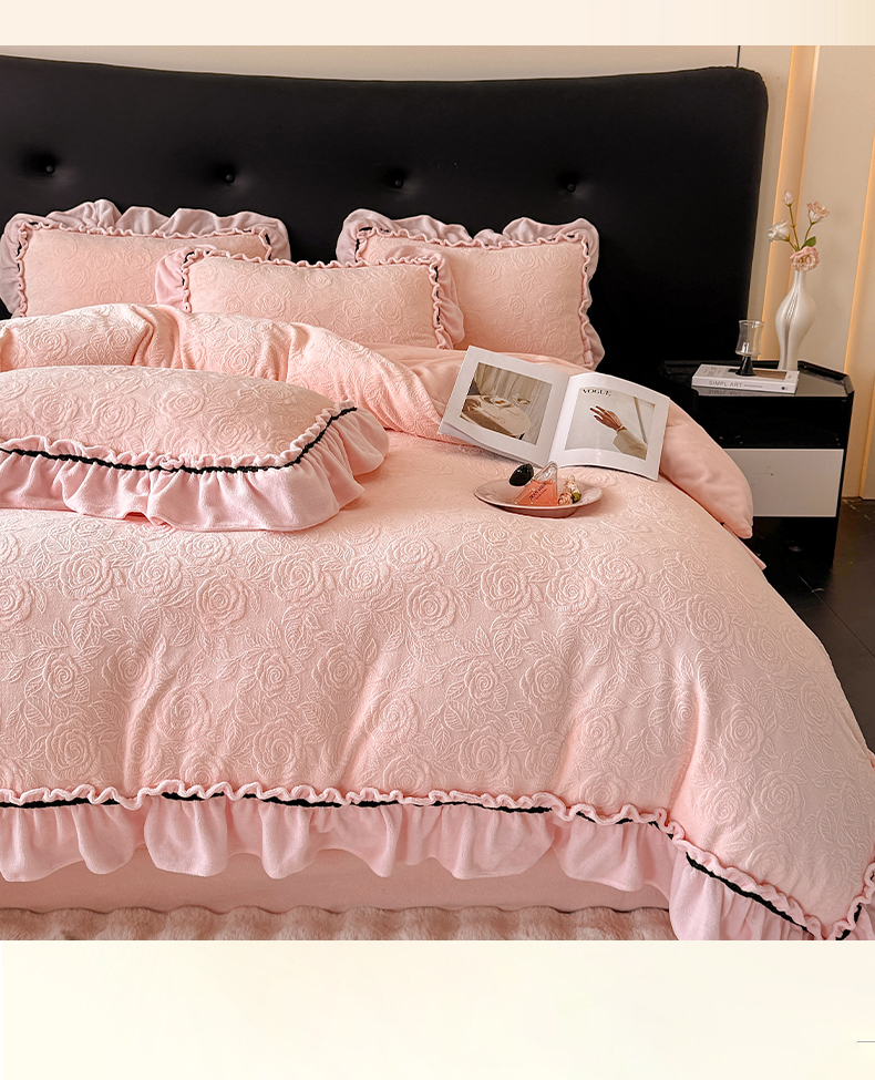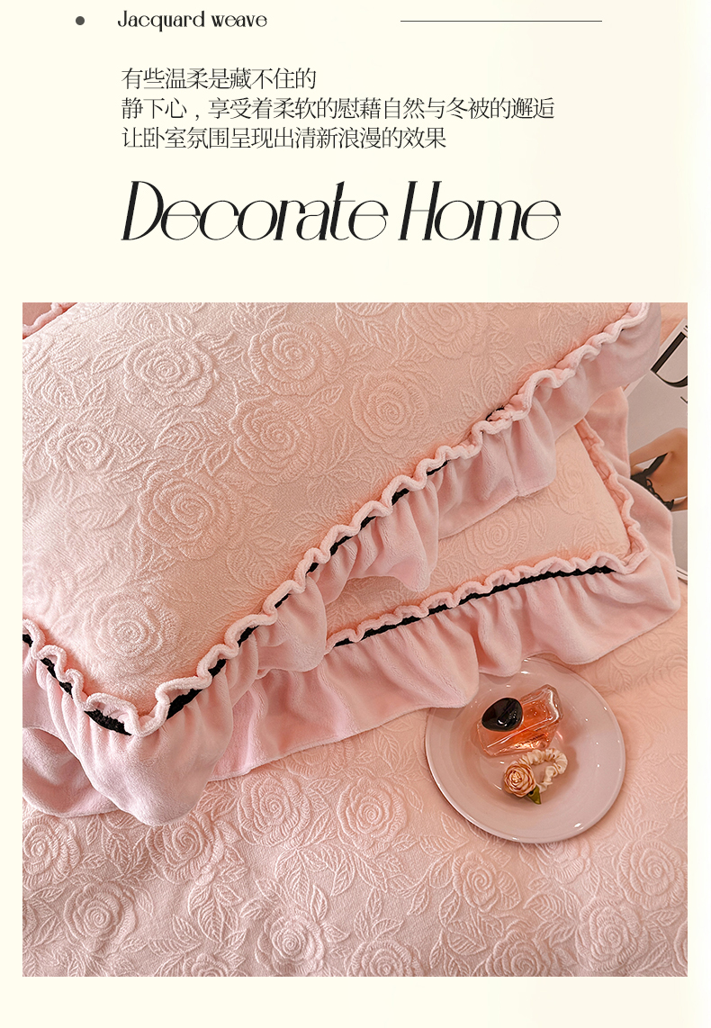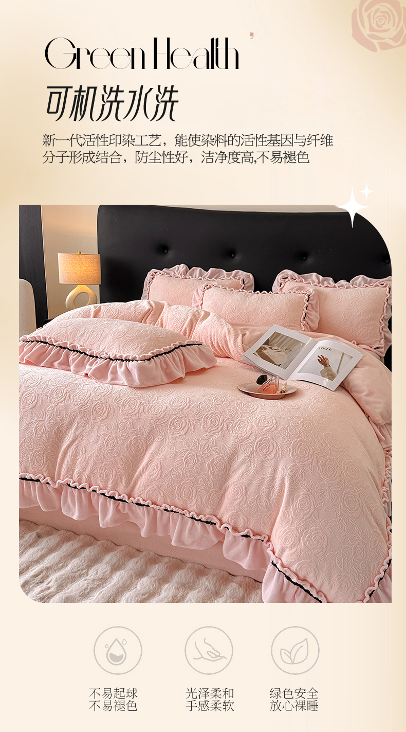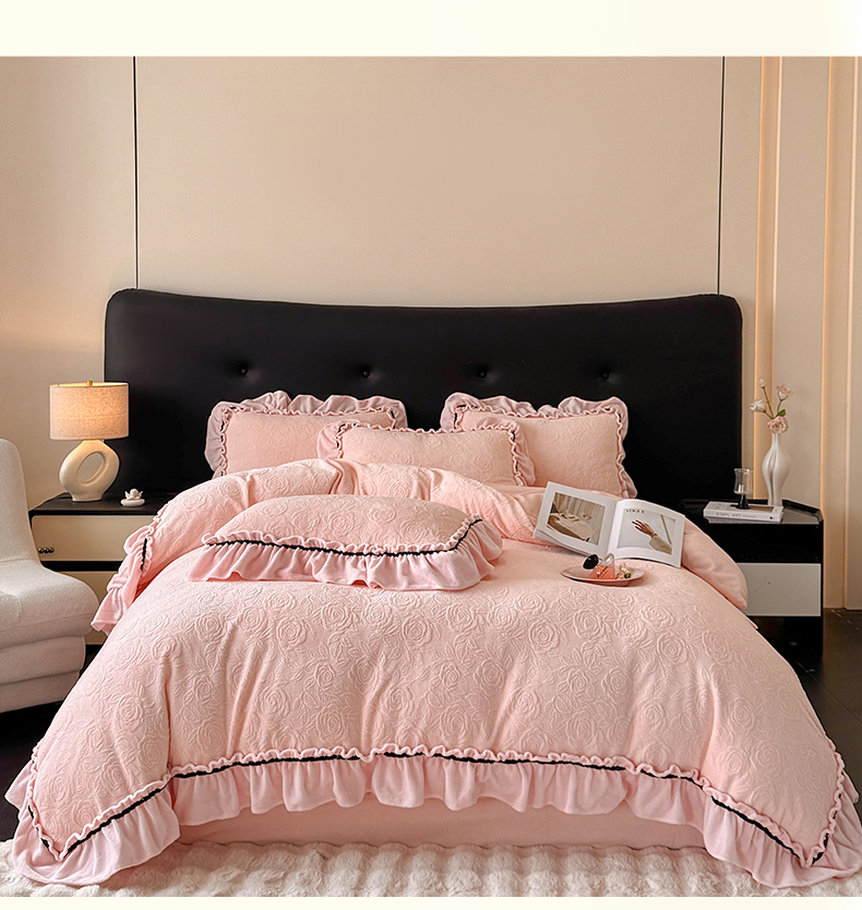 绘萱家居 2025新款新品爆款高密消光织带花边款雕花牛奶绒四件套 伊莉莎-粉