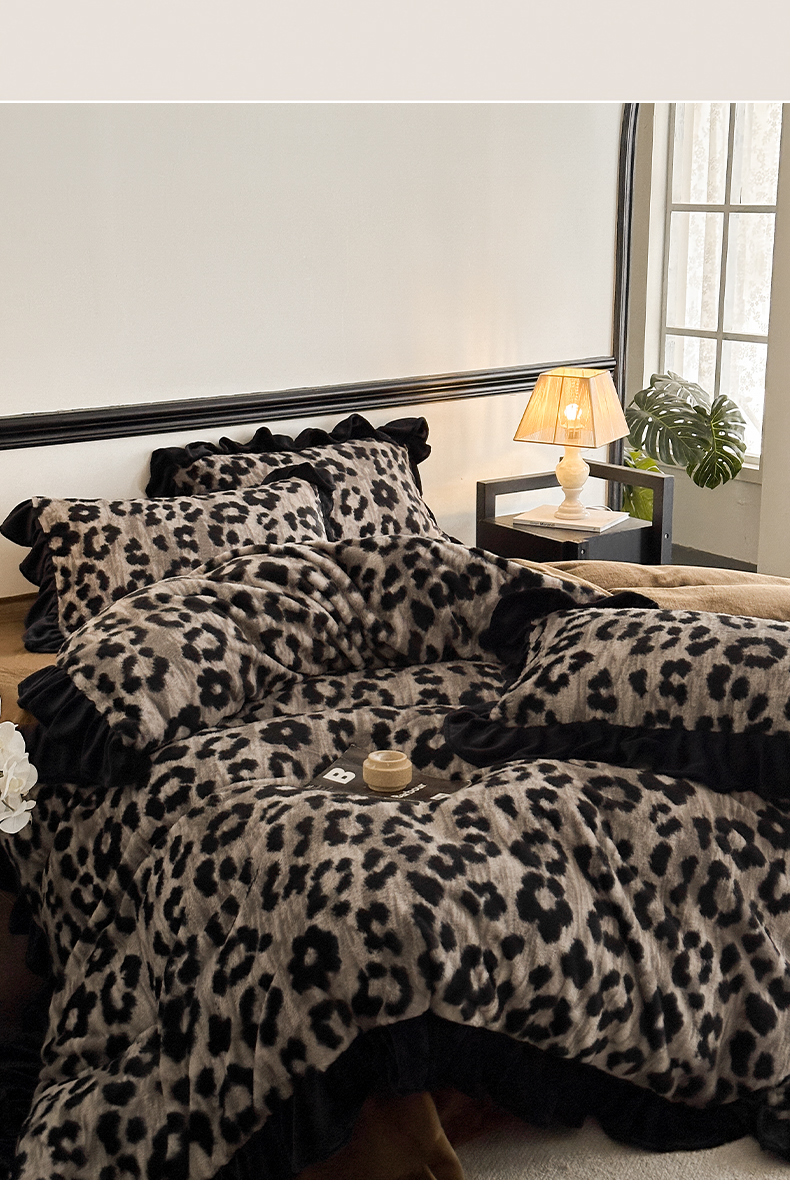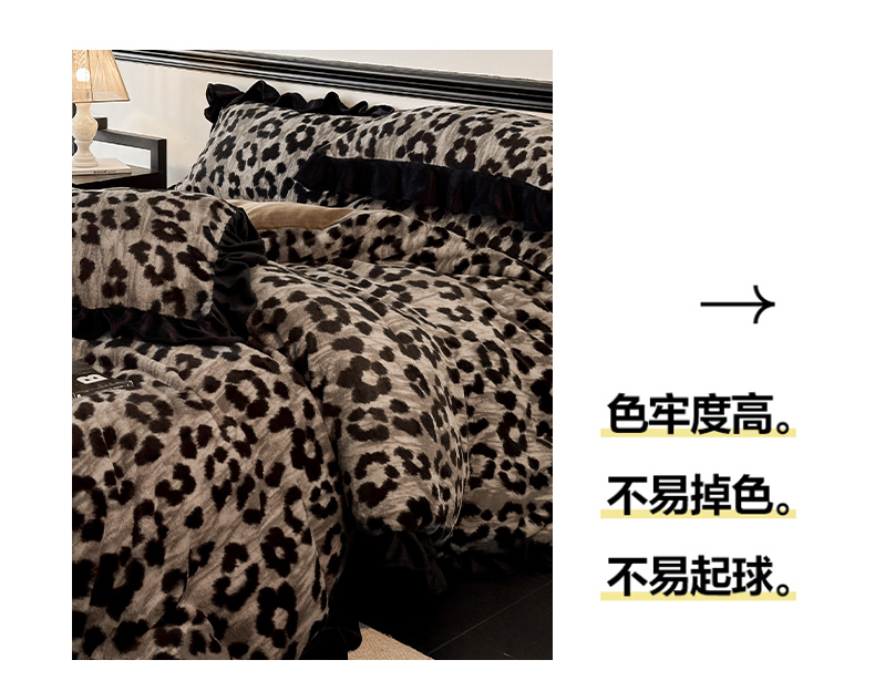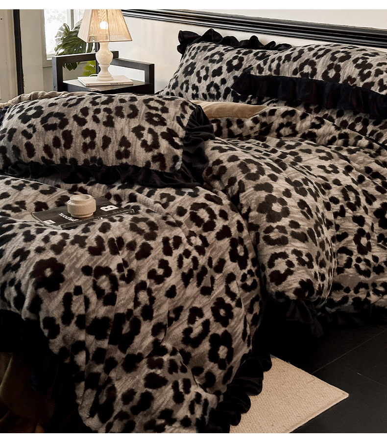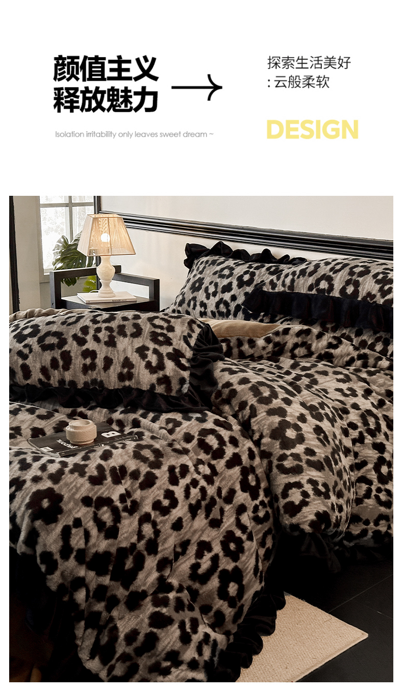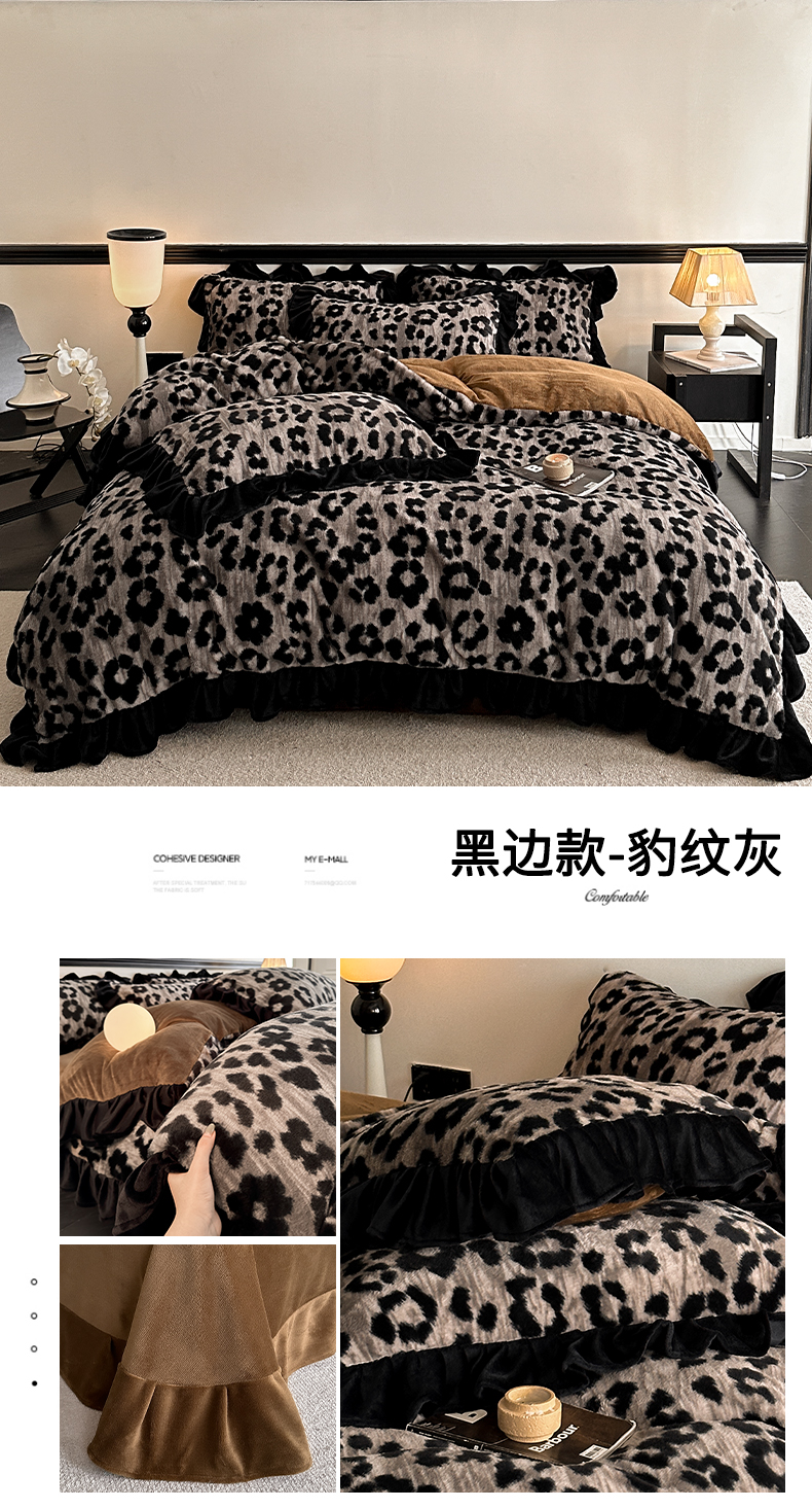 当前位置: 91家纺网 > 商品网购 > 床品套件 > 四件套 > 牛奶绒四件套 > 子曰 2025新款A类法式小香风黑边款兔绒牛奶绒四件套 黑边款-豹纹灰