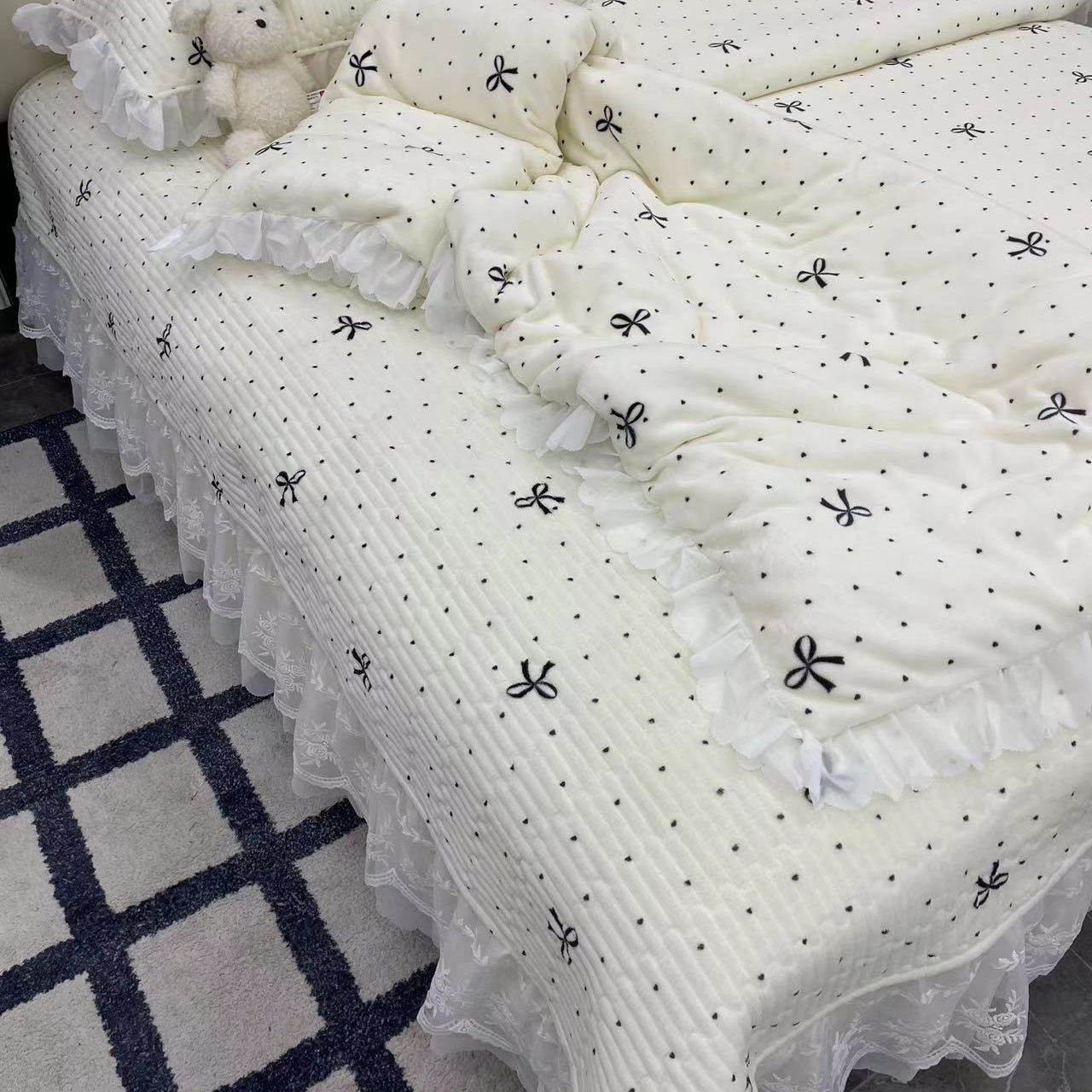 (总)禧瑞谷 2025新款冬季牛奶绒双层蕾丝花边床盖三件套床盖四件套,点点蝴蝶结,粉底小狗,蓝底小狗,奶油小狗,星月小确幸,KT猫,蝶舞白色,蓝底爱心,洛丽塔蓝,碎花小女孩,波点,草莓蝴蝶结,蓝色蝴蝶结,奶糖少女,蛋糕猫