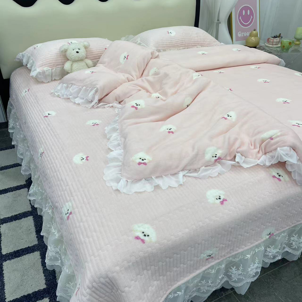 商品名称:禧瑞谷 2025新款冬季牛奶绒双层蕾丝花边床盖三件套床盖四件套 奶油小狗
