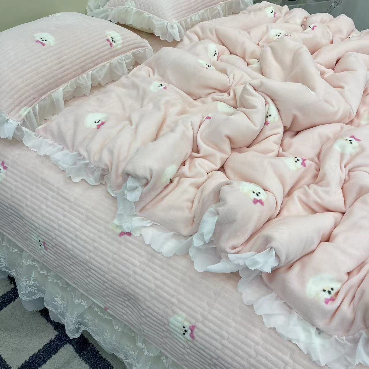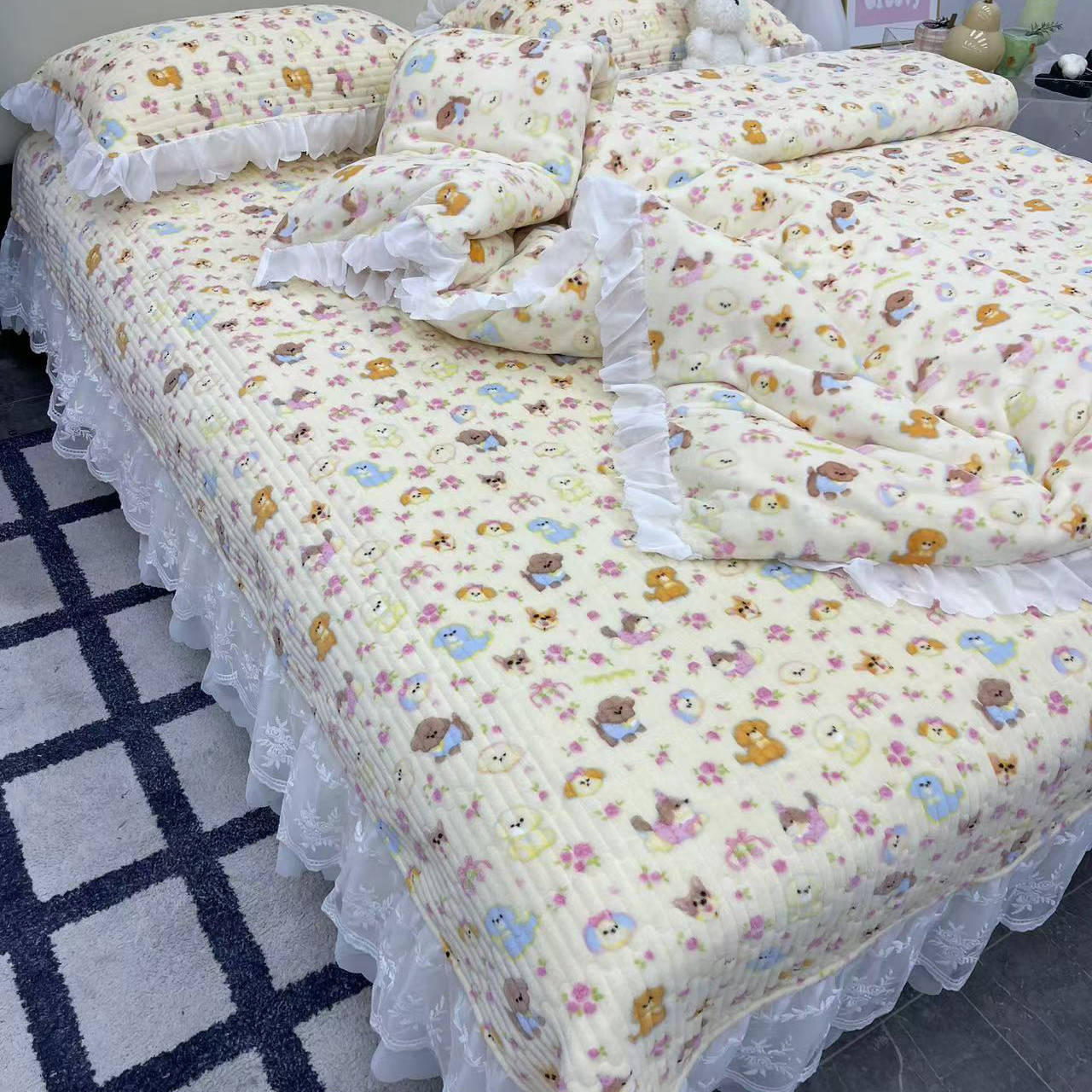 禧瑞谷 2025新款冬季牛奶绒双层蕾丝花边床盖三件套床盖四件套 奶油小狗