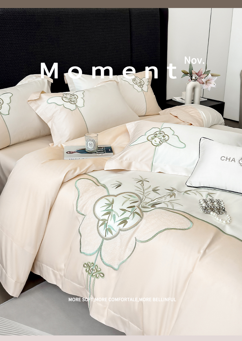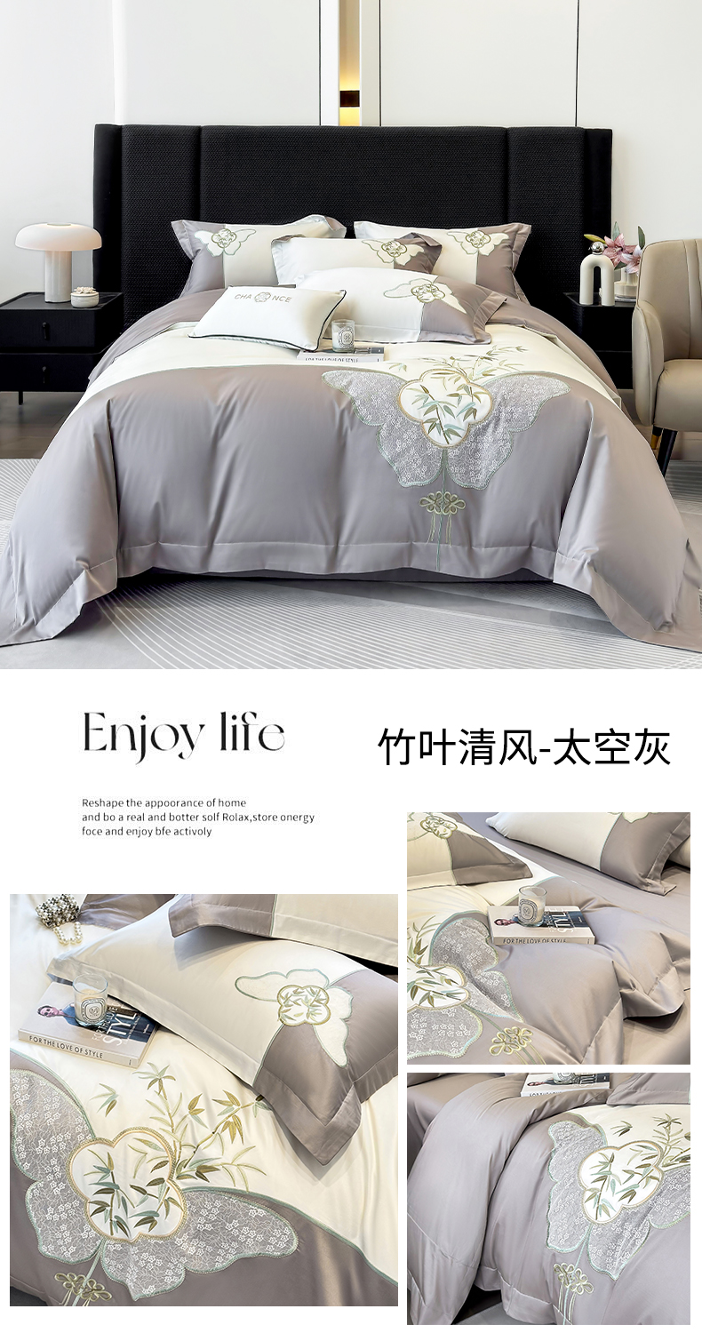 丞音 新中式轻奢风A类长绒棉50s双股100支贡缎绣花全棉被套刺绣纯棉四件套床笠高档礼盒包装 竹叶清风-玫瑰金