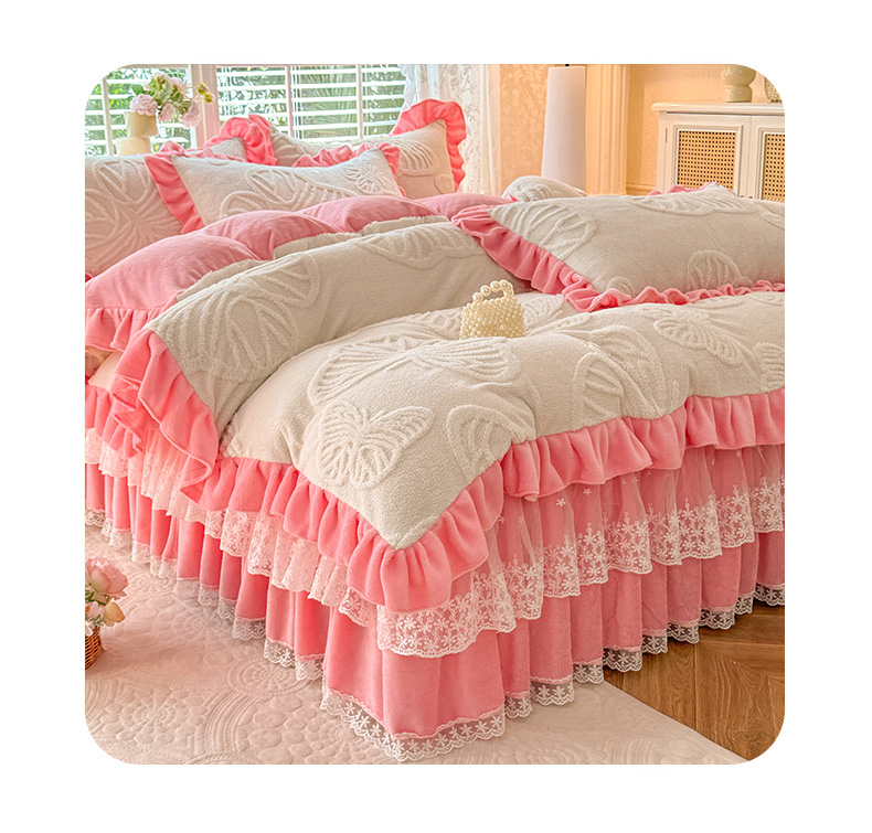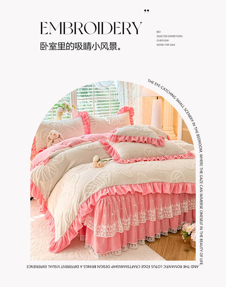 后庭寝室 2025新款牛奶绒床裙四件套-蝶舞翩翩系列 蝶舞翩翩-白粉玉