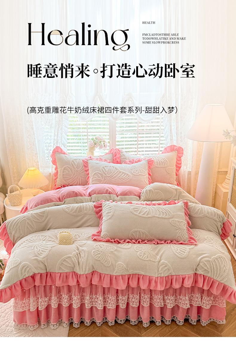 (总)后庭寝室 2025新款牛奶绒花边床裙四件套-浪漫花语系列,浪漫花语-暖黄,浪漫花语-公主玉,浪漫花语-梦幻紫,浪漫花语-暖粉玉,浪漫花语-少女粉,浪漫花语-天空蓝