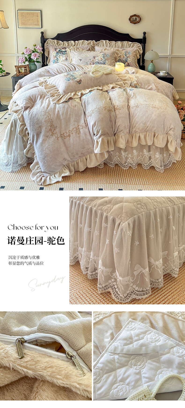 商品名称:宜凡家纺 2025新款牛奶绒5D数码大板印花床裙四件套 诺曼庄园 驼色